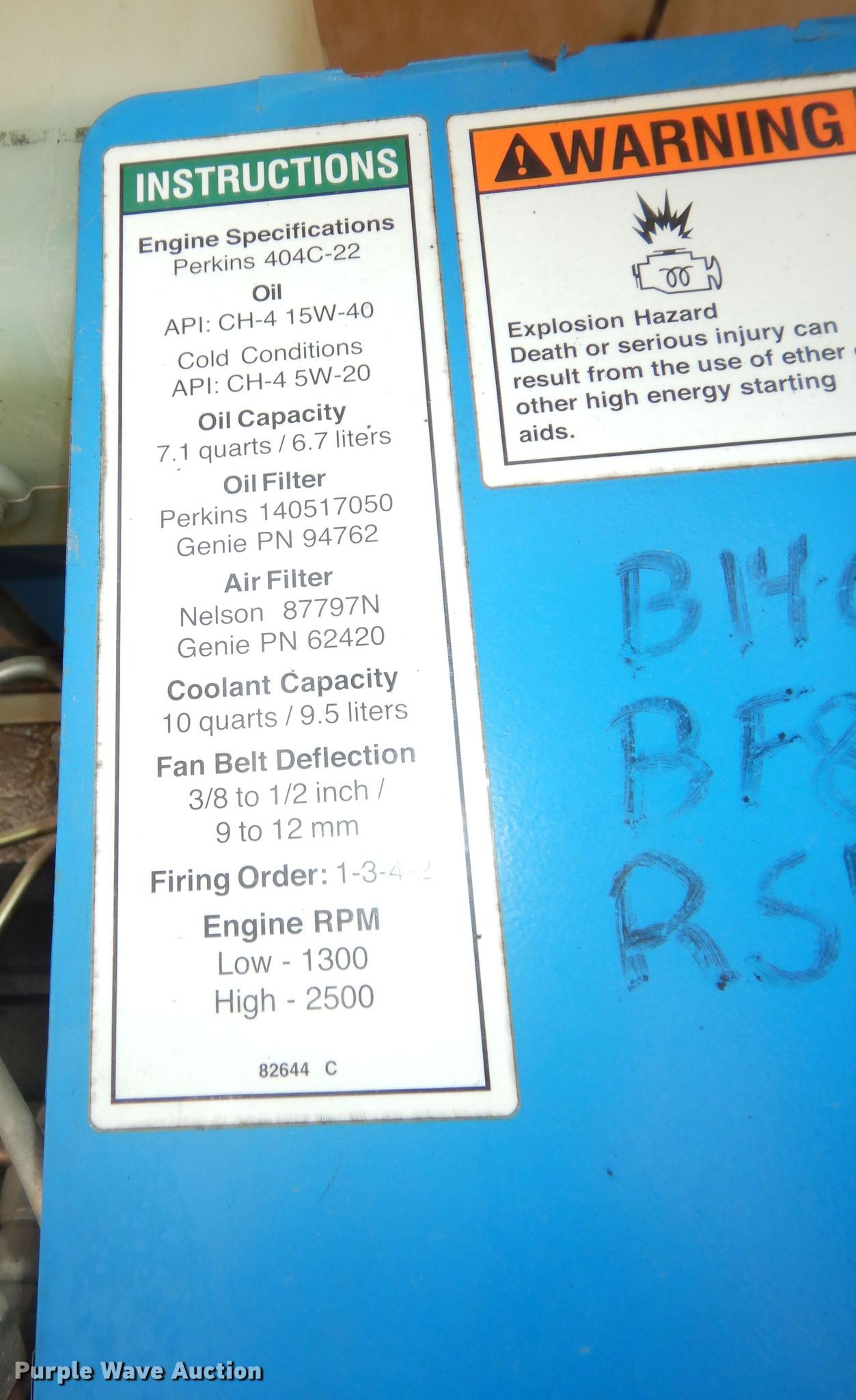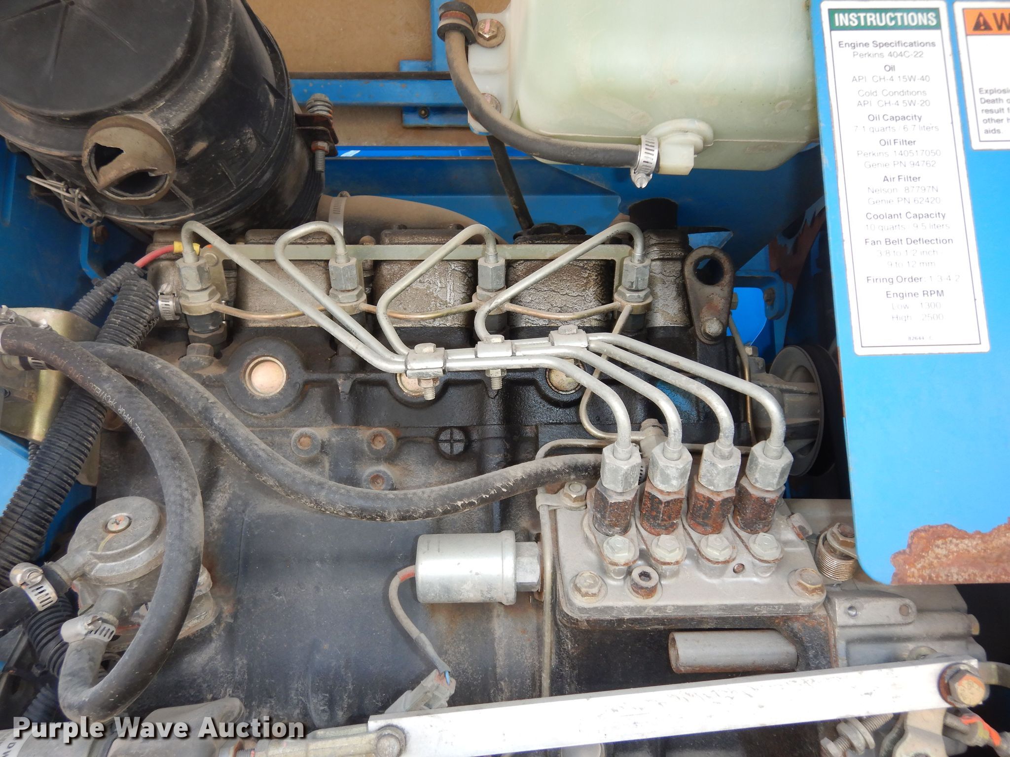 2007 Genie Z60/34 boom lift. Hours: 862 on meter, Serial: Z6007-7525, Unit #: 4110. Engine Perkins, Cylinders: 4, Fuel type: Diesel, HP: 50, kW: 37.3. Chassis Four wheel drive. Features Articulating boom, Maximum lift capacity: 500 lbs, Maximum reach length: 34', Maximum lift height: 60', Hydraulic extendable jib, Hydraulic leveling, Platform: 93" L x 33" W, Controls: Platform, Ground, Platform rotation: Hydraulic. Tires Tire size: 385/65D19.5. Topeka, KS 66616