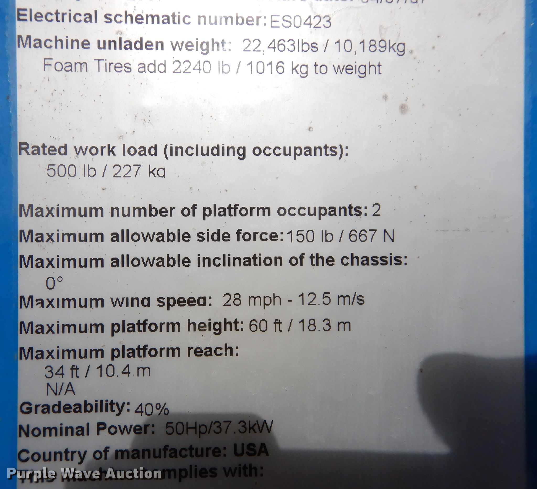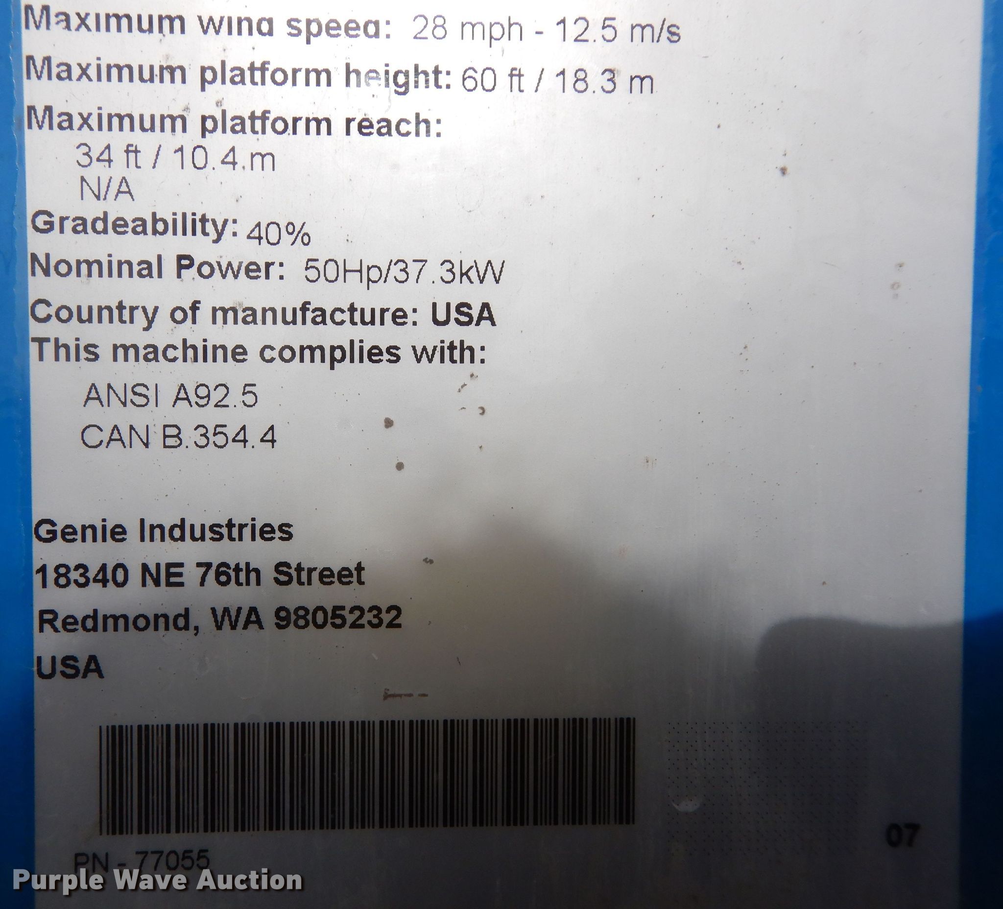 Purple Wave is selling a used Boom Lift in Kansas. This item is a 2007 Genie Z60/34 boom lift with the following: Hours: 862 on meter, Serial: Z6007-7525, Unit #: 4110