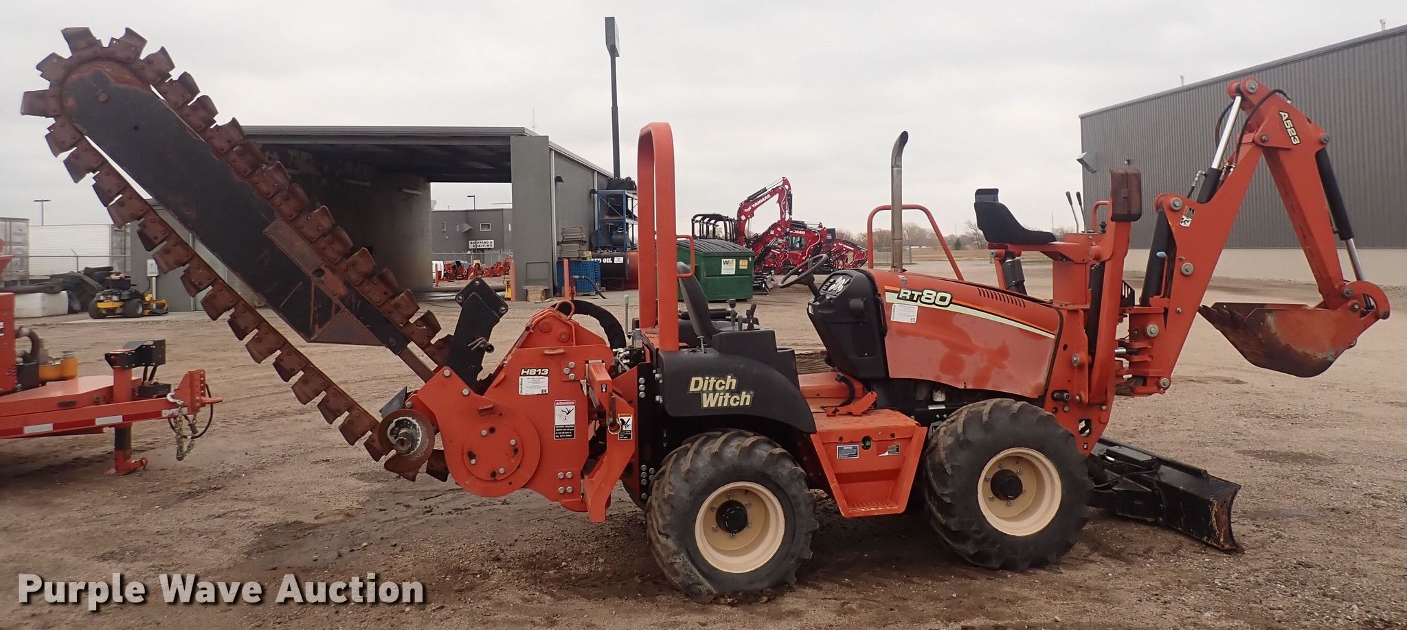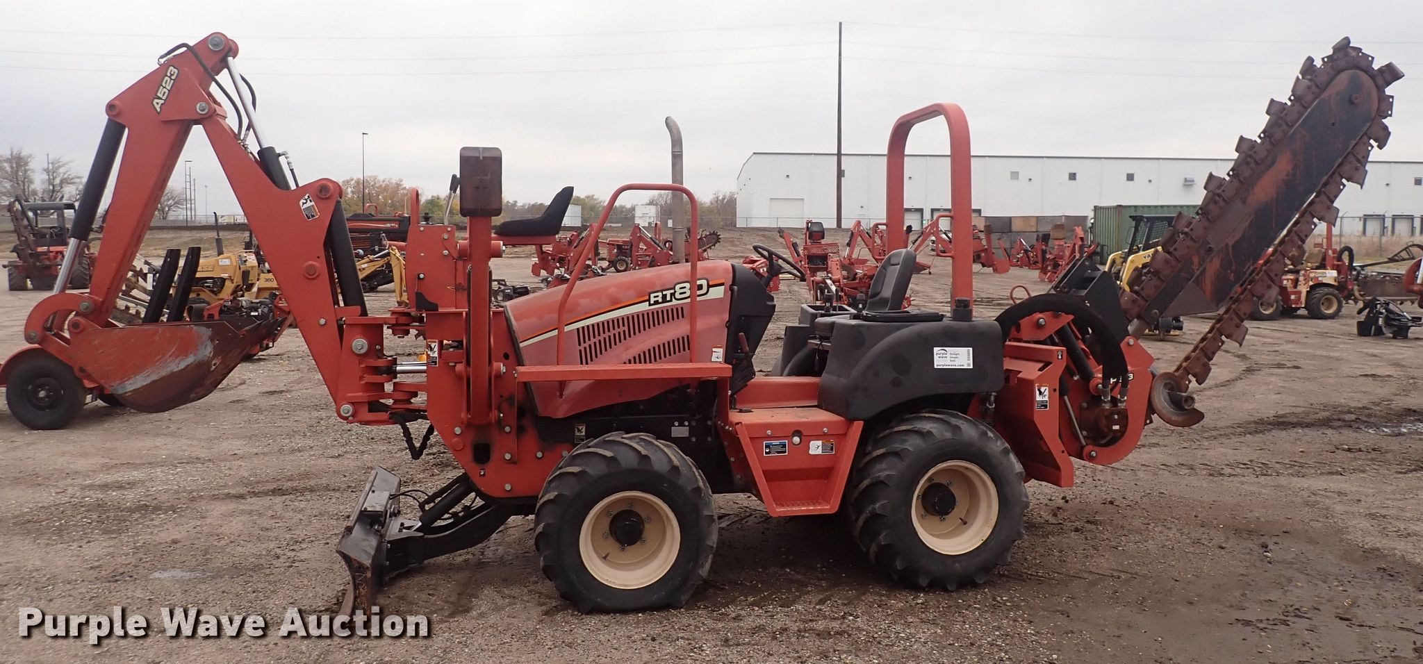 2010 Ditch Witch RT80 trencher. Hours: 1,691 on meter, Serial: CMWRT80XHA0000032, Unit #: 6. Engine Cylinders: 4, Fuel type: Diesel. Transmission Hydrostatic, Four wheel drive, Differential lock, Four wheel steer. Features Trencher Model: H813, Serial: CMWH813XEA0000033, Estimated dig depth: 96", Cutting width: 6", Side shift, Teeth: Dirt, Backhoe Model: A523, Serial: CMWA523XPA0000313, Bucket width: 18", Backfill blade Width: 72". Tires Size: 35x19.00-16.1. Notes Electrical/control issues. Ditch Witch UnderCon. Park City, KS 67219