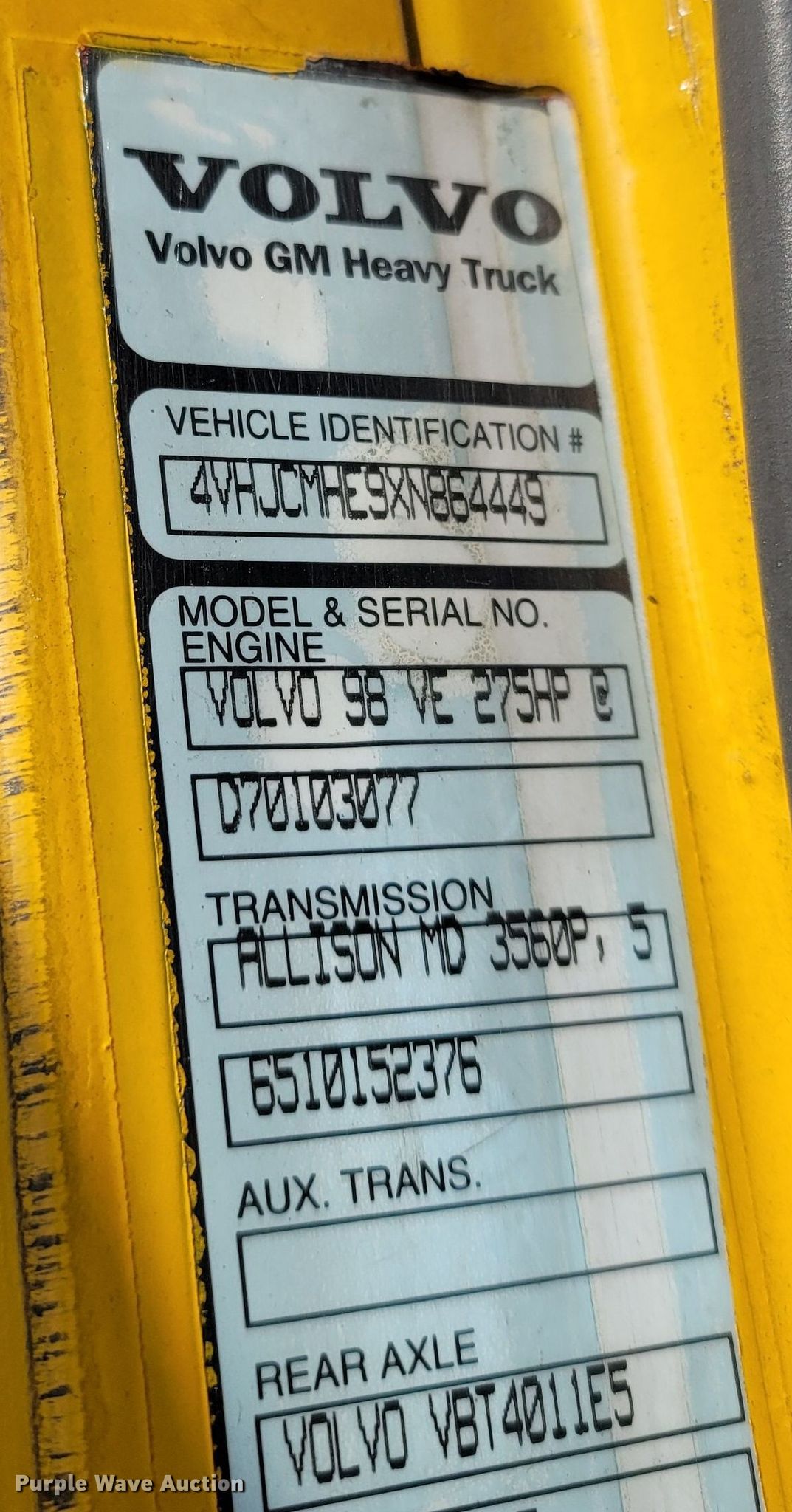 1999 Volvo WG dump truck. Miles: 465,934 on odometer, VIN: 4VHJCMHE9XN864449. Engine Displacement: 6.7L, Cylinders: 6, Fuel type: Diesel. Transmission Automatic. Chassis Axles: Triple, Pusher axle, Differential lock: Full, Suspension: Spring over walking beam, Brakes: Air, PTO. Interior AC, Heat, Cruise control, Brake controller. Features Dump bed 18' 3" L x 96" W, Side height: Front: 67", Rear: 47", Bed type: Steel, Bed vibrator, Roll tarp, Ram: Single , End gate: Air operated. Tires Size: 11R22.5. Notes Windshield chipped or cracked. Missouri title. Title distribution may be delayed up to 14 days from verification of funds. Ethan Bryer Asphalt Paving and Sealcoating. 266 Riverdale Road. Ozark, MO 65721