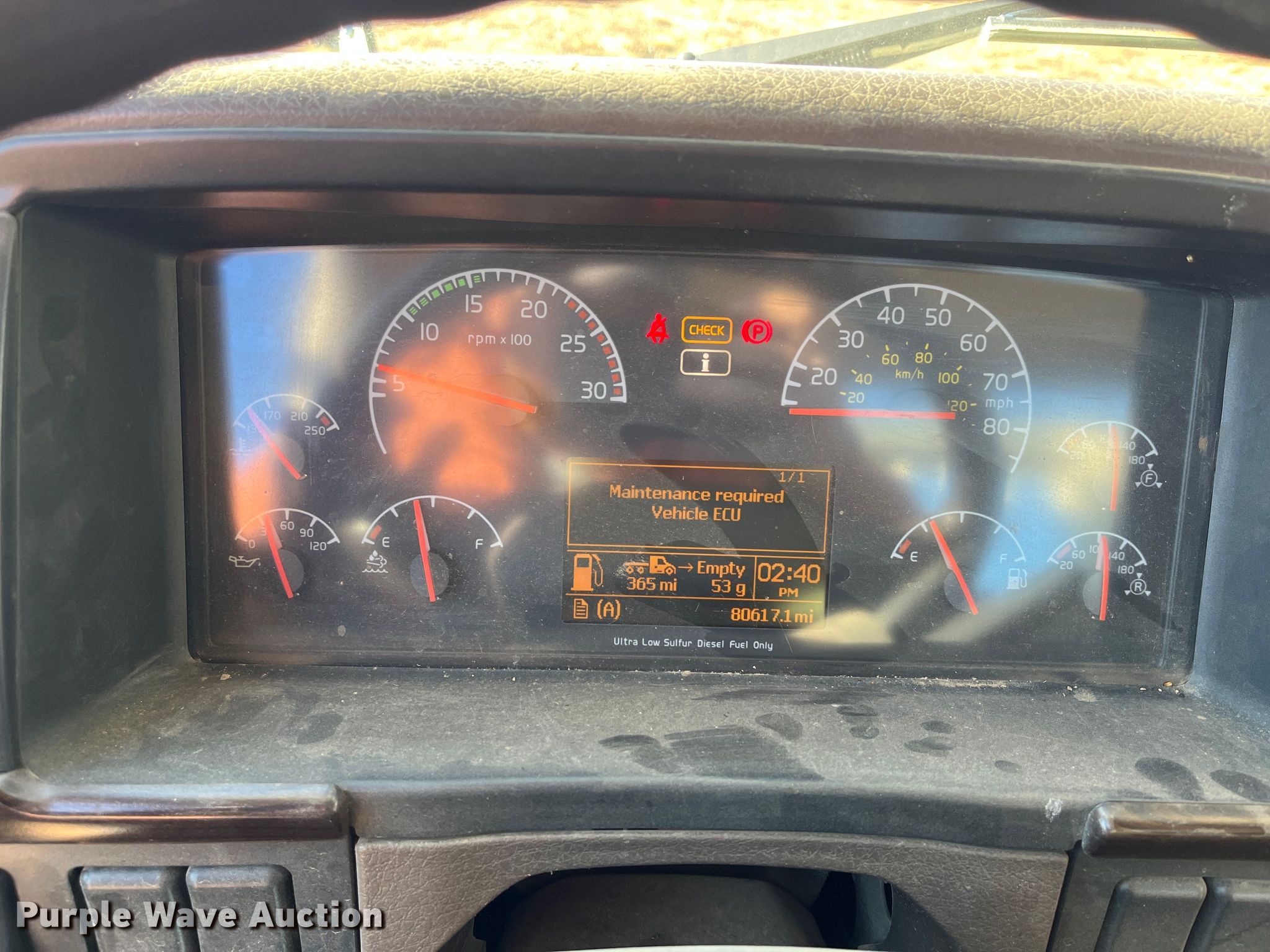 2014 Volvo VNL semi truck. Miles: 80,617 on odometer, VIN: 4V4NC9EH3EN167600. Engine Volvo D13, Displacement: 12.8L, Cylinders: 6, Fuel type: Diesel. Transmission Eaton Fuller, Manual, Speed: 10. Chassis Axles: Tandem, Differential lock: Inter-axle, Suspension: Air Dump valves, Brakes: Air, PTO, Wet kit, Truck chassis: 14' 9". Interior AC, Heat, Power windows, Power locks, Cruise control, Air ride cab. Features Deck plate: Aluminum, Fifth wheel type: Air operated, Sliding, Fuel tank: Dual. Tires Size: 11R22.5. Notes Dash warning indicator: Check engine. Kansas title. Vehicle has an E-Title in the State of Kansas. A paper title will be distributed to the buyer within 30 days from verification of funds. Vintage Greenmark Construction. 827 Maple Street. Lawrence, KS 66044