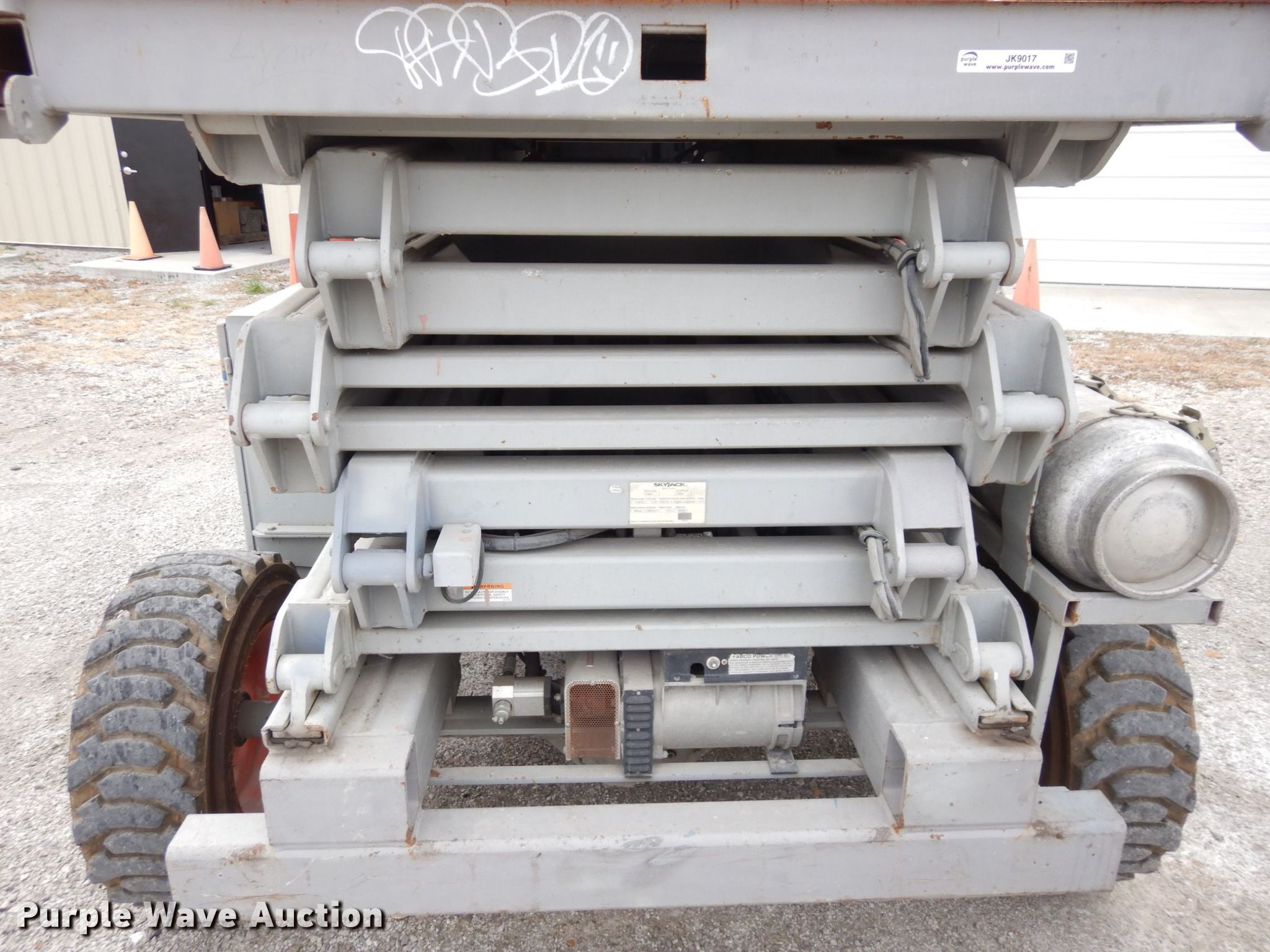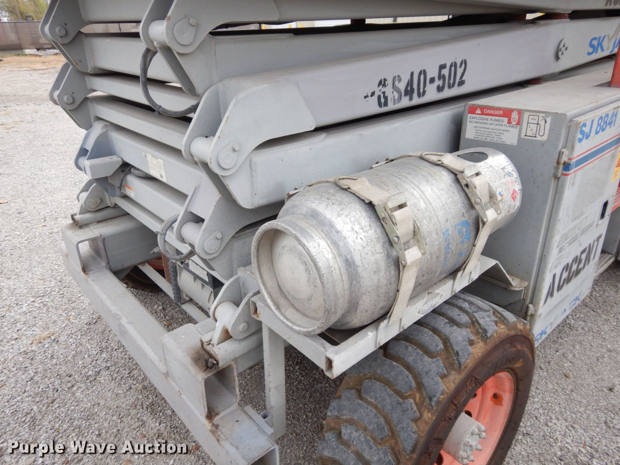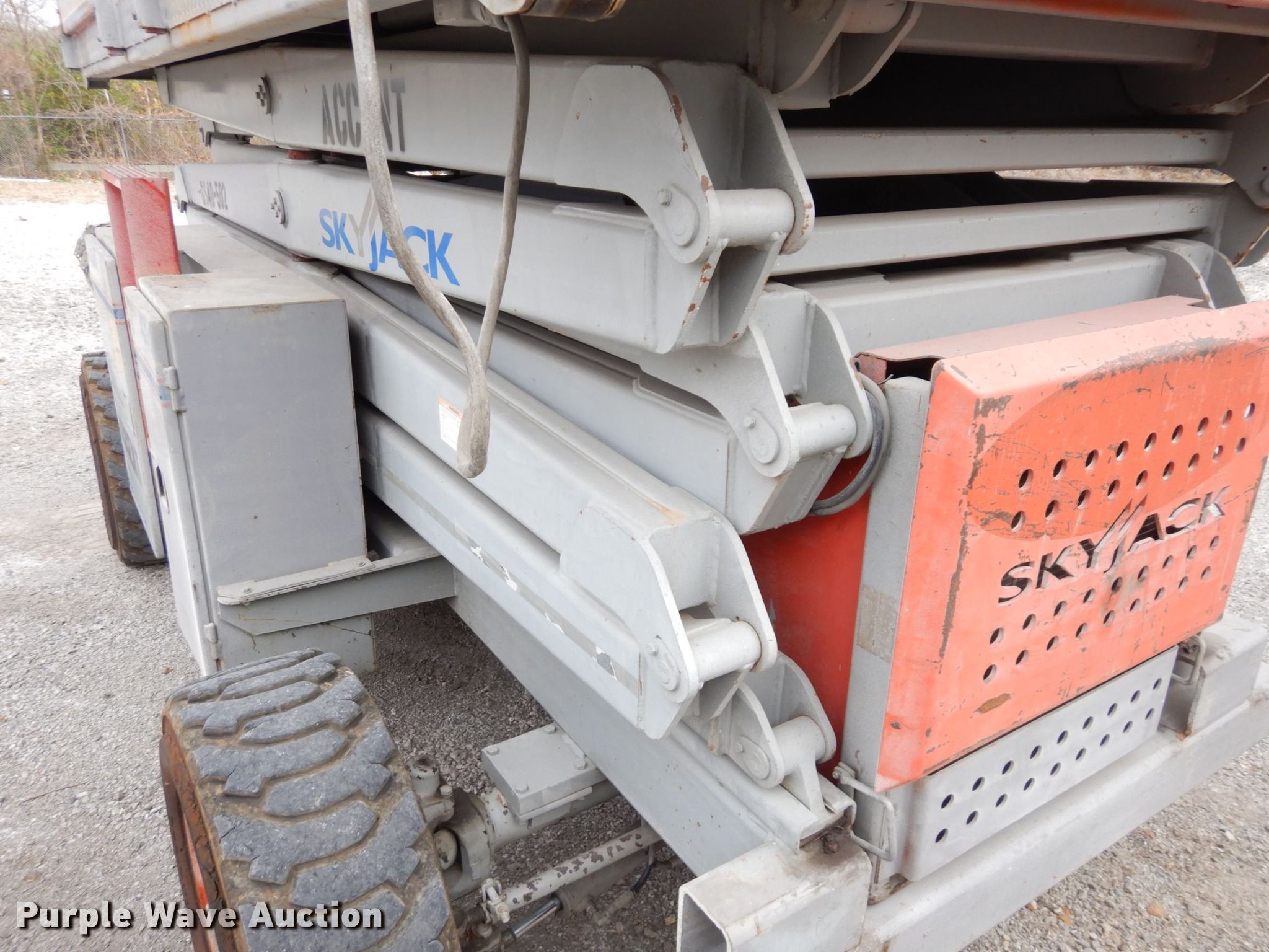 Purple Wave is selling a used Scissor or Vertical Lift in Kansas. This item is a Skyjack SJ8841 scissor lift with the following: Hours: 3,165 on meter, Serial: 43574