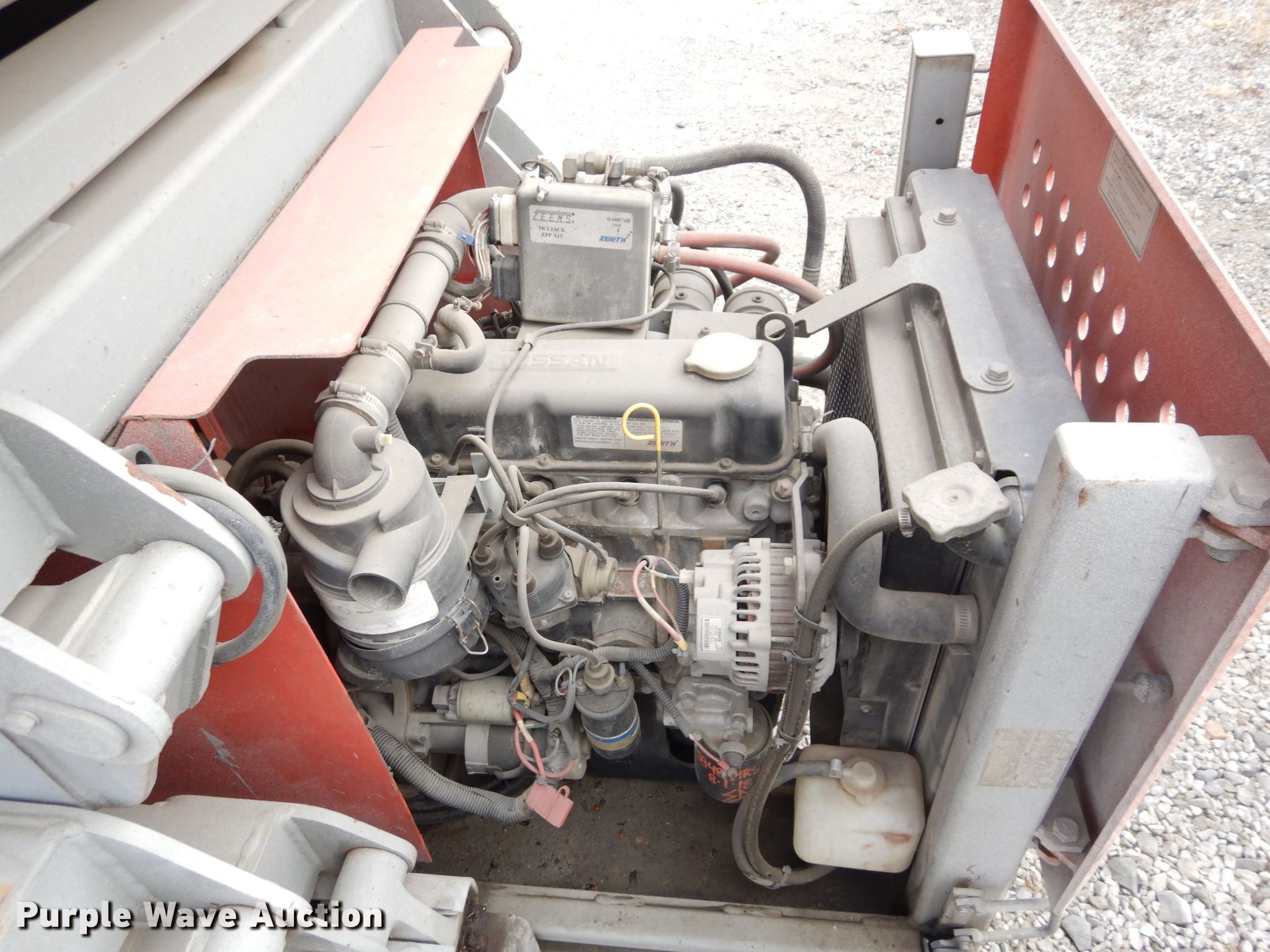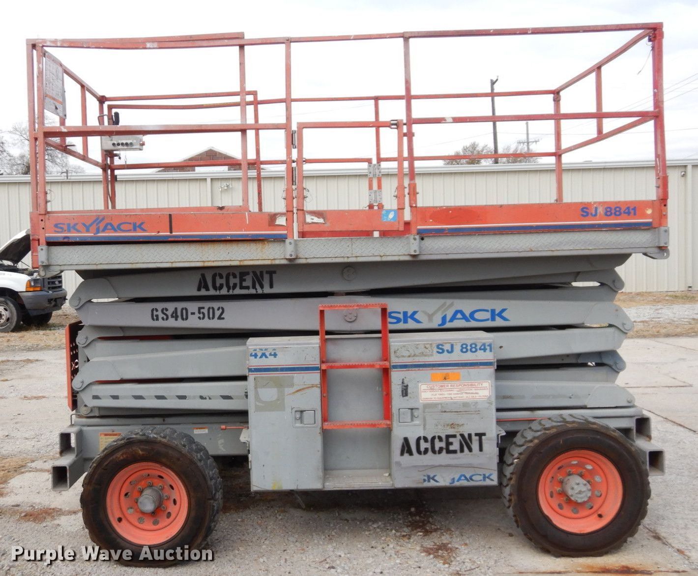 Skyjack SJ8841 scissor lift. Hours: 3,165 on meter, Serial: 43574. Engine Nissan, Displacement: 1.5L, Cylinders: 4, Fuel type: Dual fuel. Chassis Four wheel drive. Features Maximum lift capacity: 1,500 lbs, Maximum lift height: 41', Platform: 138" L x 70" W, AC power outlet, Controls: Platform, Platform extensions: Manual. Tires Tire size: 10-16.5, Foam filled. Notes Fabco Power generator. Accent Sales & Service. 501 S Valley St. Kansas City, KS 66105