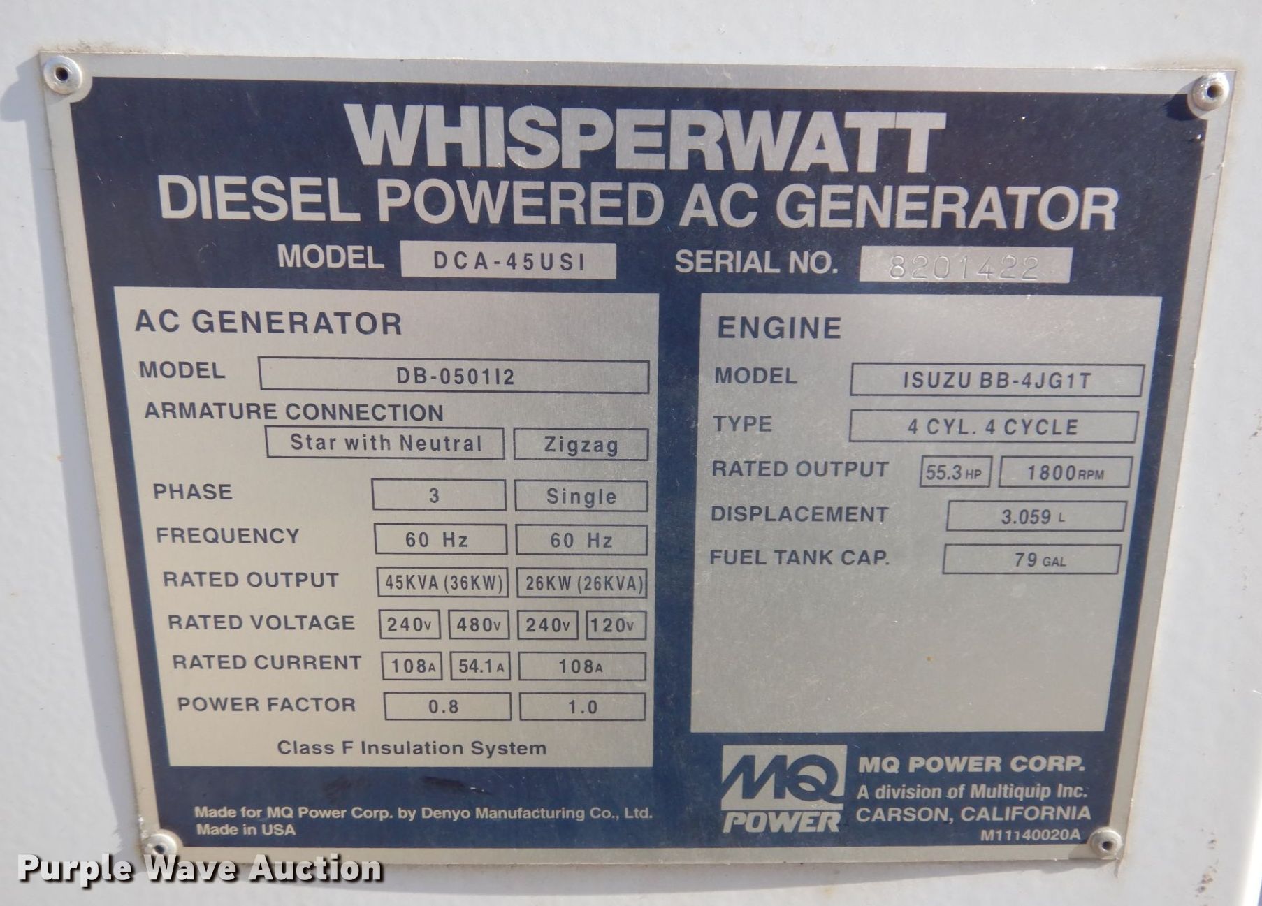 Purple Wave is selling a used Generator Set in Illinois. This item is a Whisperwatt DCA-45USI generator with the following: Hours: 8,958 on meter, Serial: 8201422