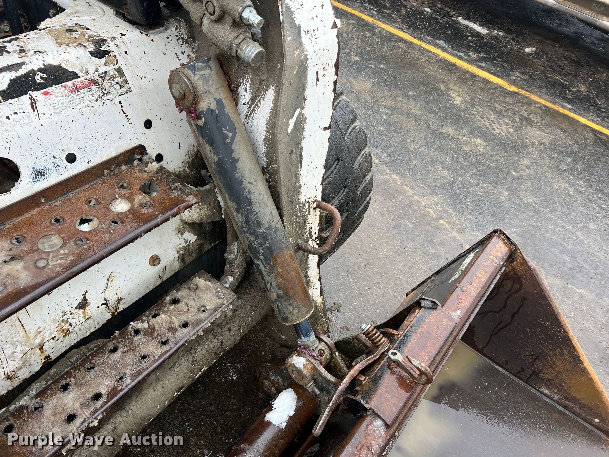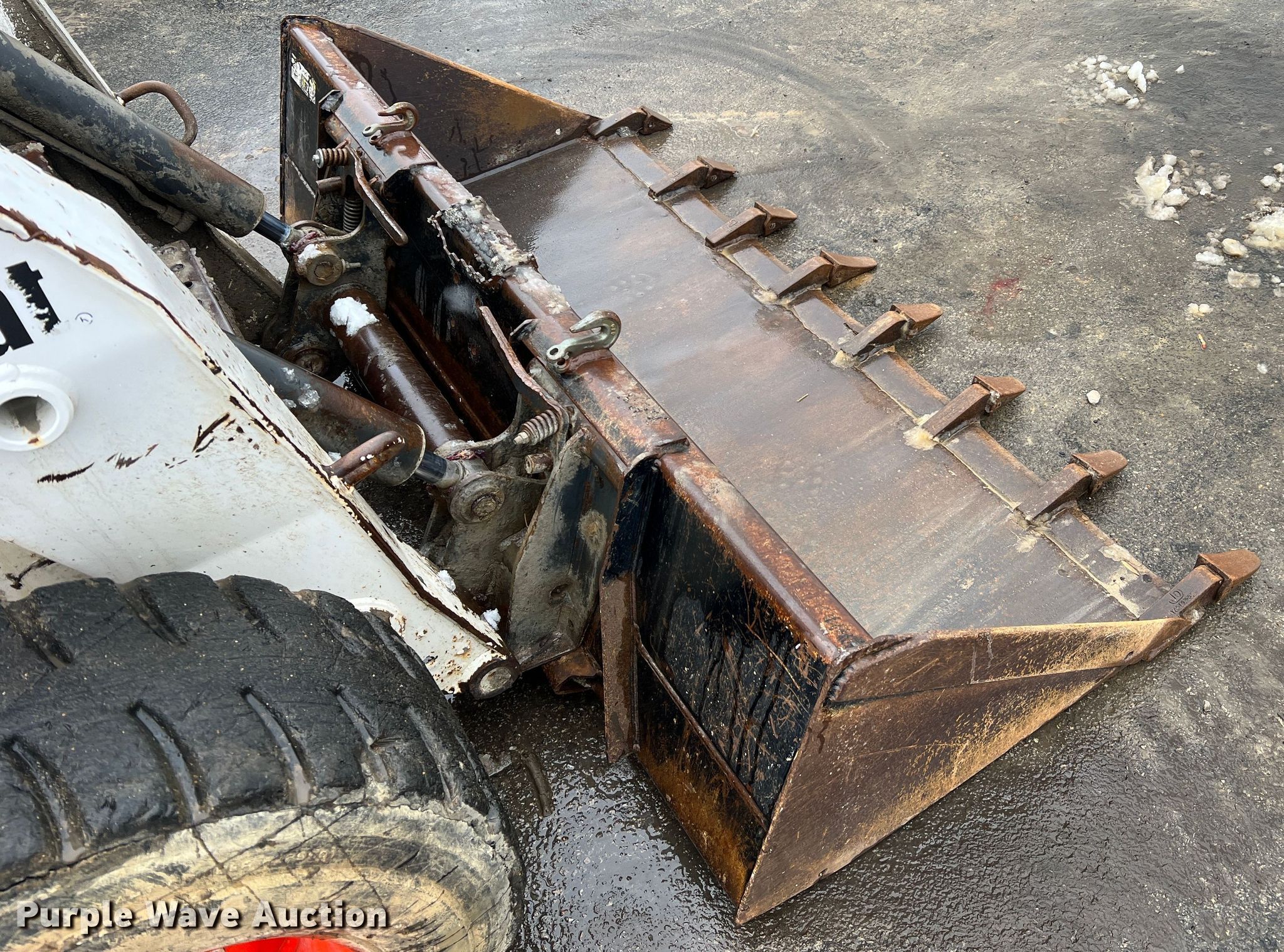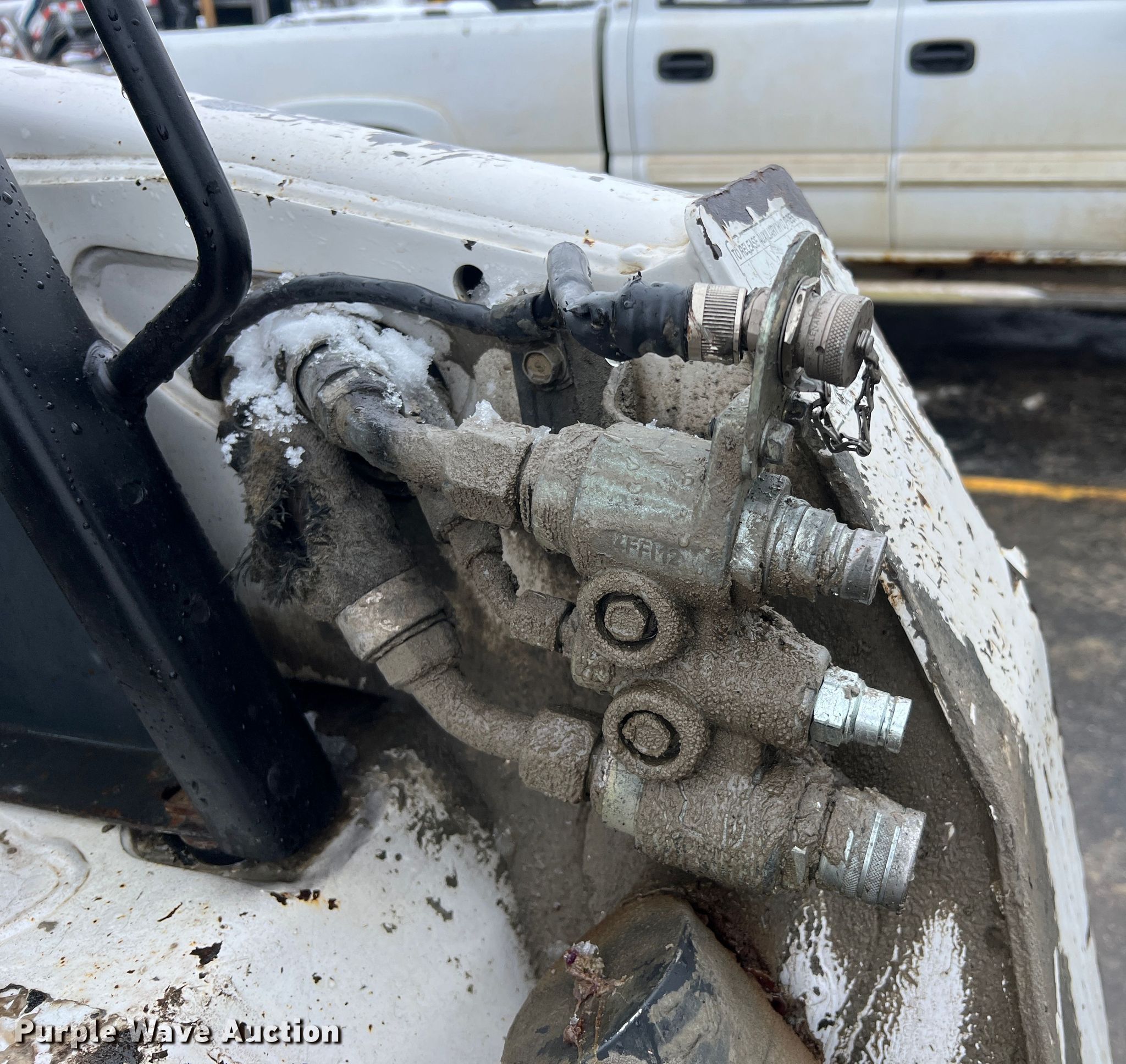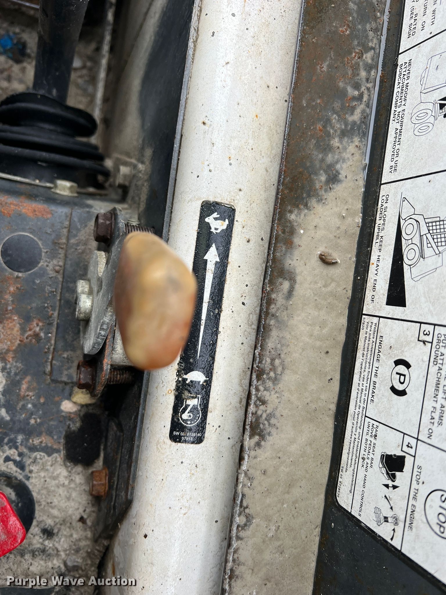 2003 Bobcat S220 skid steer loader. Hours: 4,427 on meter, Serial: 526211080. Engine Kubota, Cylinders: 4, Fuel type: Diesel, HP: 75. Transmission Hydrostatic. Operators station EROPS, Bucket control: Foot. Features Auxiliary hydraulics, Auxiliary electrical outlet, Quick coupler: Manual, Bucket John Deere T76, Width: 76", Cutting edge: Weld-on, Teeth: Bolt-on. Tires Size: 12-16.5. Notes Foam filled front tires. Higgins Asphalt. 35086 Higgins Rd. Tipton, MO 65081