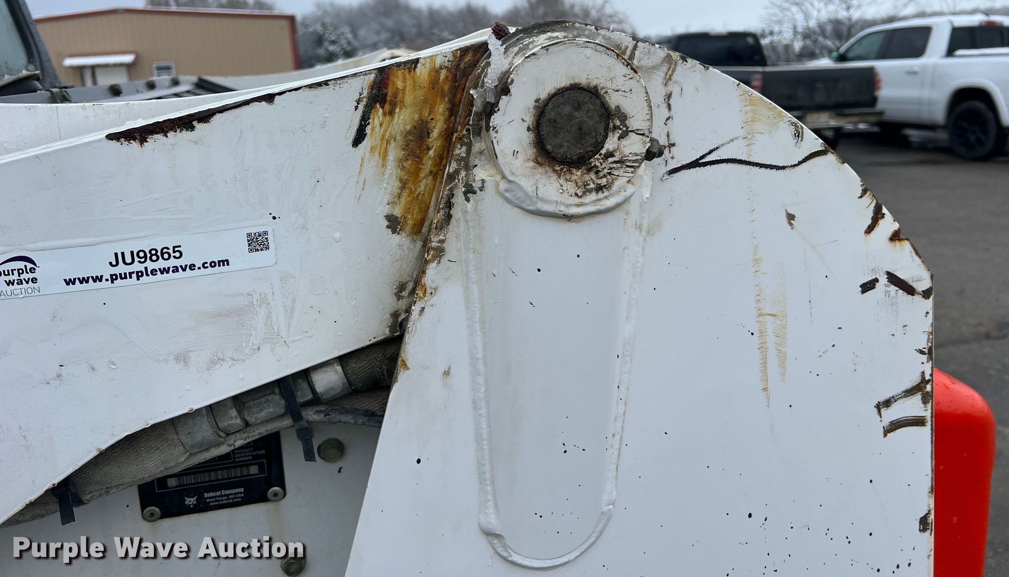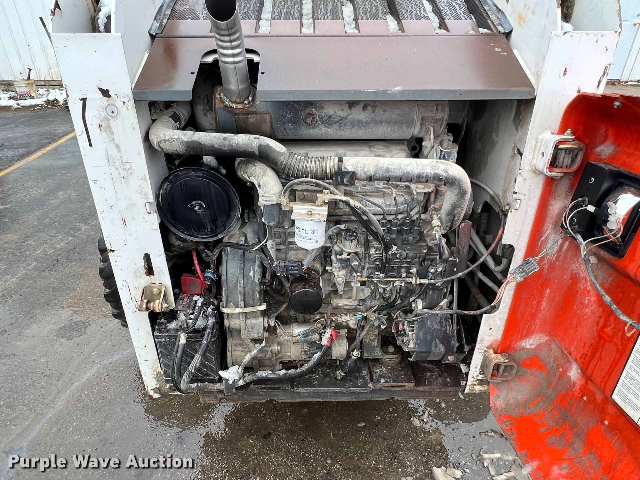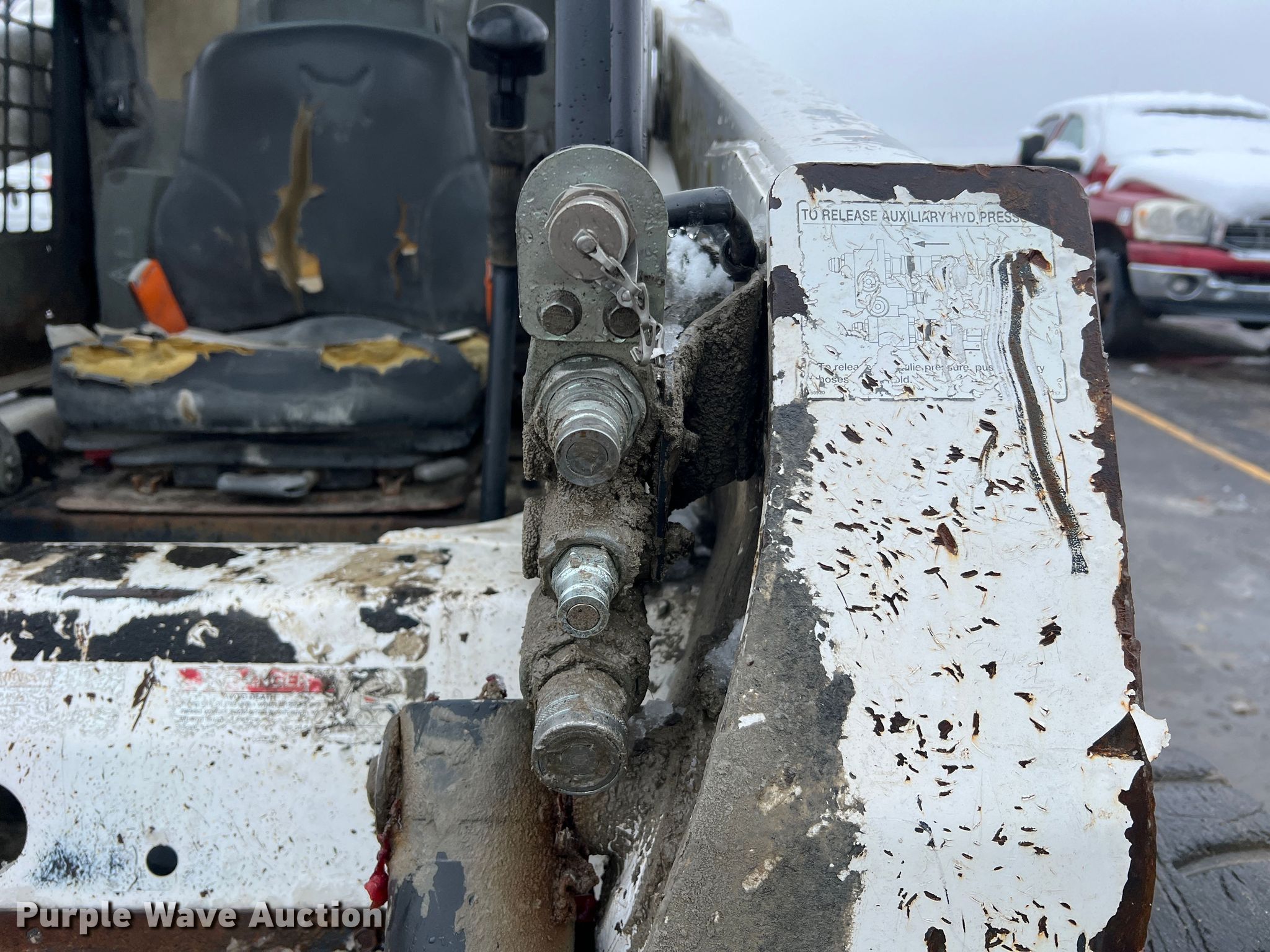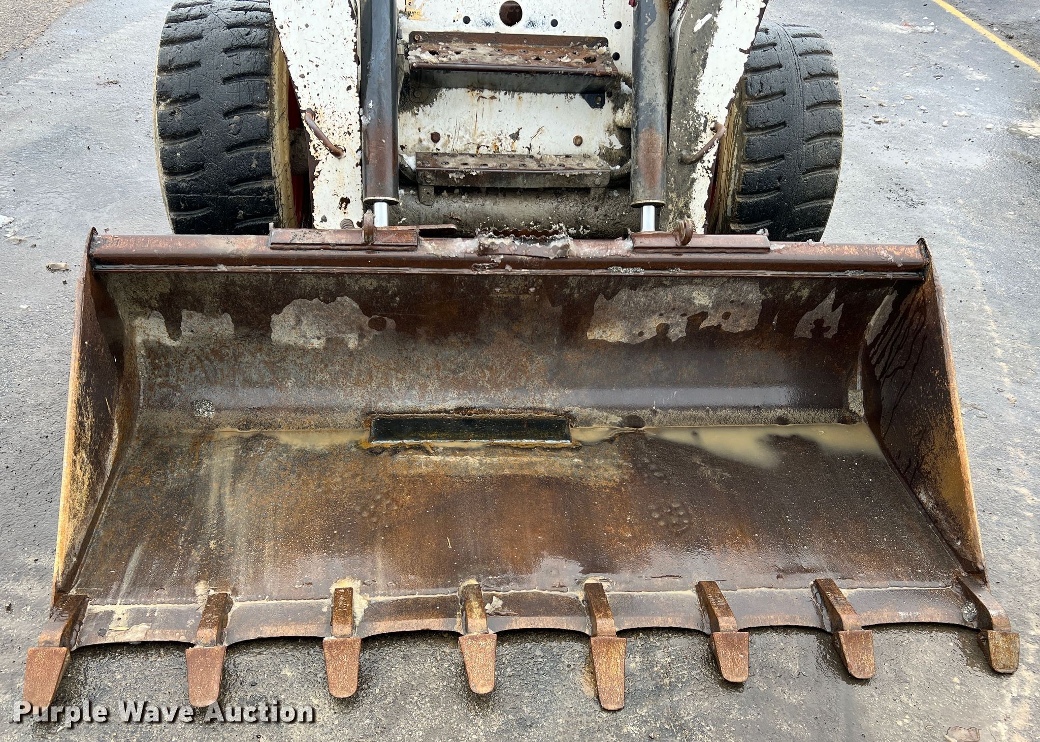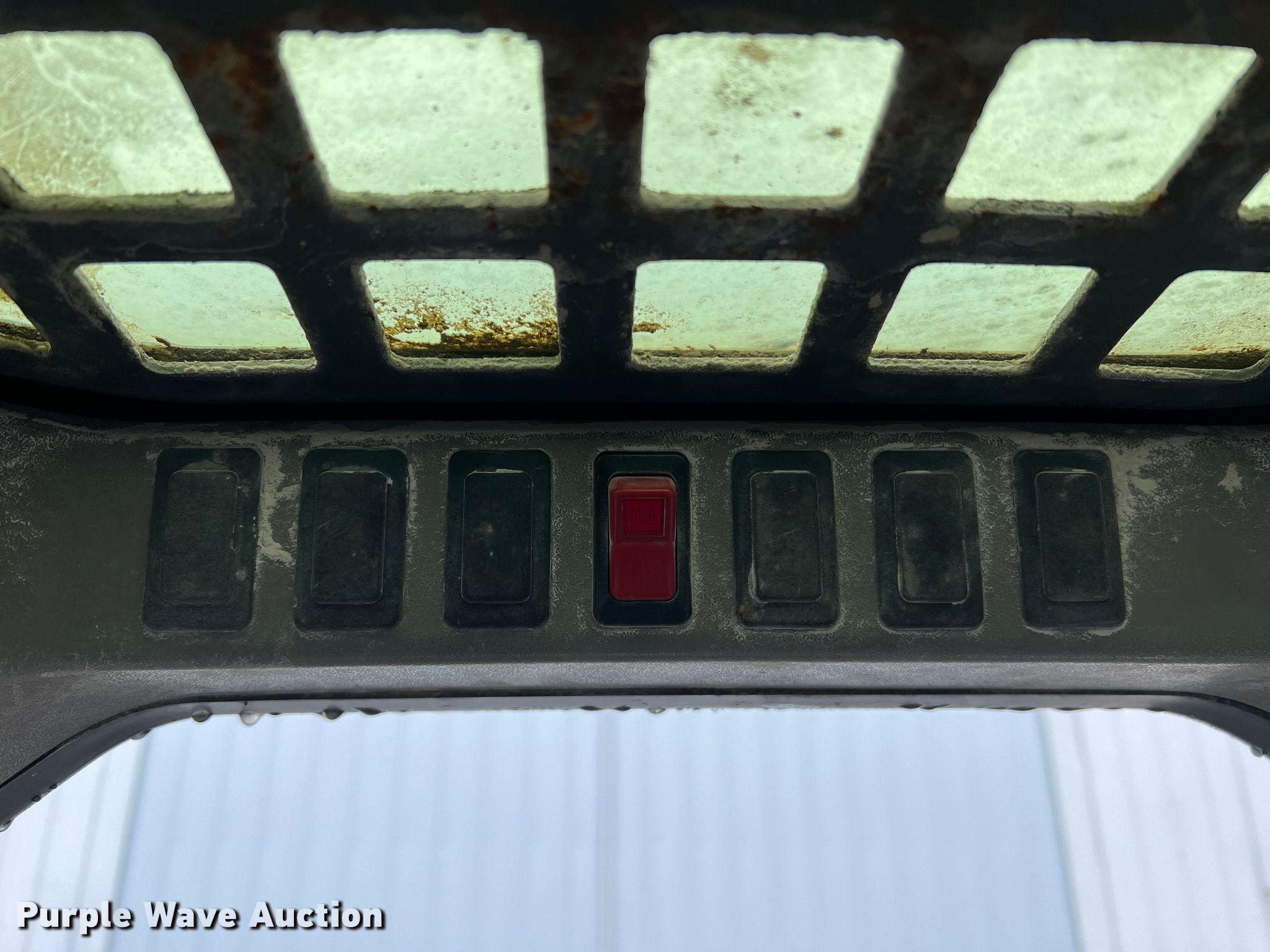 2003 Bobcat S220 skid steer loader. Hours: 4,427 on meter, Serial: 526211080. Engine Kubota, Cylinders: 4, Fuel type: Diesel, HP: 75. Transmission Hydrostatic. Operators station EROPS, Bucket control: Foot. Features Auxiliary hydraulics, Auxiliary electrical outlet, Quick coupler: Manual, Bucket John Deere T76, Width: 76", Cutting edge: Weld-on, Teeth: Bolt-on. Tires Size: 12-16.5. Notes Foam filled front tires. Higgins Asphalt. 35086 Higgins Rd. Tipton, MO 65081