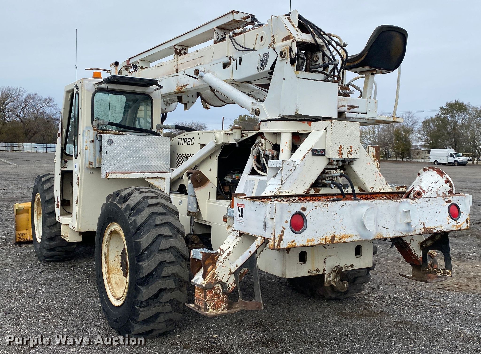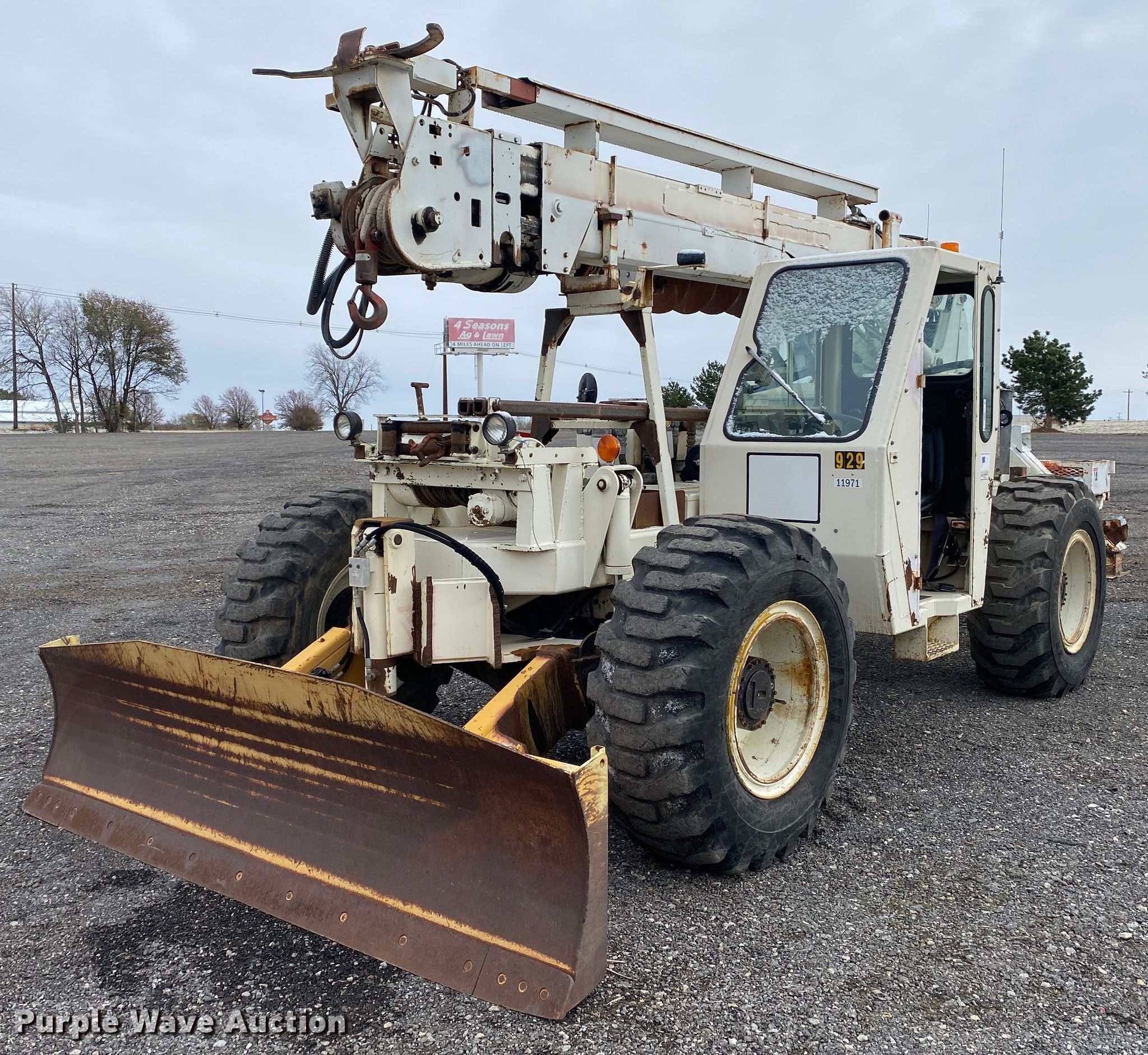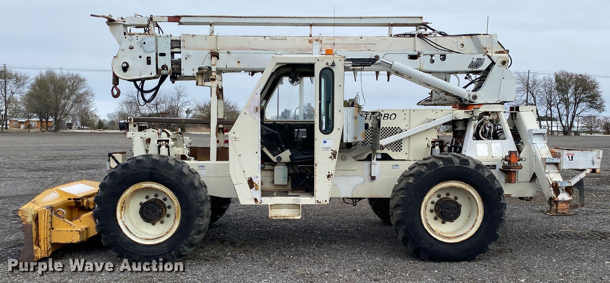 Terex SS1048 telehandler. Hours: 2,087 on meter, Serial: 0027672087. Engine John Deere, Cylinders: 4, Fuel type: Diesel. Transmission Powershift, 3F - 3R, Four wheel drive, Differential lock. Operators station OROPS, Steering: Crab, Four wheel. Features Maximum lift capacity: 13,450 lbs, Maximum lift height: 40', Tilt carriage, Hydraulic outriggers, Pole guide, Terex 20" diameter auger, Backfill blade. Tires Size: 17.5-25. 15600 North 145th East Avenue. Collinsville, OK 74021