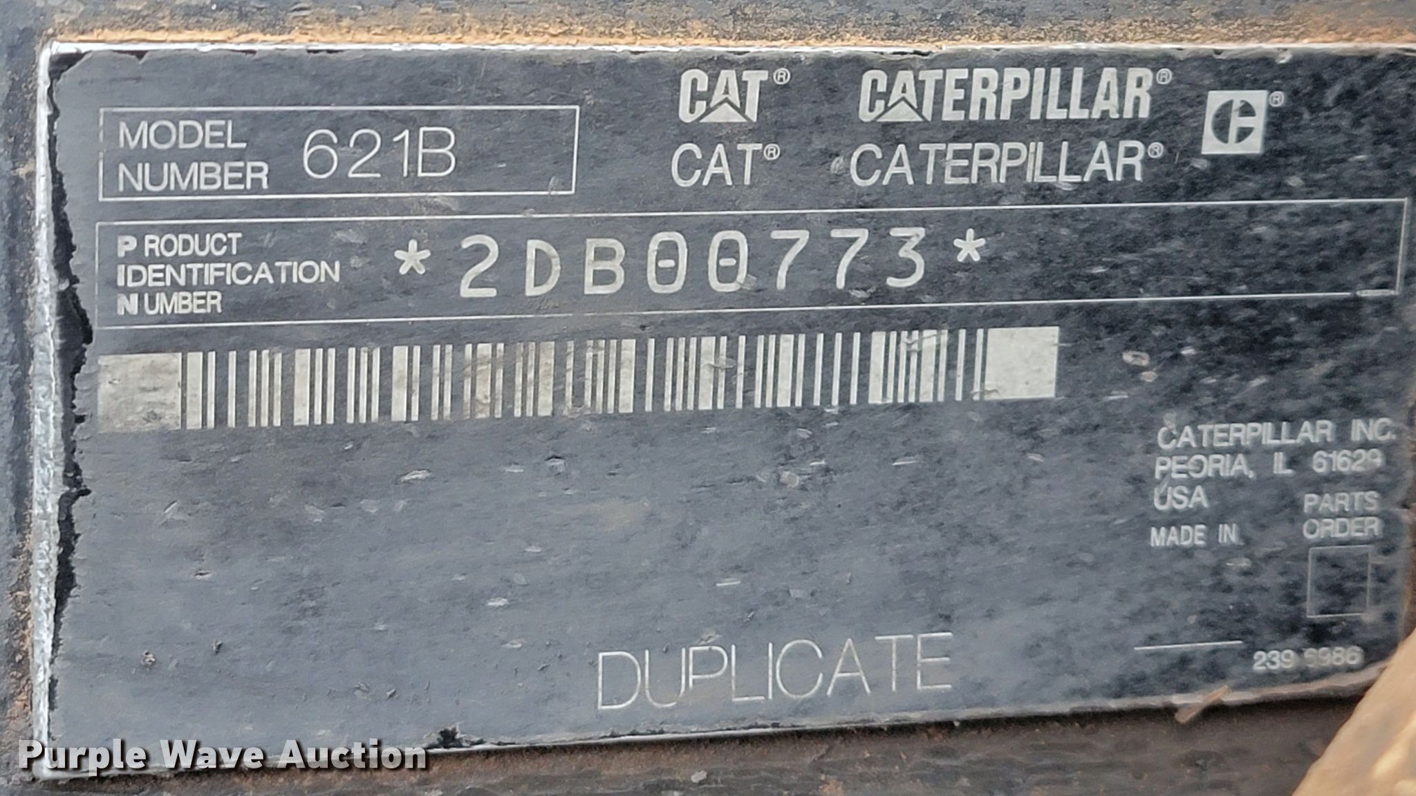 1985 Caterpillar 621B conventional scraper. Hours: 3,330 on meter, Serial: 2DB00773. Engine Caterpillar 3406, Cylinders: 6, Fuel type: Diesel. Transmission Powershift, 8F - 1R. Chassis Brakes: Air. Operators station Enclosed cab, Heat. Features Bowl capacity: 18 cu.yd., Hydraulic lift, Scraper controls: Lever controls No. of controls: 3. G&H Contractors LLC. 12125 W Farm Rd 2. Walnut Grove, MO 65770