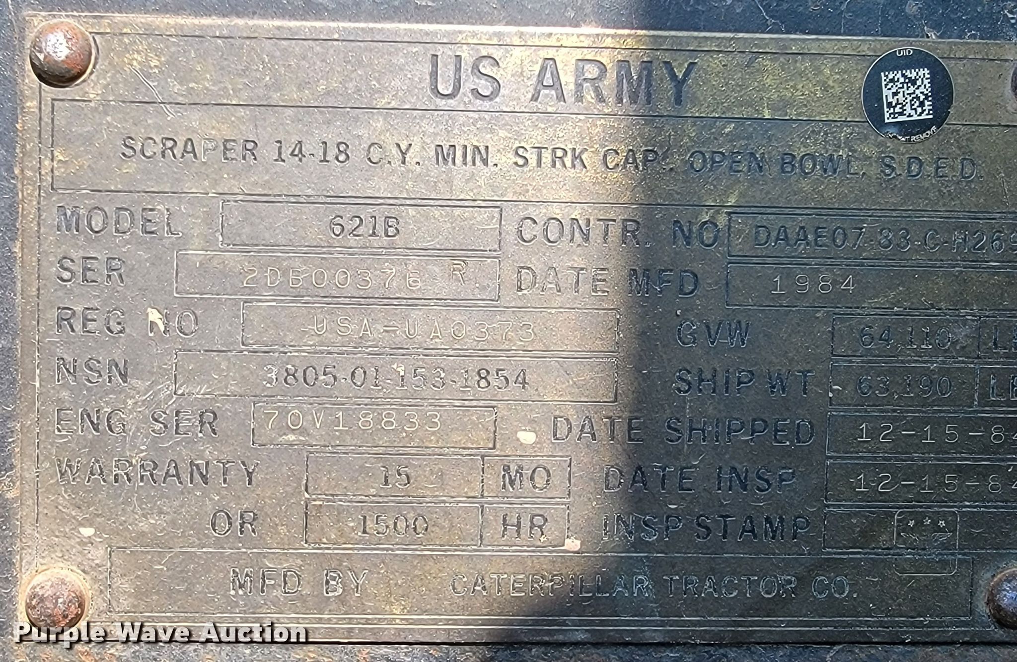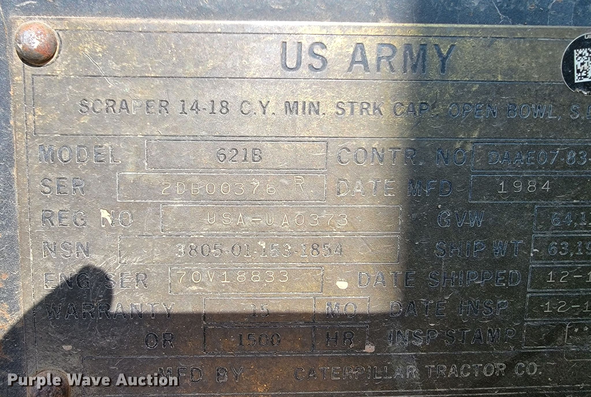 Purple Wave is selling a used Conventional Scraper in Missouri. This item is a 1984 Caterpillar 621B conventional scraper with the following: Hours: 1,994 on meter, Serial: 2DB003765R6700
