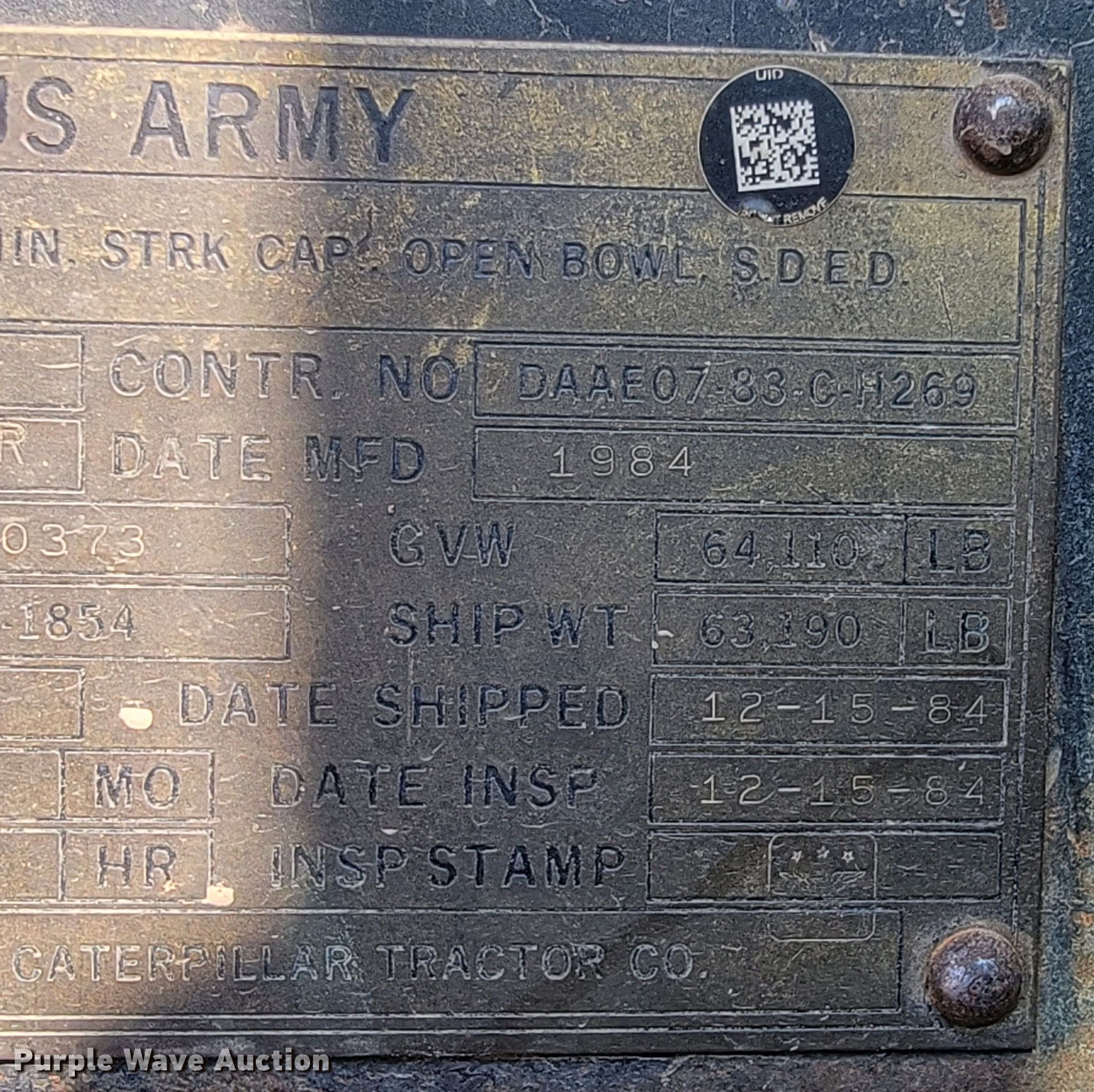 1984 Caterpillar 621B conventional scraper. Hours: 1,994 on meter, Serial: 2DB003765R6700. Engine Caterpillar 3406, Cylinders: 6, Fuel type: Diesel. Transmission Powershift, 8F - 1R. Chassis Brakes: Air. Operators station Enclosed cab, Heat. Features Bowl capacity: 18 cu.yd., Hydraulic lift, Scraper controls: Lever controls No. of controls: 3. Tires Size: 29.5-29. G&H Contractors LLC. 12125 W Farm Rd 2. Walnut Grove, MO 65770