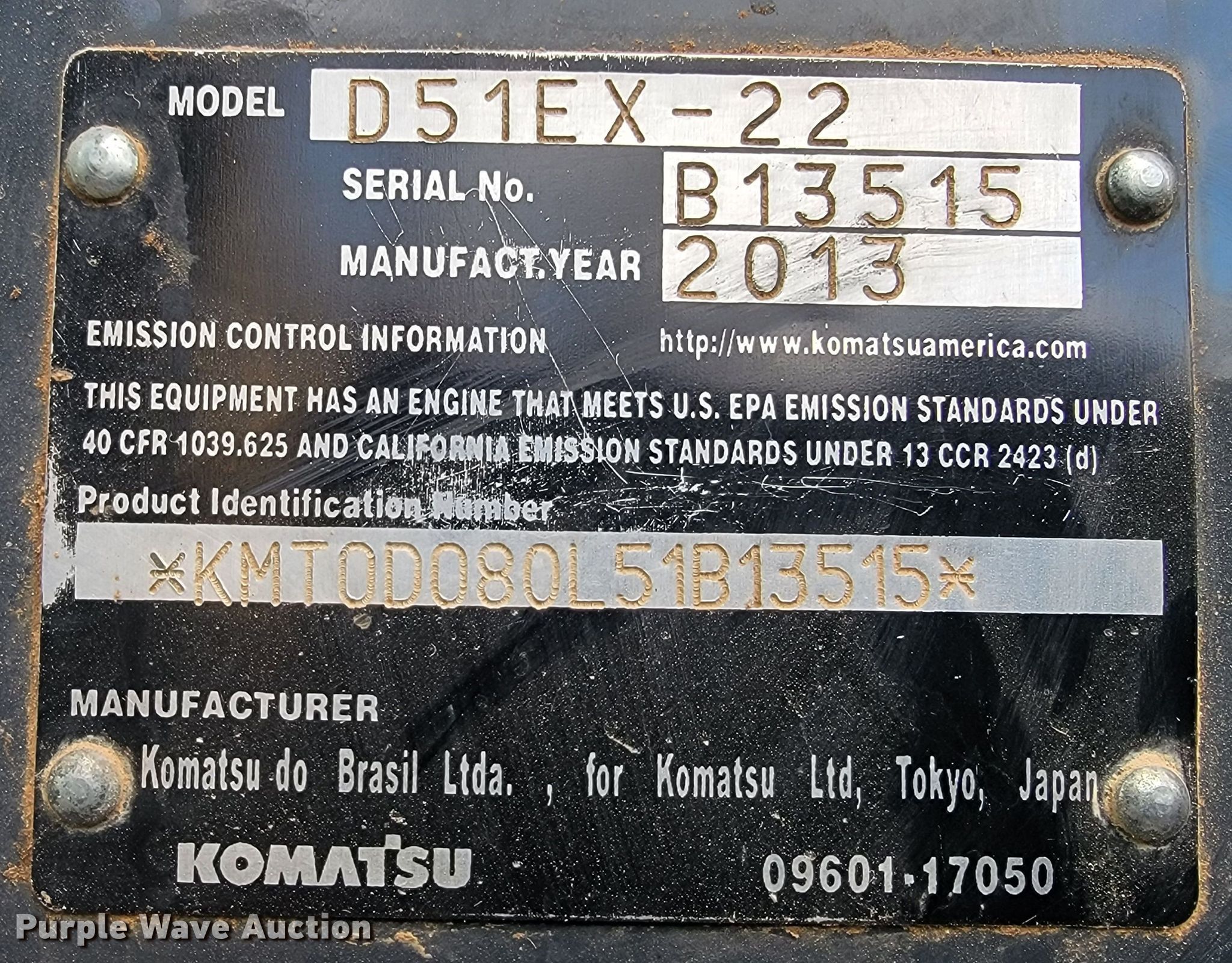 Purple Wave is selling a used Crawler Dozer in Missouri. This item is a 2014 Komatsu D51EX-22 dozer with the following: Hours: 3,212 on meter, Miles or hours may vary, unit still in use, Serial: KMT0D080L51B13515