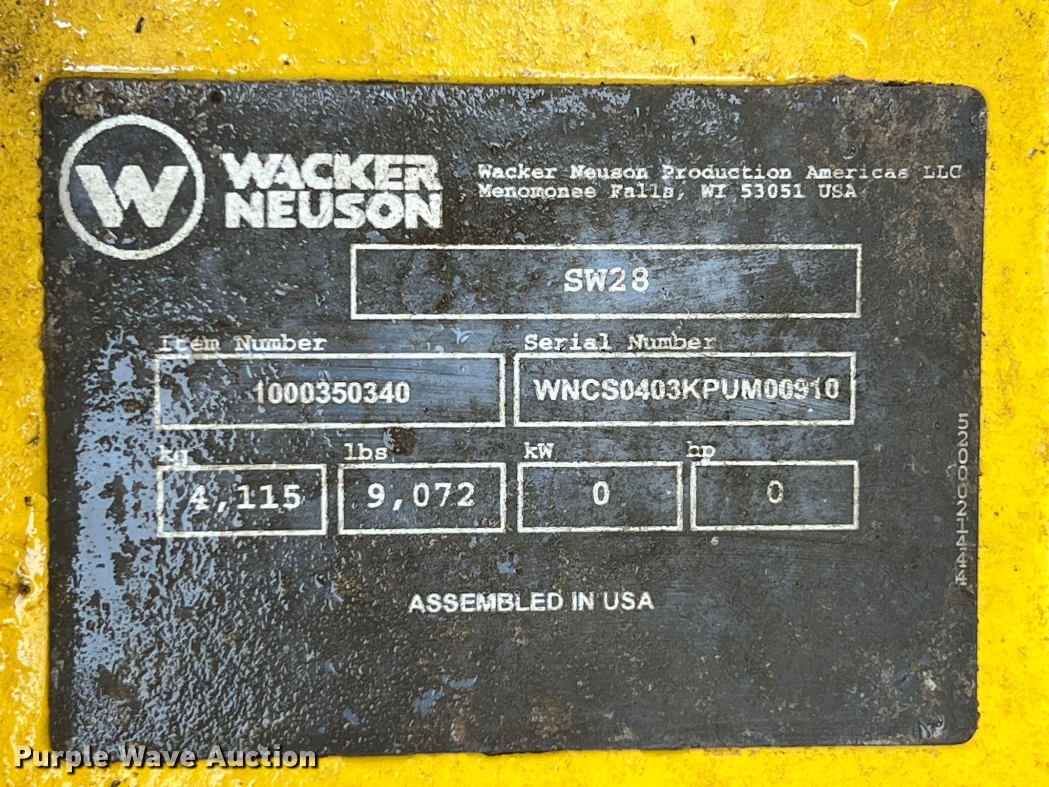 Purple Wave is selling a used Skid Steer Loader in Oklahoma. This item is a Wacker Neuson SW28 skid steer loader with the following: Hours: 160 on meter, Serial: WNCS0403KPUM00910