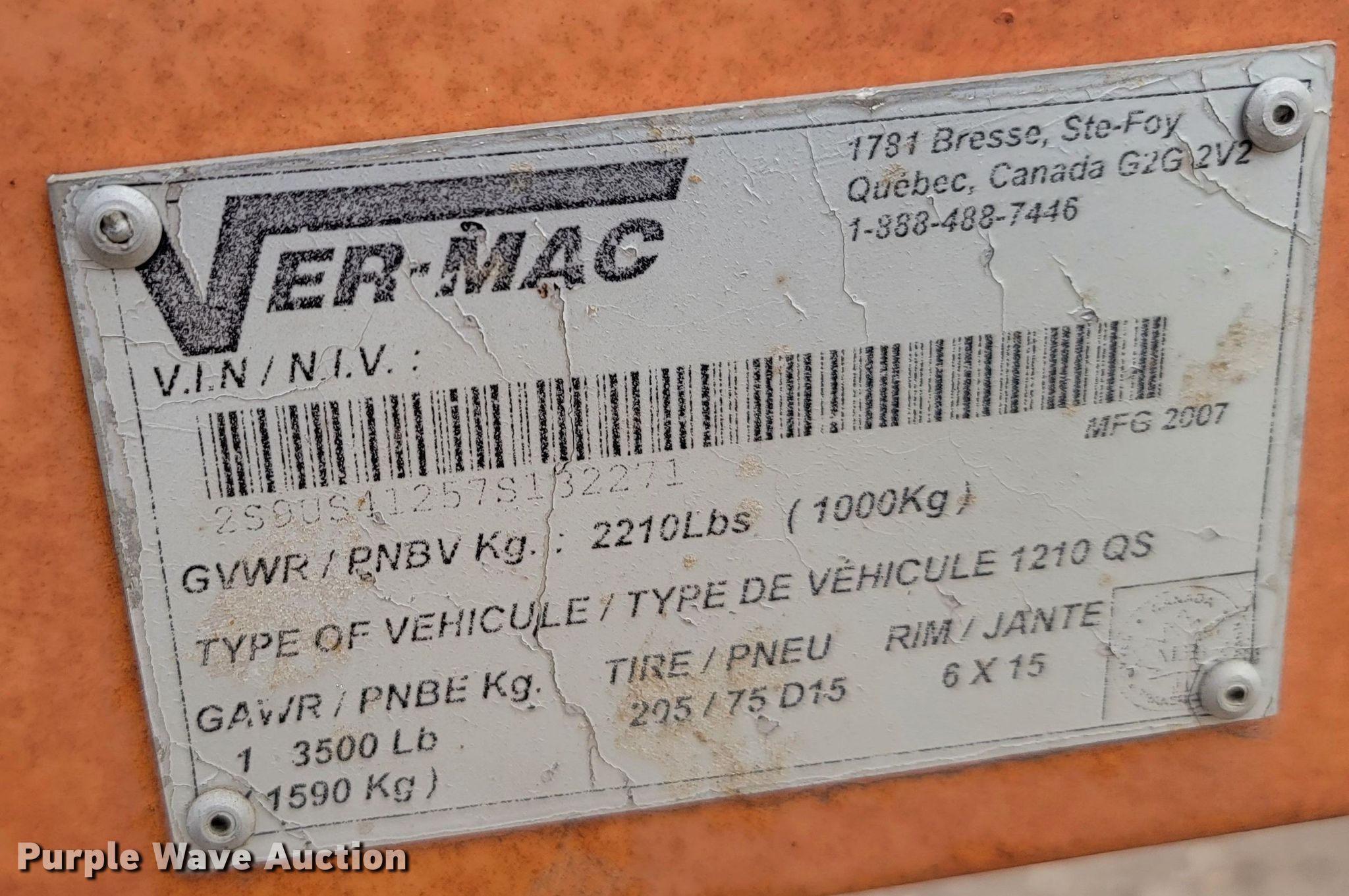 2007 Ver-Mac message board trailer. VIN: 2S9US41257S132271, Sign: 133" L x 71" W , Controller, Hitch: 2" ball, Suspension: Spring, Tires: ST205/75D15. Transfer of ownership documentation will be a bill of sale. Traffic Solutions. 27297 Kenworth Pl. Harrisburg, SD 57032