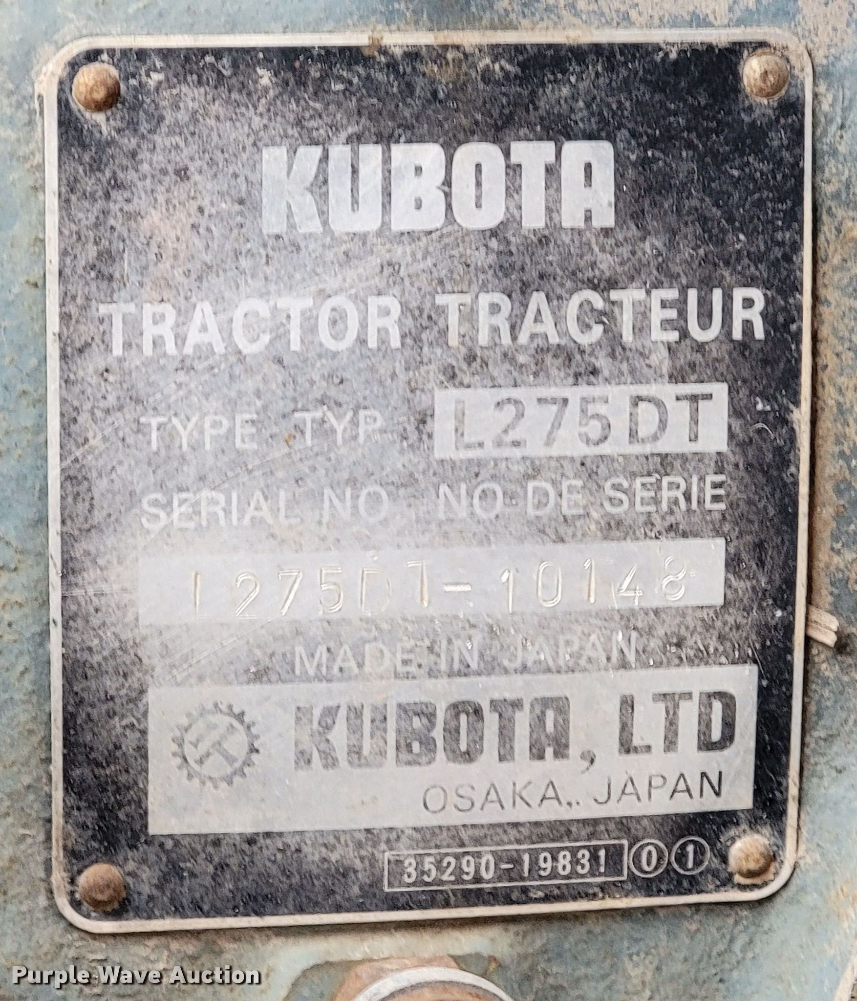 Purple Wave is selling a used Tractor in South Dakota. This item is a Kubota L275 MFWD tractor with the following: Hours: 2,587 on meter, Serial: 1275D1-10148