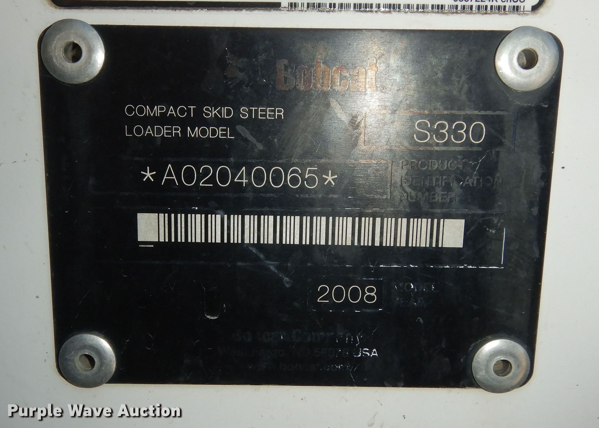 Purple Wave is selling a used Skid Steer Loader in Kansas. This item is a 2008 Bobcat S330 skid steer loader with the following: Hours: 3,527 on meter, Miles or hours may vary, unit still in use, Serial: A02040065