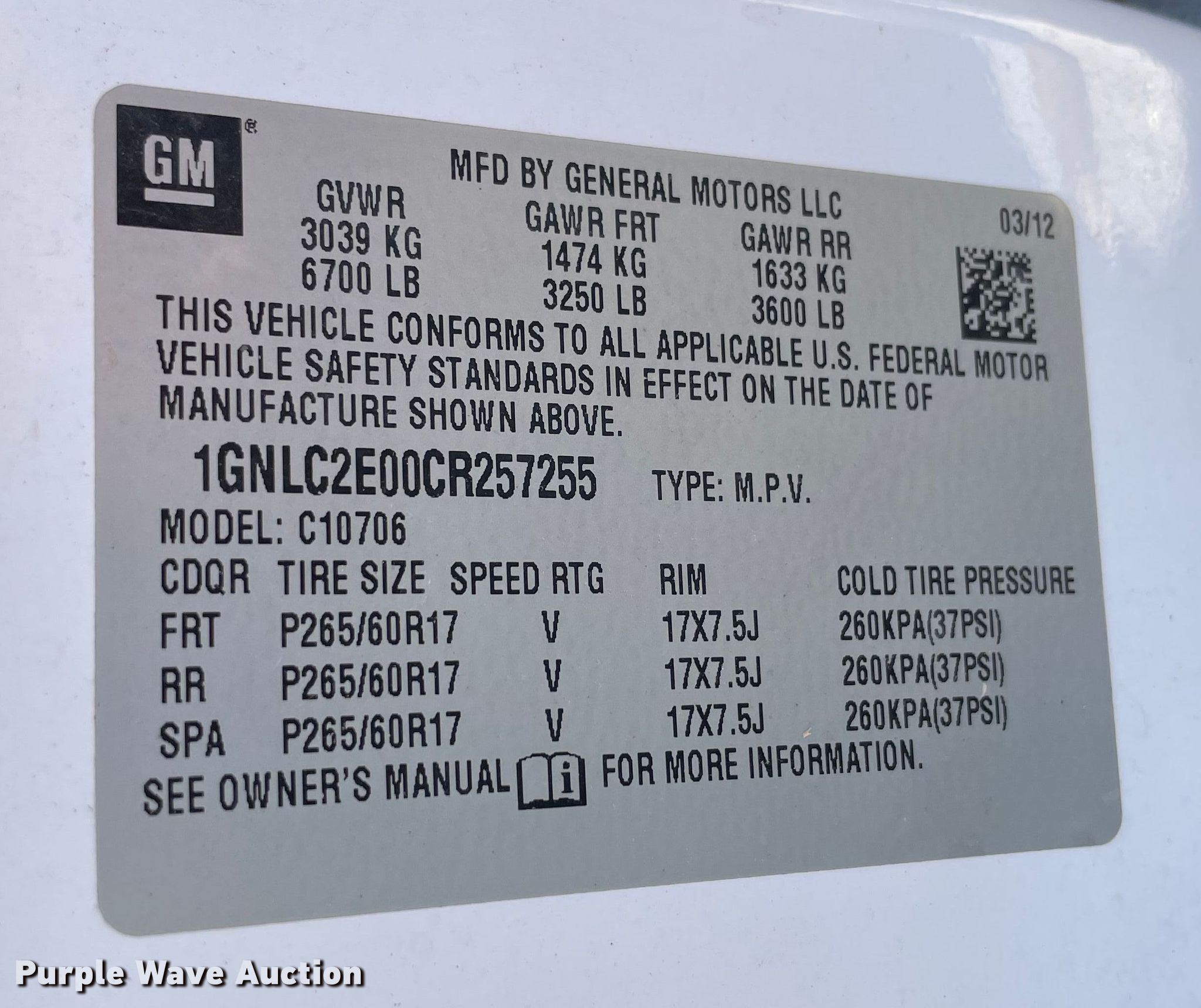 Purple Wave is selling a used Passenger Vehicle in Oklahoma. This item is a 2012 Chevrolet Tahoe Police SUV with the following: Miles: 184,571 on odometer, VIN: 1GNLC2E00CR257255