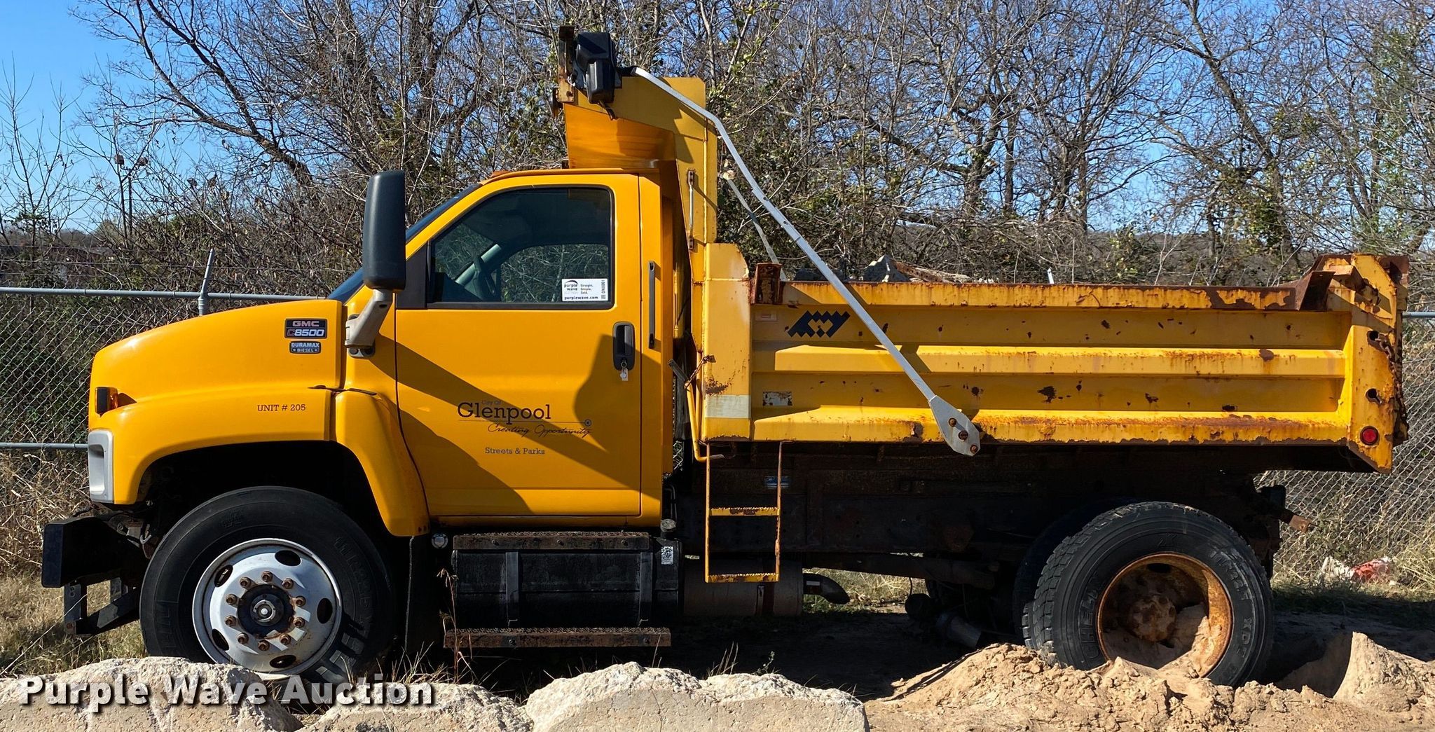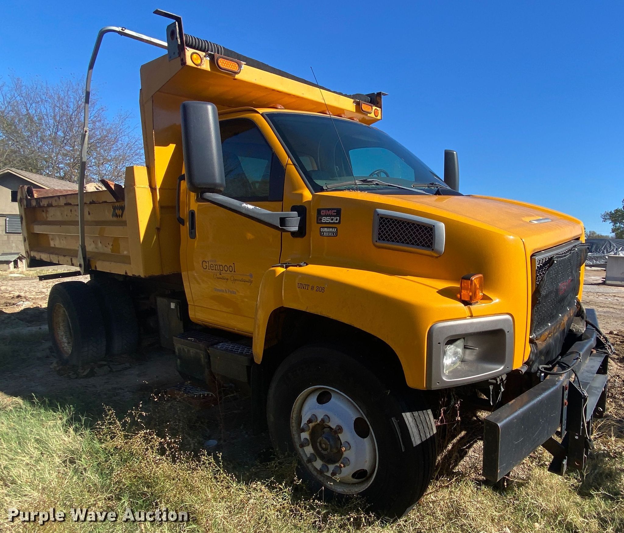 2005 GMC C8500 dump truck. Miles: Unknown, VIN: 1GDP8C1315F524341. Engine Displacement: 7.8L, Cylinders: 6, Fuel type: Diesel. Transmission Automatic. Chassis Axles: Single, Suspension: Spring, Brakes: Air, PTO, GVWR: 36,220 lbs FAWR: 13,220 lbs, RAWR: 23,000 lbs. Interior AC, Heat, Cruise control. Features Dump bed Warren Inc. U50-723, 10' L x 95" W, Side height: 27", Roll tarp, Ram: Single , End gate: Manual, Plow Western Products 10'HW, Width: 120". Tires Size: 11R22.5. Notes Non-operational engine, Non-operational unit. Oklahoma title. Mileage has not been verified. Exempt will be written in the odometer disclosure on the title. Seller is a government entity who will be assigning and distributing the title. Please contact the seller for distribution questions. City of Glenpool. 12205 South Yukon Avenue. Glenpool, OK 74033