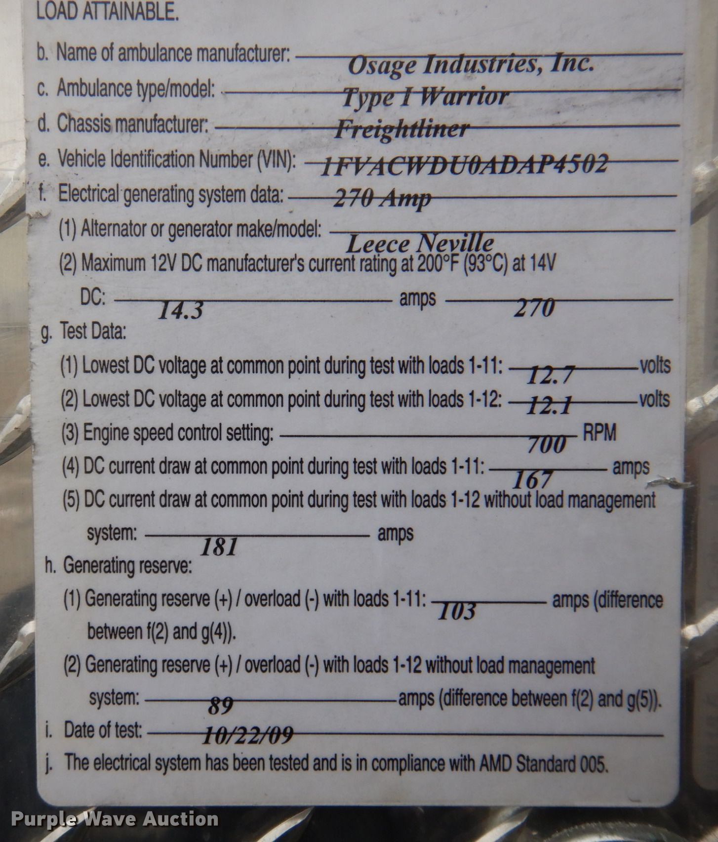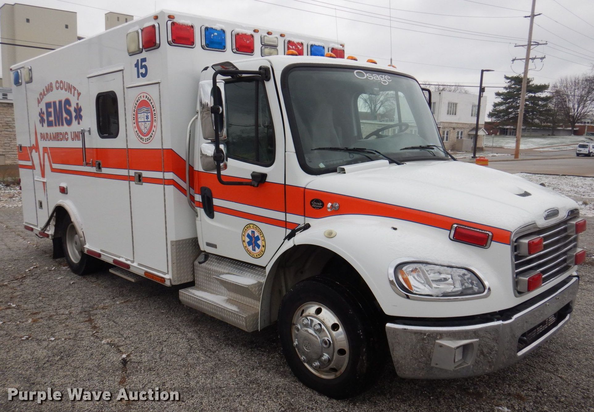 2010 Freightliner Business Class M2 ambulance. Miles: 196,829 on odometer, Hours: 2,121 on meter, VIN: 1FVACWDU0ADAP4502, Unit #: 15. Engine Cummins ISB, Displacement: 6.7L, Cylinders: 6, Fuel type: Diesel. Transmission Automatic. Chassis Axles: Single, Suspension: Air, Brakes: Air, GVWR: 20,000 lbs. Interior AC, Heat, Heated mirrors, Power windows, Power locks, Cruise control, Auxiliary controls. Features Ambulance body Osage Industries Type I Warrior, PA/ siren controls, Oxygen hookups. Tires Size: 245/70R19.5. Notes Dash warning indicator: Check engine, Regen, Non-operational driver side compartment door. Illinois title. Adams County Ambulance & EMS. 2906 Chestnut Street. Quincy, IL 62301