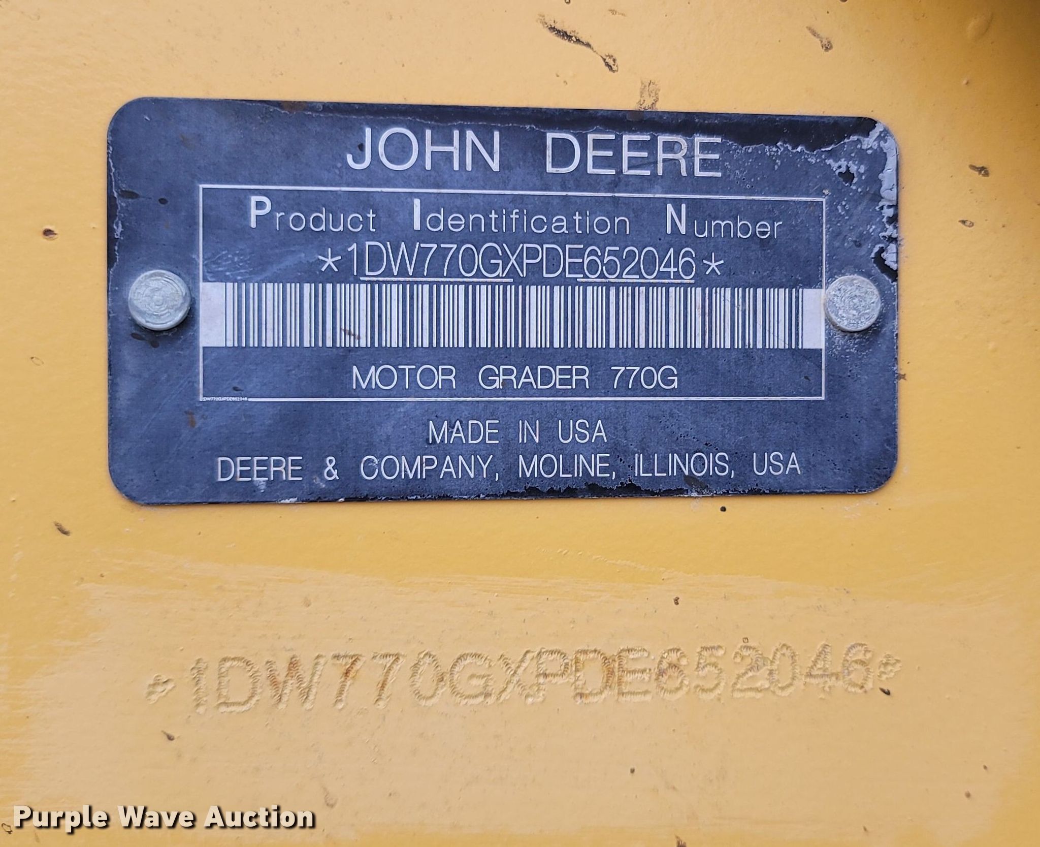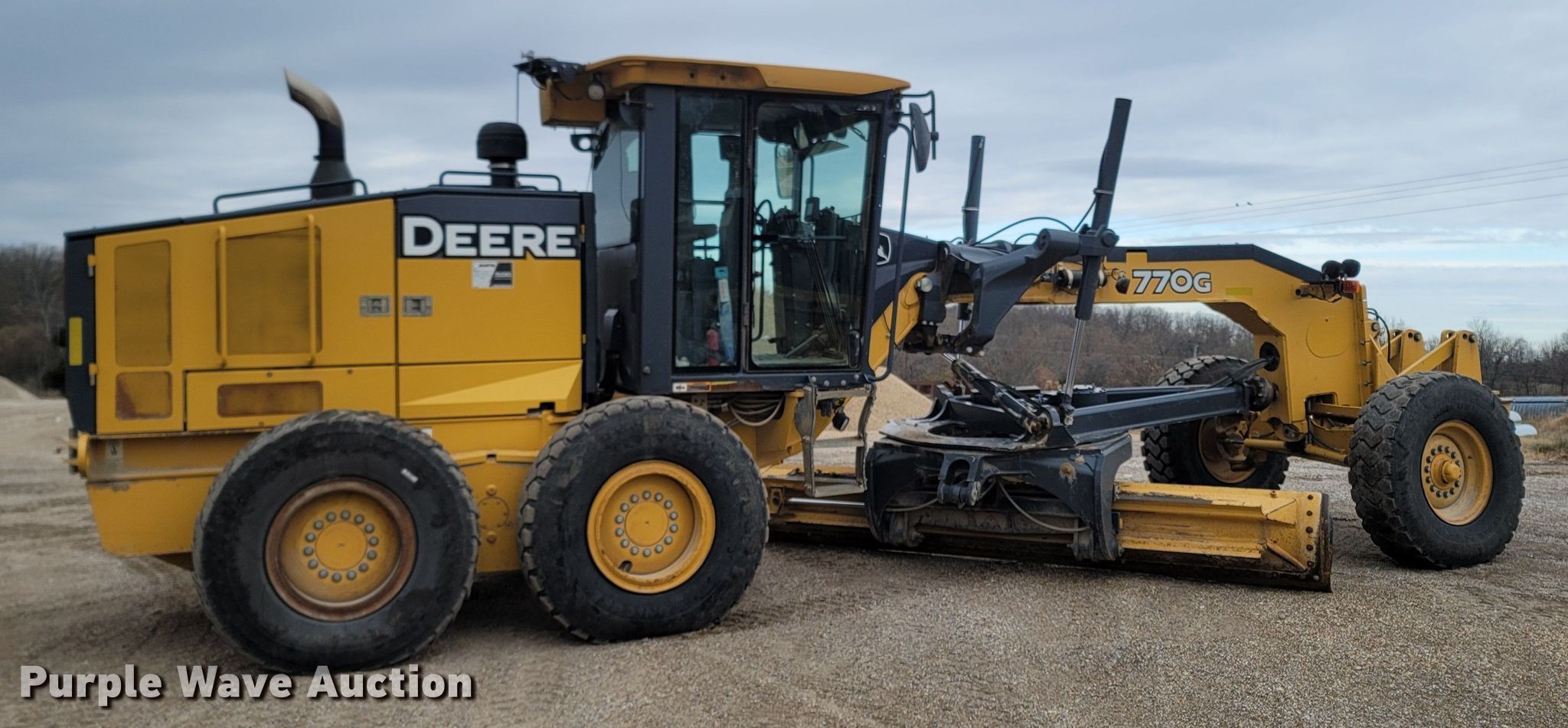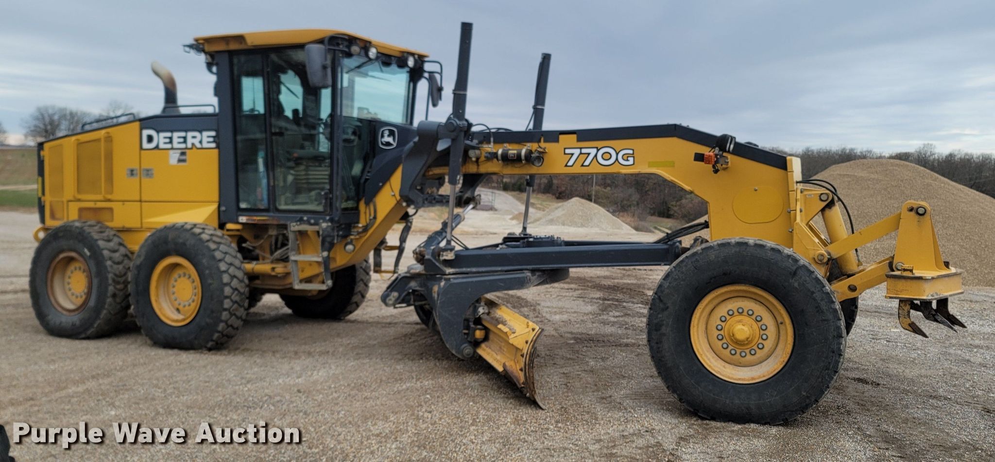 Purple Wave is selling a used Motor Grader in Missouri. This item is a 2013 John Deere 770G motor grader with the following: Hours: 9,262 on meter, Serial: 1DW770GXPDE652046, Unit #: 3361