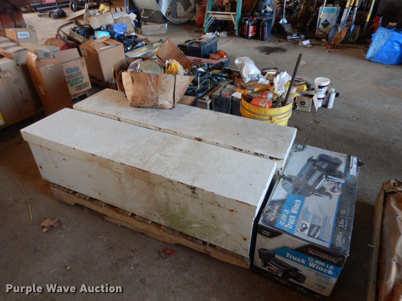 Purple Wave is selling a used Tools in Oklahoma. This item is a Tools with the following: Truck winch, Capacity: 12,000 lbs, Filters, Gaskets, Caterpillar cylinder head, Removed from a Caterpillar D6, Electric drill, Power steering pump, Fiberglass repair kit, Parts cleaner, (2) creepers, Air hose reel, Transmission jack, Bottle jacks, Electric heaters, And more