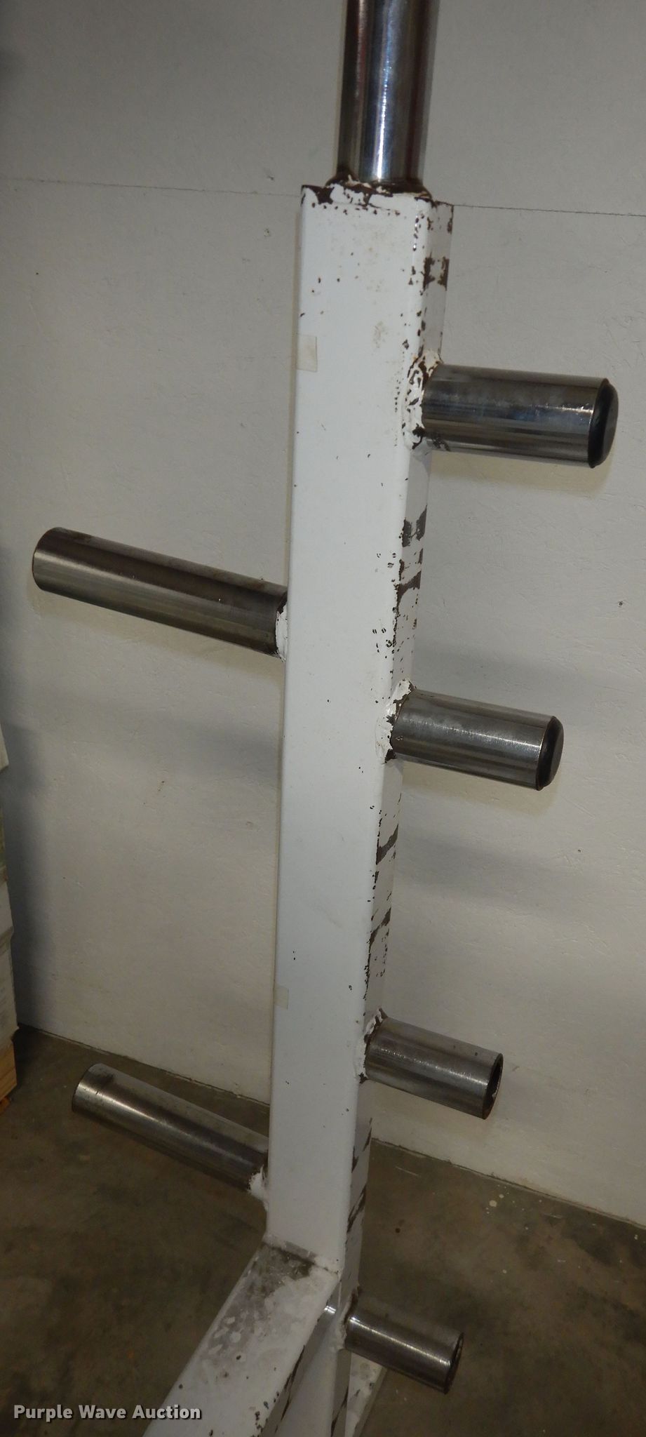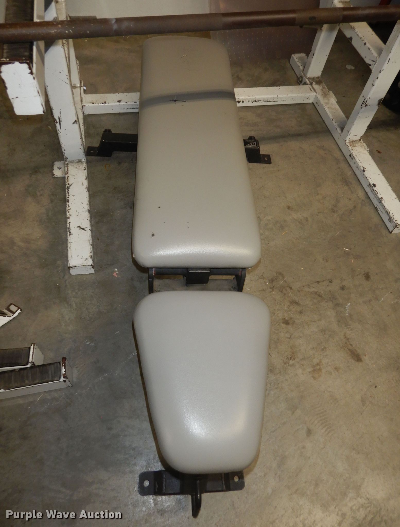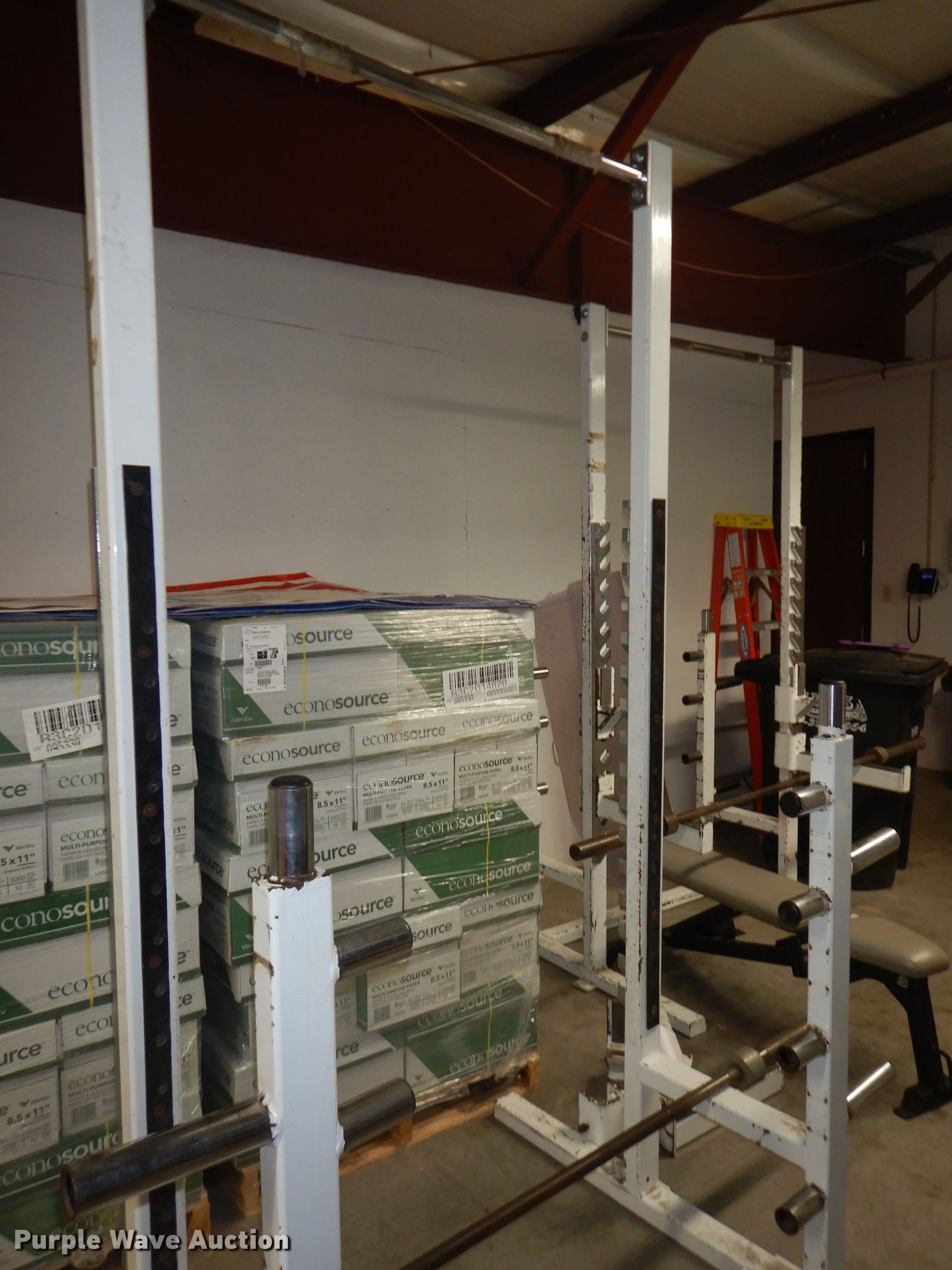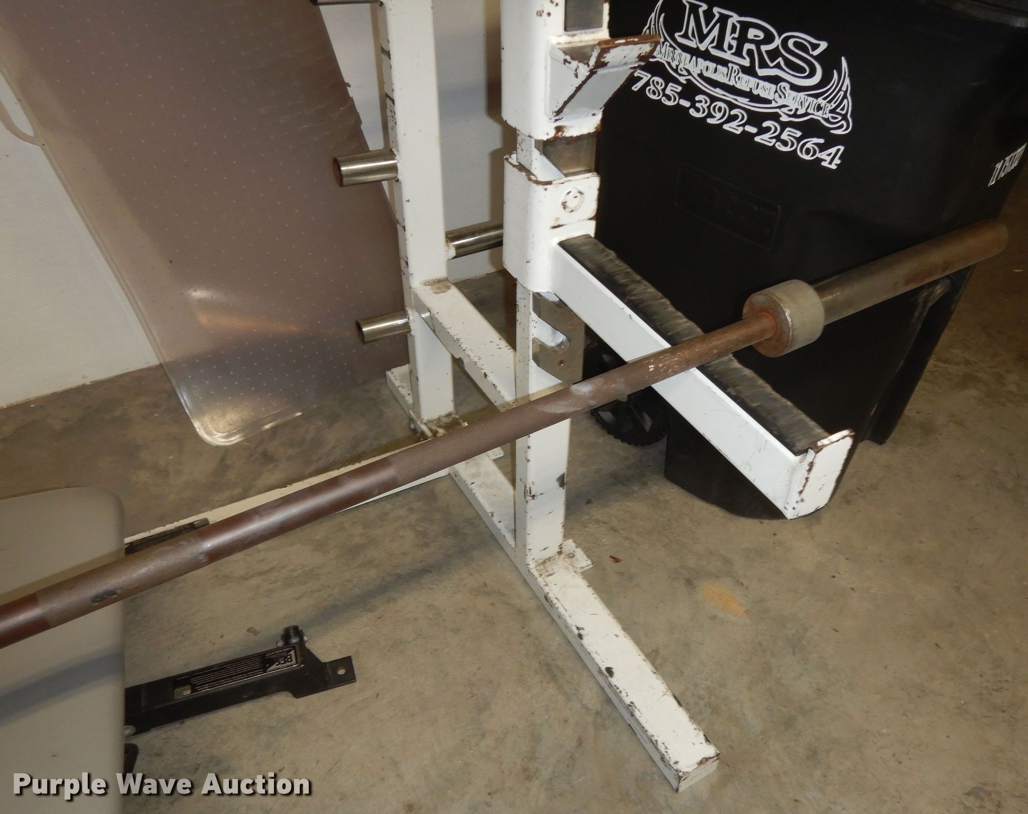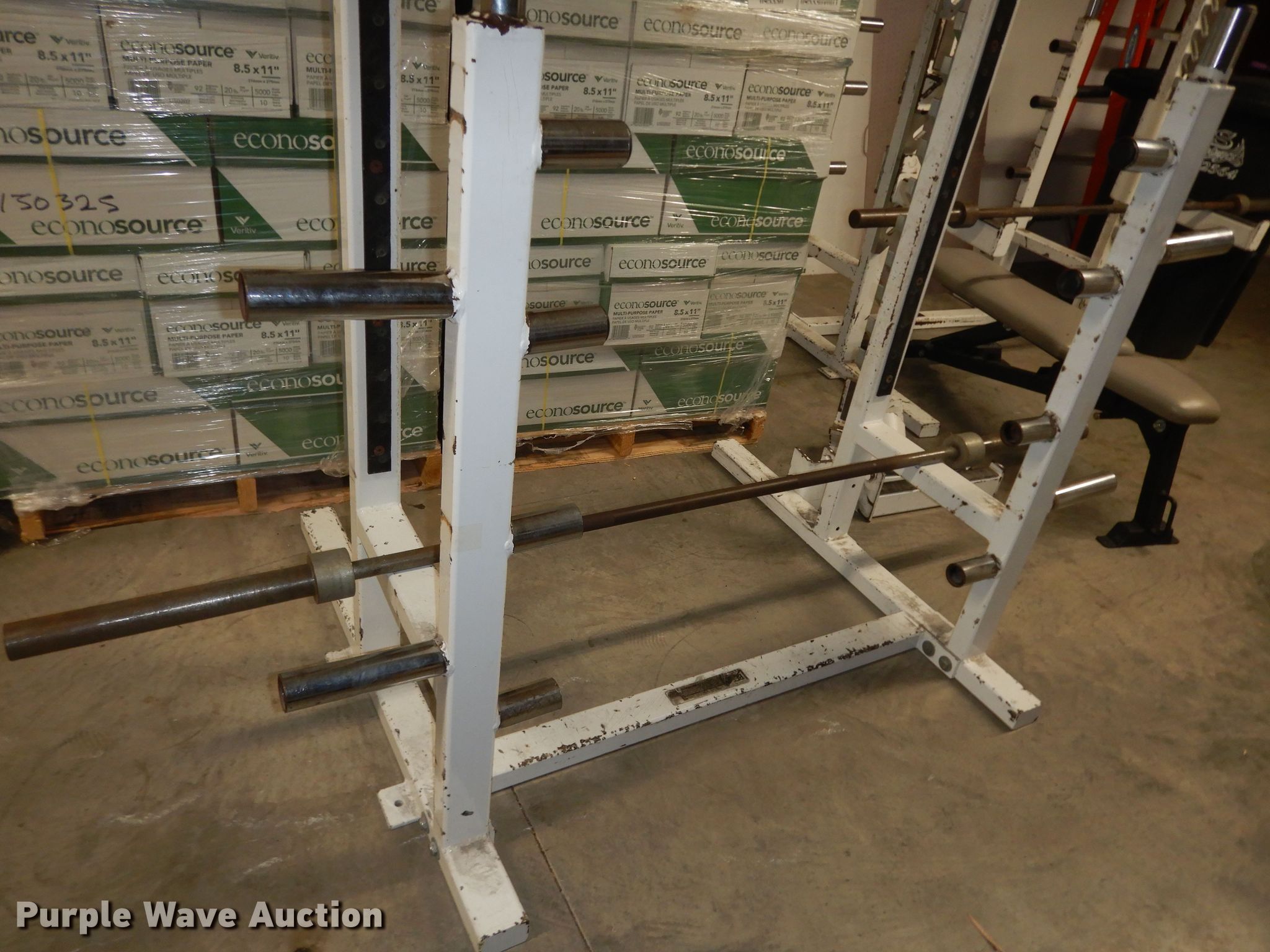 Purple Wave is selling a used Sporting Goods in Kansas. This item is a (2) BFS squat racks with the following: 95" H, (2) barbells, Bench