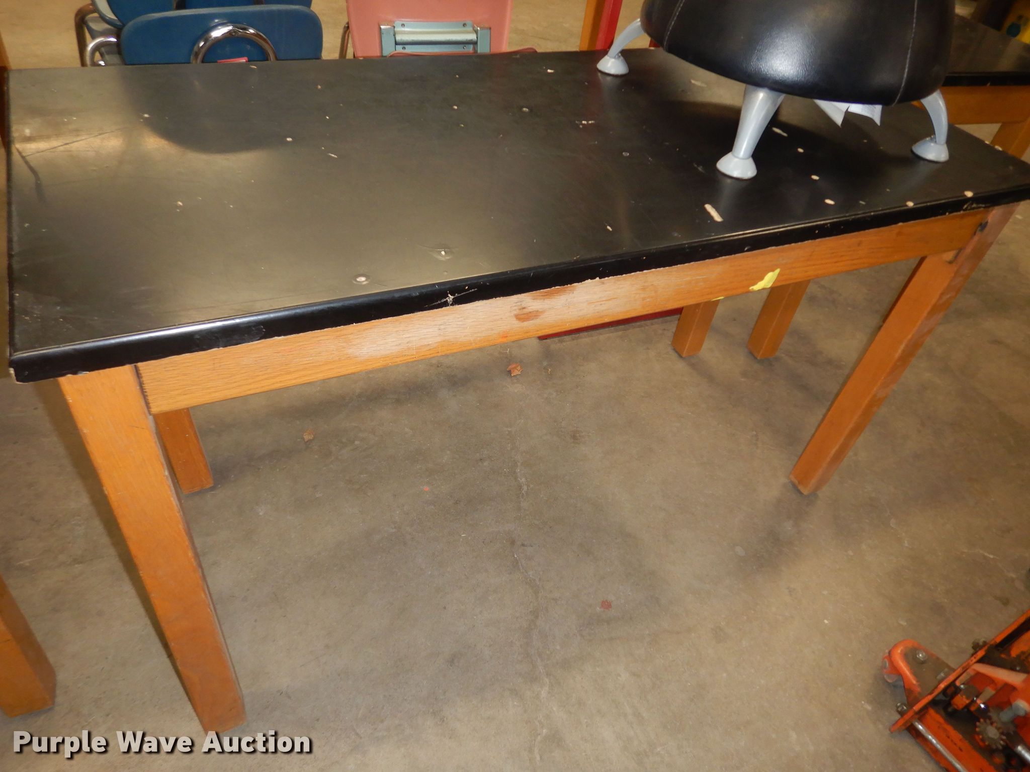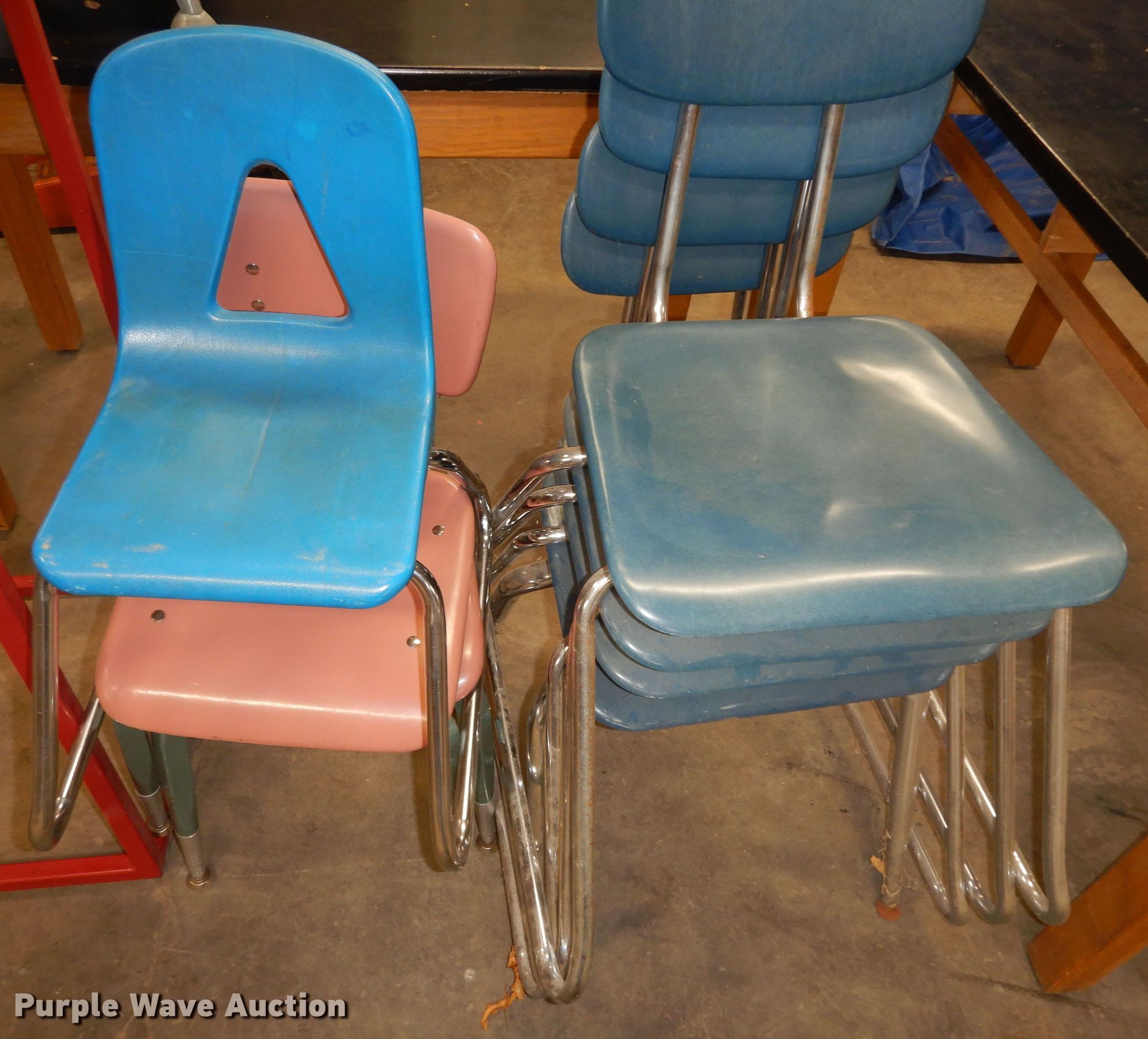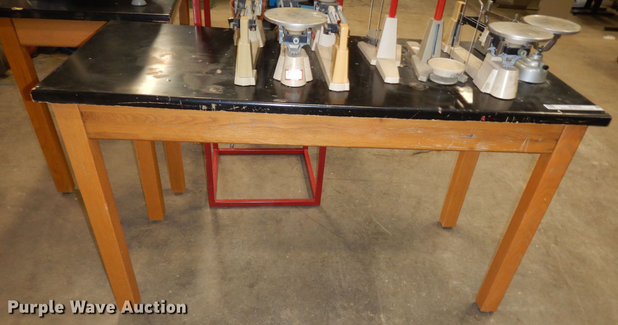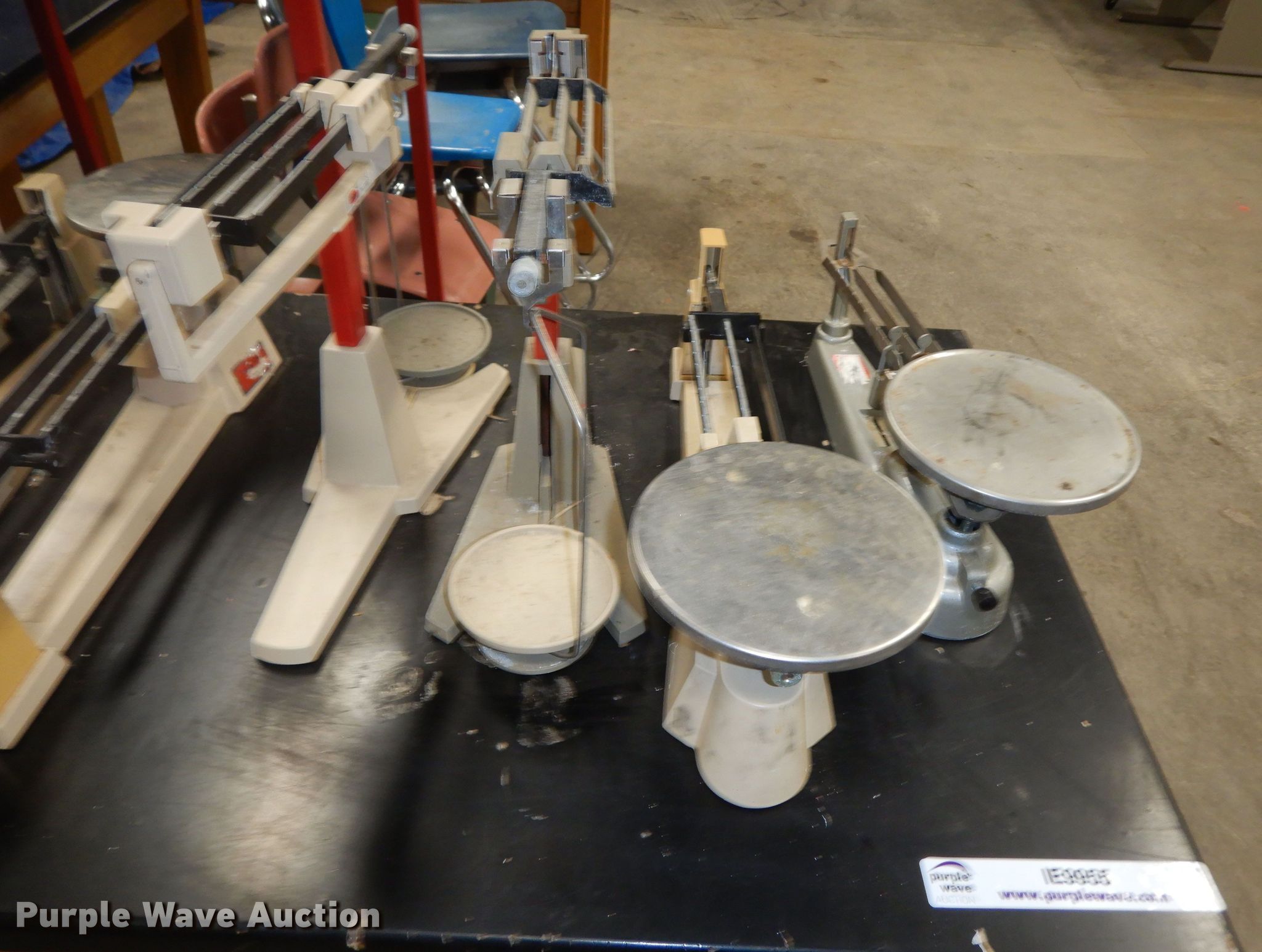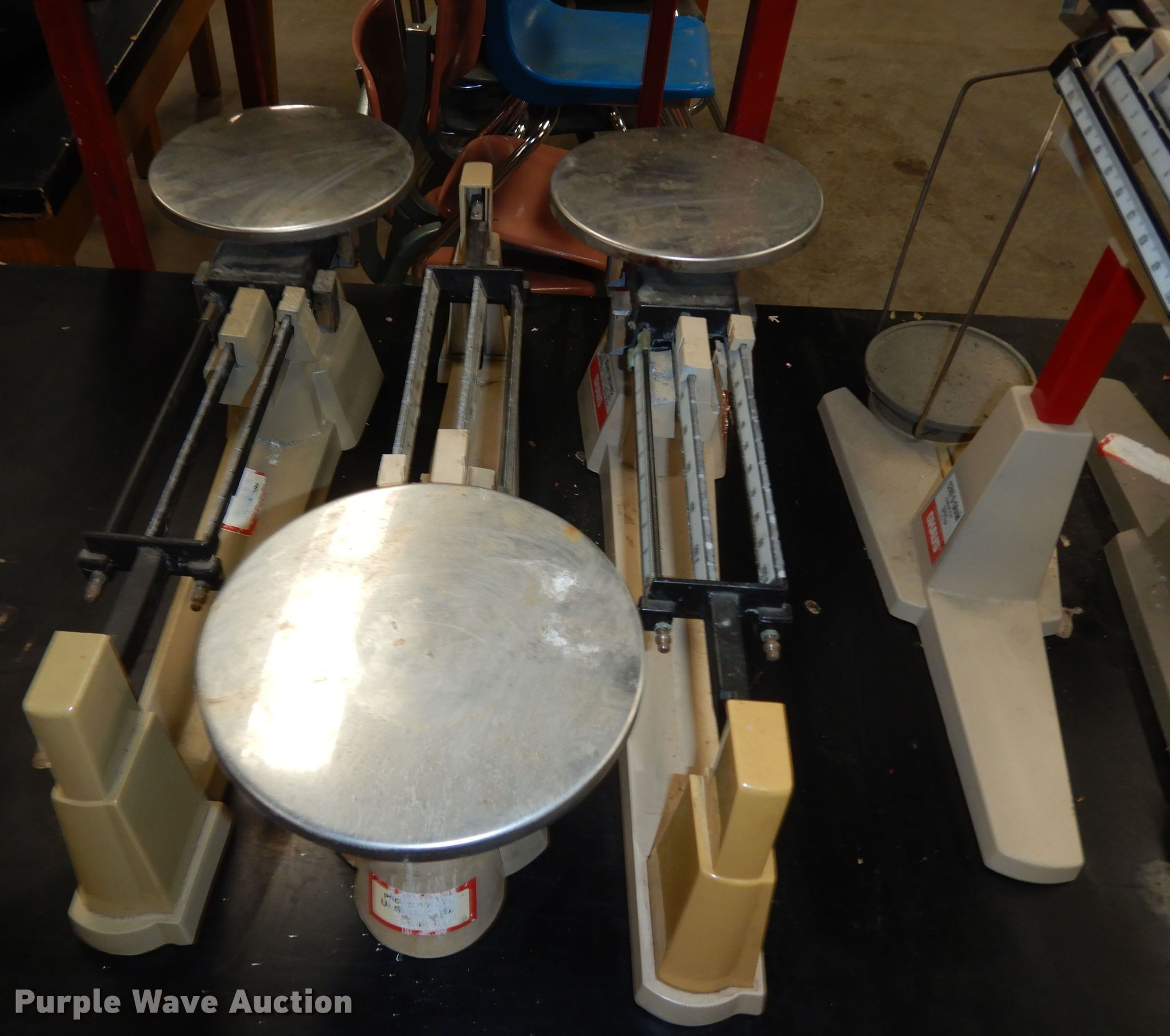 Purple Wave is selling a used Office Supplies and Equip. in Kansas. This item is a Office supplies and equipment with the following: (7) chairs, (7) scales, (3) tables