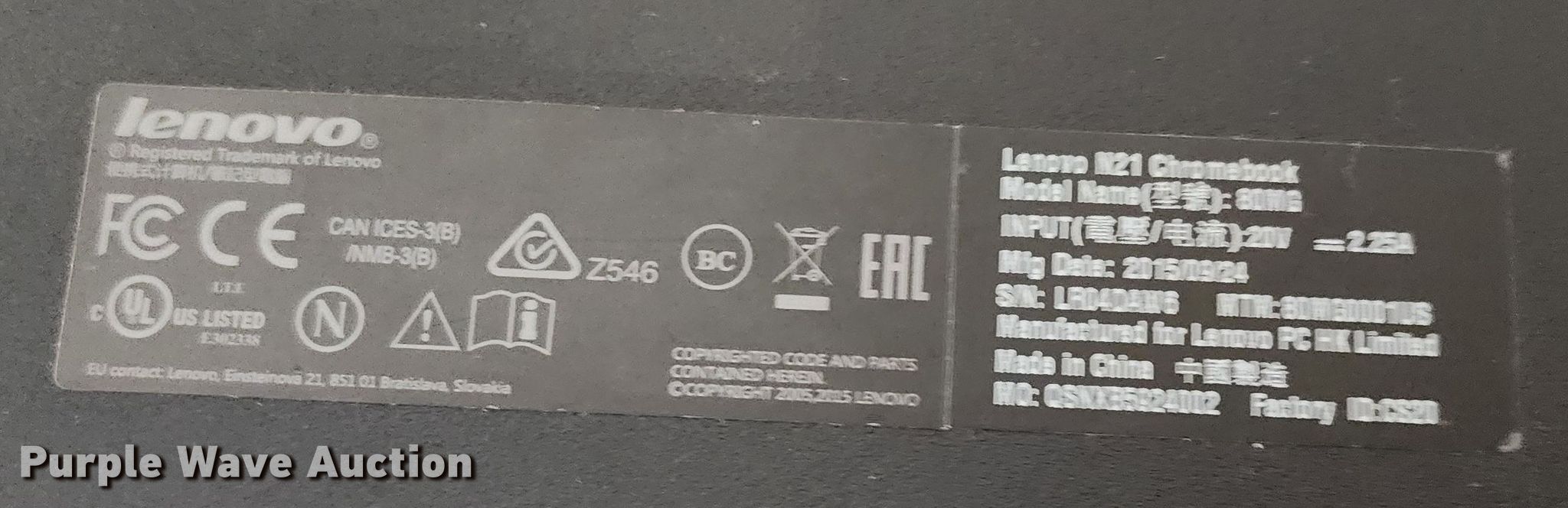 (9) Lenovo N21 Chromebook laptops. No power adapters. Purple Wave reserves the right to obtain additional buyer information prior to item removal. Holy Family Elementary. 1800 Milner Street. Hays, KS 67601