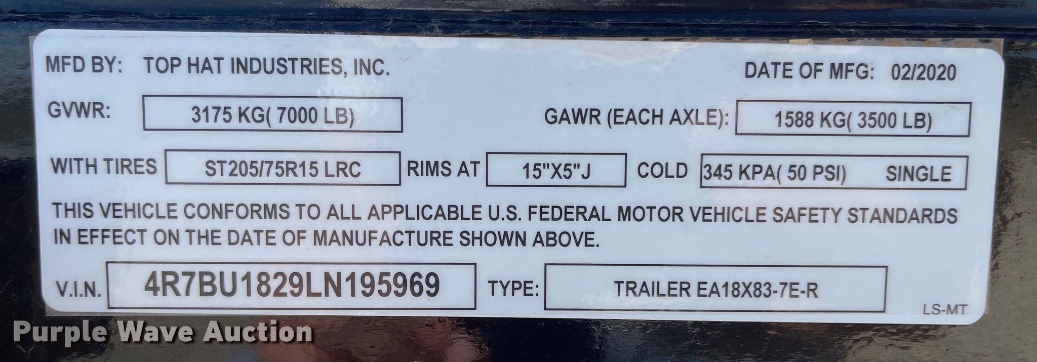 Purple Wave is selling a used Equip. Trailer in Kansas. This item is a 2020 Top Hat equipment trailer with the following: VIN: 4R7BU1829LN195969