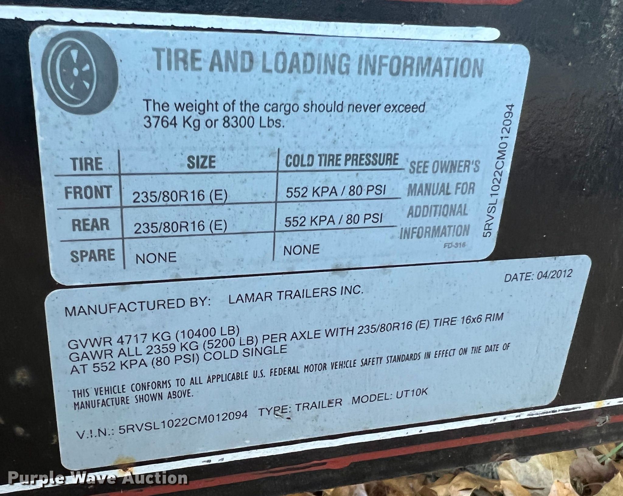 2012 Fermont MEP006A generator. Hours: 184 on meter, VIN: 5RVSL1022CM012094, Serial: FZ-00281. Engine Allis-Chalmers 3500, Serial: 3D-21607, Cylinders: 4, Fuel type: Diesel. Features Generator General Electric 70-1900, kVA: 75, kW: 60, Phase: Three, Electric start, Fuel tank, Skid mounted. Trailer 2012 Lamar 2094 UT10K, 10' 2" L x 60" W, Ball hitch size: 2", Suspension: Spring, Brakes: Electric, Axles: Tandem, Tire size: ST235/80D-16, GVWR: 10,400 lbs, GAWR: 5,200 lbs. Transfer of ownership documentation will be a bill of sale. Maries County Sheriff's Office. 631 Airport Drive. Vichy, MO 65580