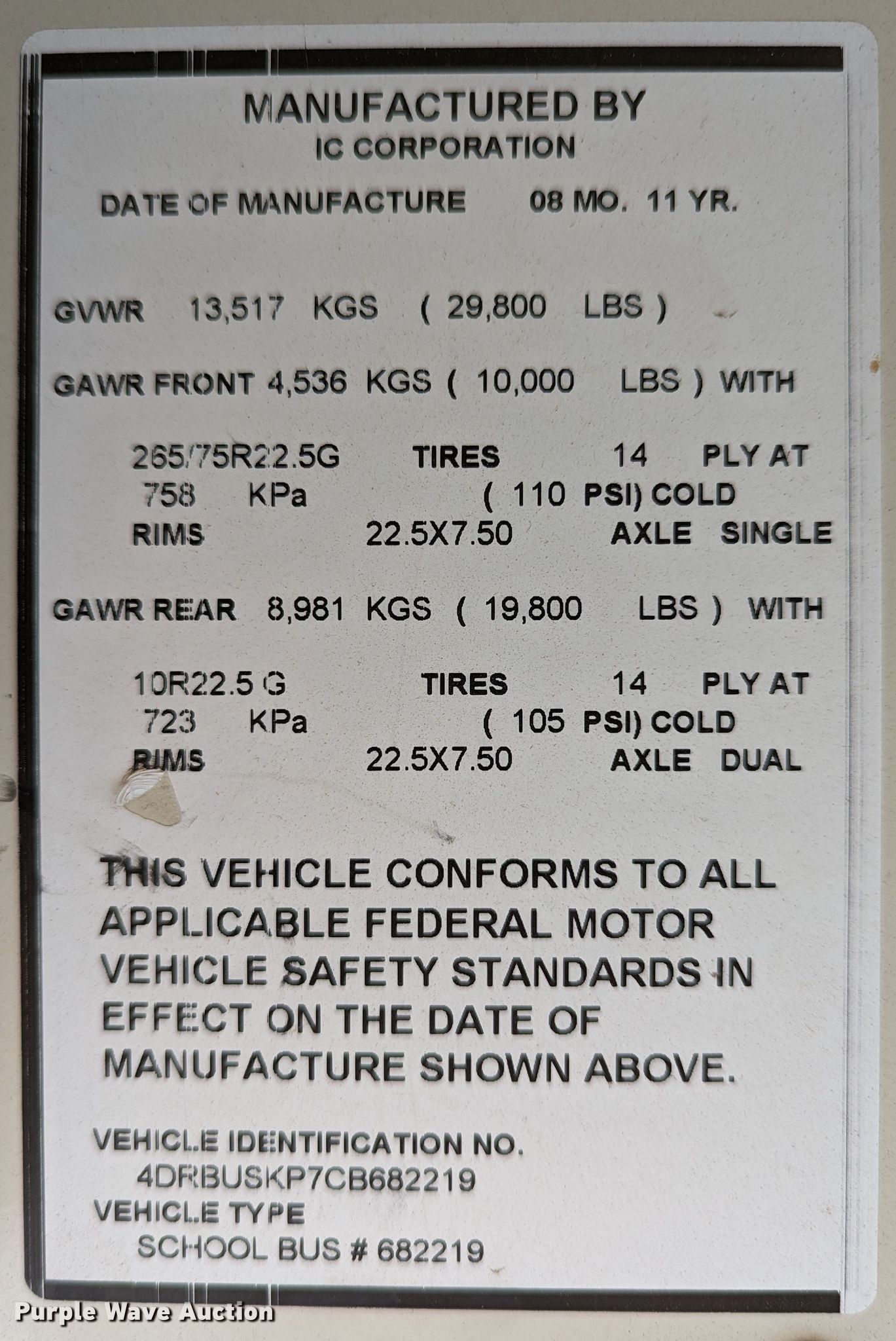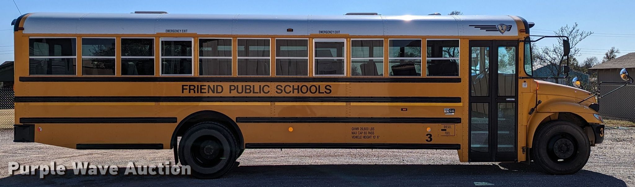 2012 International 3000 school bus. Miles: 52,515 on odometer, Hours: 1,929 on meter, VIN: 4DRBUSKP7CB682219, Unit #: 3. Engine International MaxxForce 7, Displacement: 6.4L, Cylinders: 8, Fuel type: Diesel. Transmission Automatic. Chassis Axles: Single, Suspension: Spring, Brakes: Hydraulic, GVWR: 29,800 lbs. Interior Heat, Heated mirrors, Cruise control, Passengers: 65. Tires Size: 11R22.5. Oklahoma title. Title distribution may be delayed up to 14 days from verification of funds. Friend School. 1307 County Road 1350. Chickasha, OK 73018