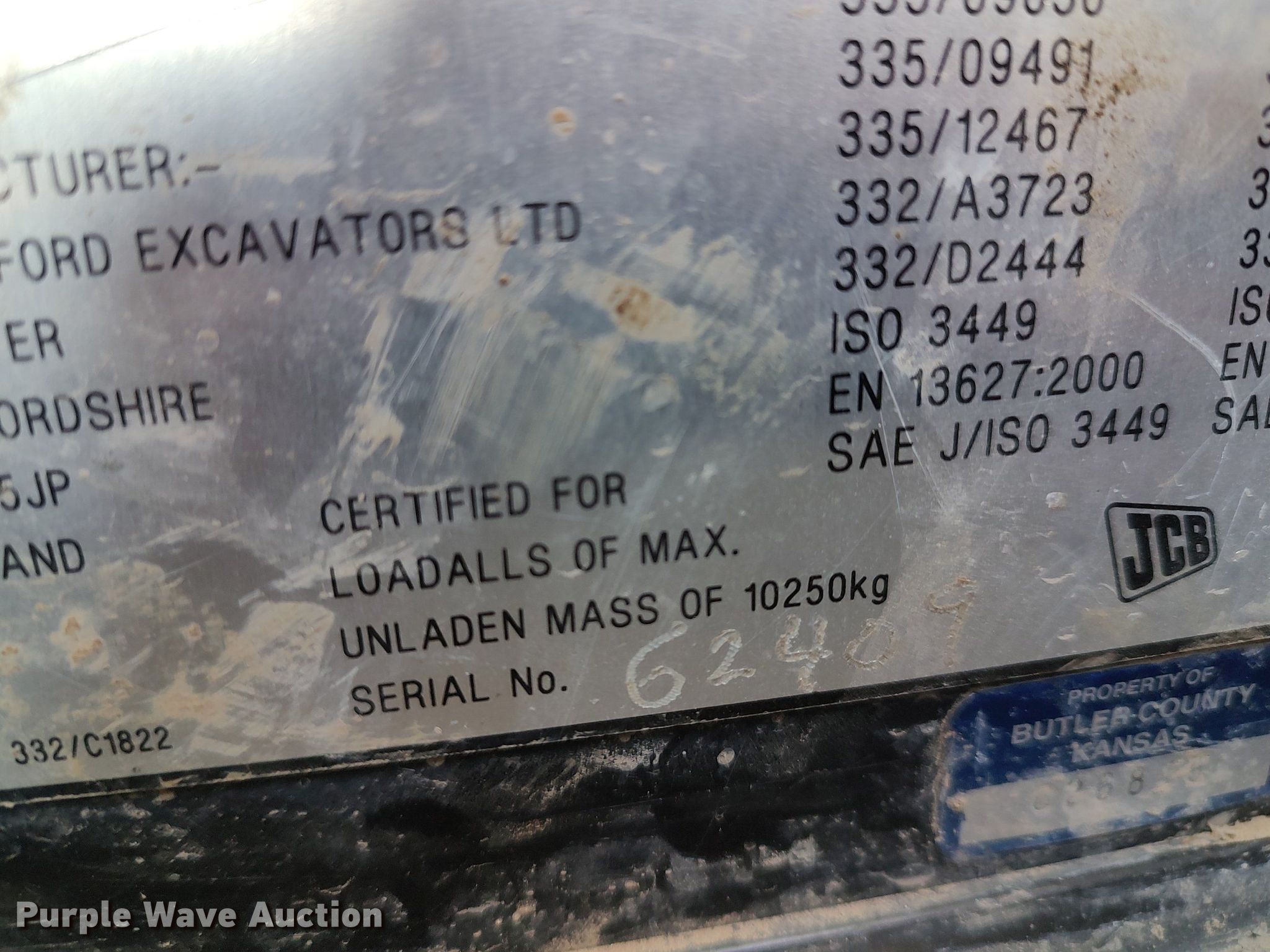 JCB 541-70 telehandler. Hours: 9,595 on meter. Engine Serial: SF320/40201 U2560911, Displacement: 4.40L, Cylinders: 4, Fuel type: Diesel, kW: 74.2. Transmission Powershift, Four wheel drive. Operators station EROPS, AC, Heat, Steering: Crab, Four wheel. Features Maximum lift capacity: 9,000 lbs, Maximum lift height: 23', Boom stages: 2, Fork length: 48", Quick attach: Manual, Bucket size: 95", Grapple bucket size: 95". Tires Size: 15.5R25. Butler County. El Dorado, KS 67042