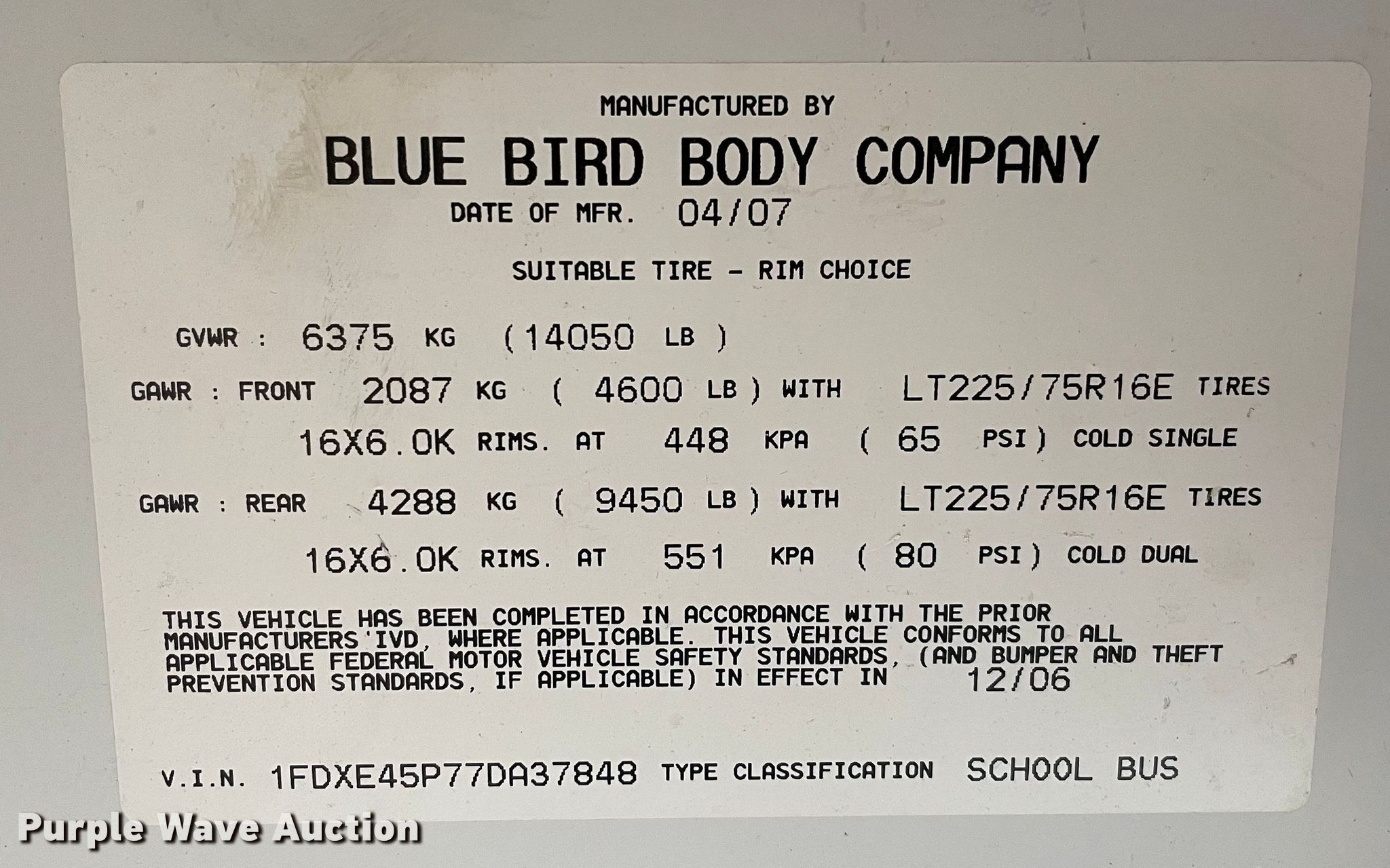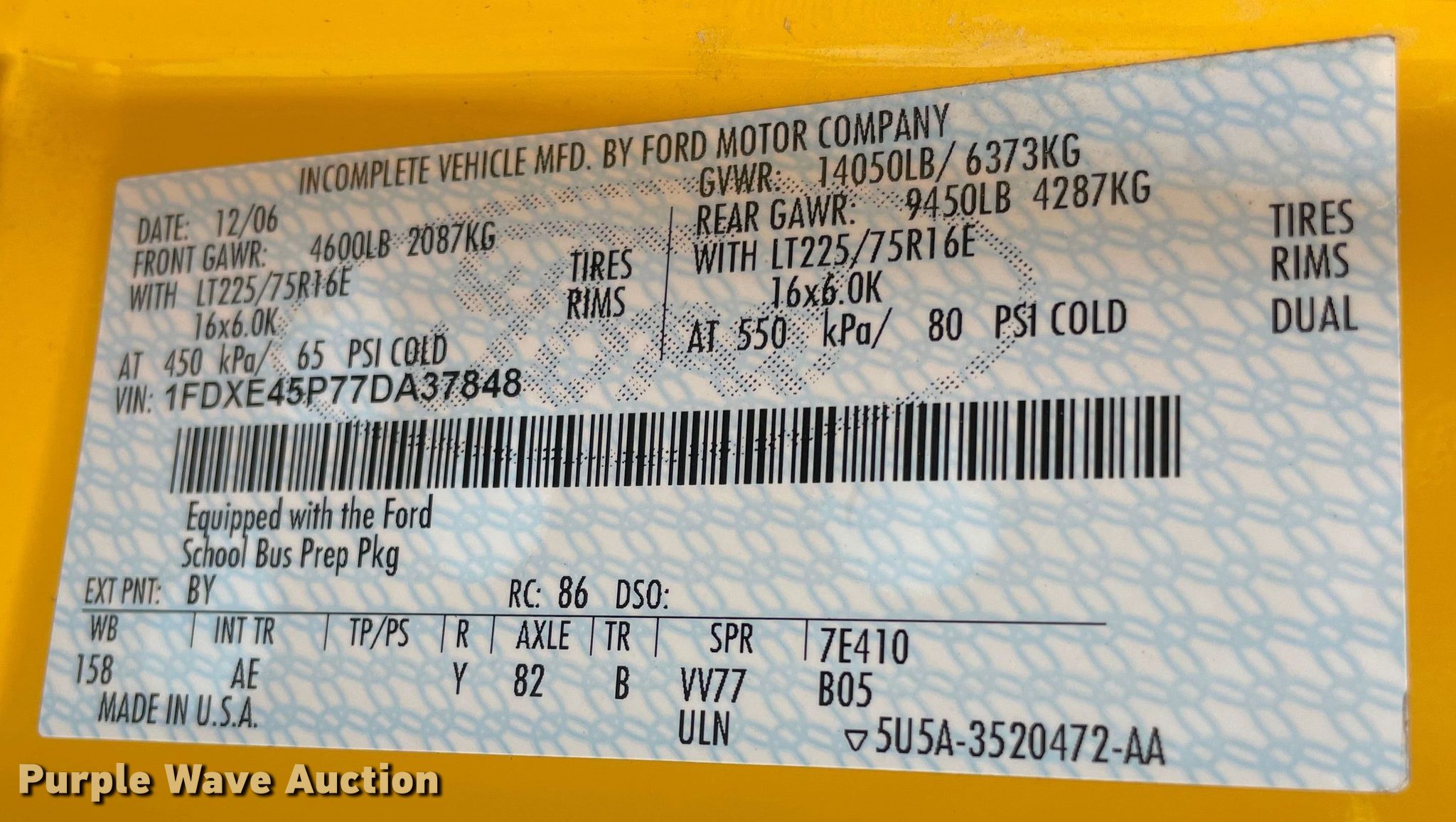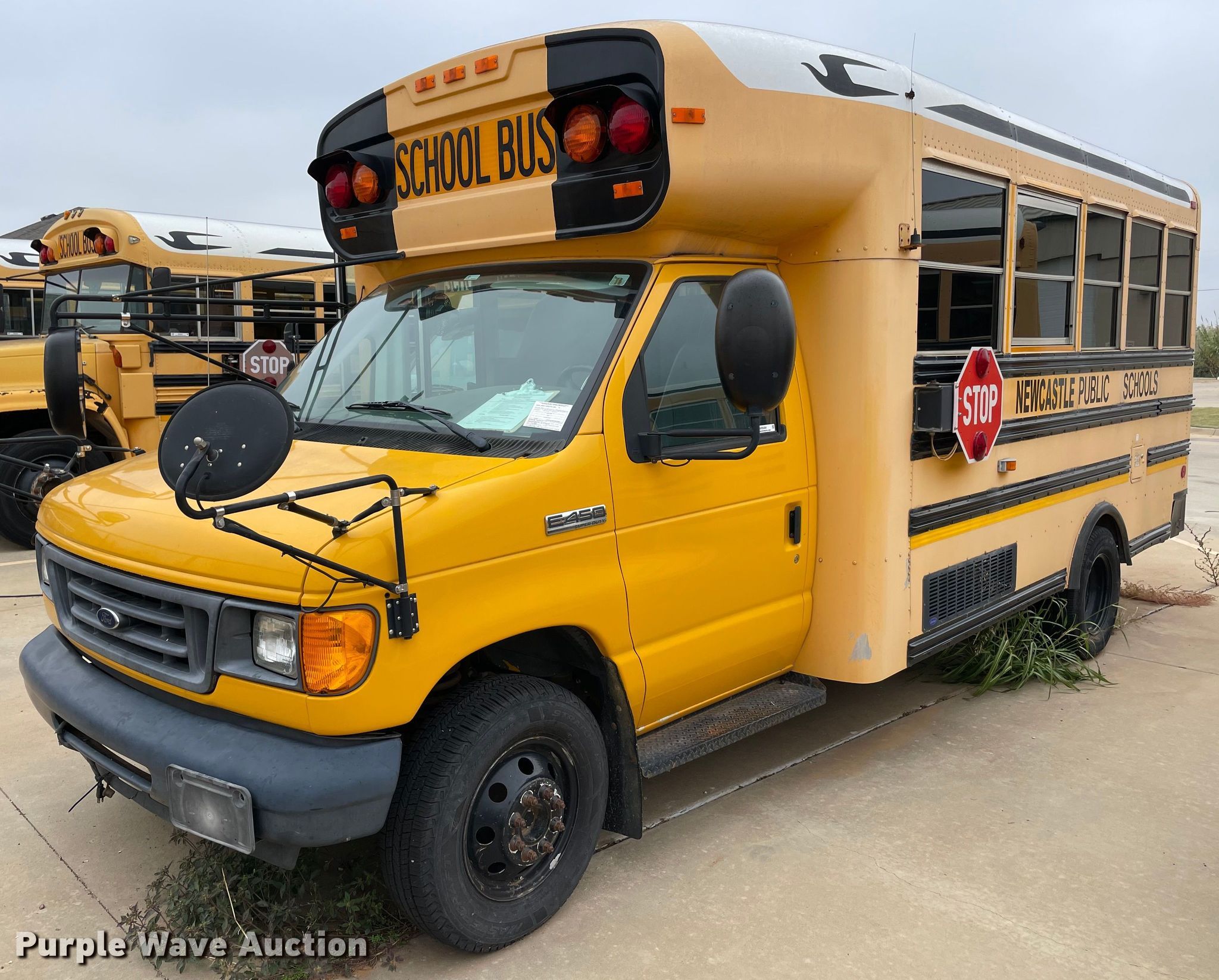 2007 Ford E450 Super Duty school bus. Miles: 35,079 on odometer, VIN: 1FDXE45P77DA37848. Engine Displacement: 6.0L, Cylinders: 8, Fuel type: Diesel. Transmission Automatic. Chassis Axles: Single, Suspension: Spring, Brakes: Hydraulic, GVWR: 14,050 lbs. Interior AC, Heat, Auxiliary controls, Passengers: 30, Wheelchair lift. Tires Size: LT225/75R16. Notes Dead battery, Non-operational unit. Oklahoma title. Newcastle Public Schools. 917 Northeast 2nd Street Place. Newcastle, OK 73065