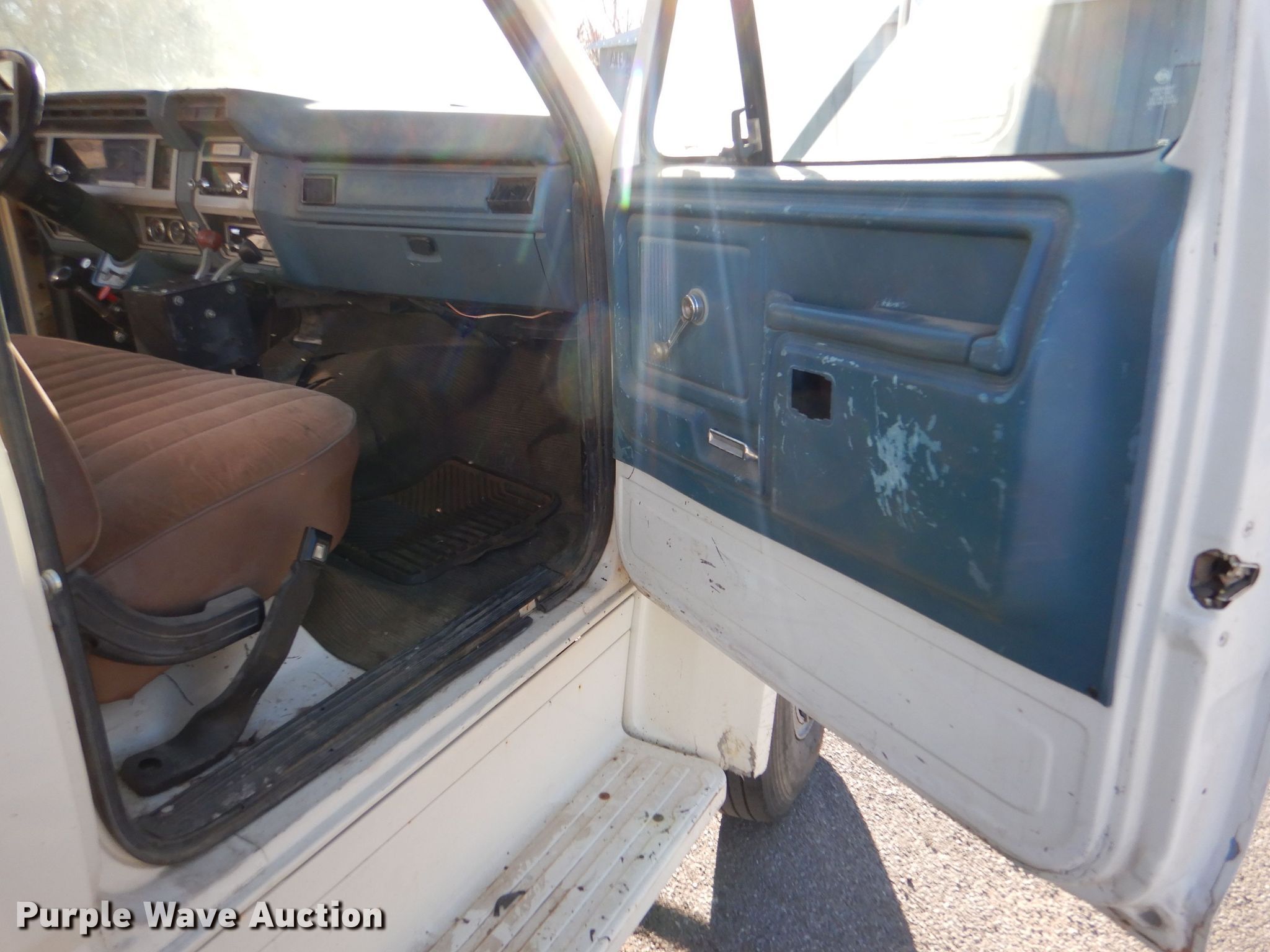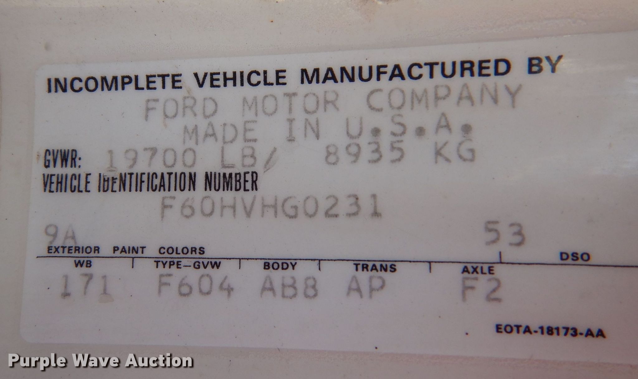 Ford dump truck. Miles: 72,839 on odometer, VIN: F60HVHG0231, Unit #: 203. Engine Displacement: 6.1L, Cylinders: 8, Fuel type: Gas. Transmission Manual, Speed: 5, plus 2. Chassis Axles: Single, Suspension: Spring, Brakes: Hydraulic, PTO, GVWR: 19,700 lbs. Features Dump bed 10' L x 92" W, Side height: 30", Bed type: Steel, Ram: Single. Tires Size: 9.00R20. Kansas title. City of Meade. 623 Carthage St. Meade, KS 67864