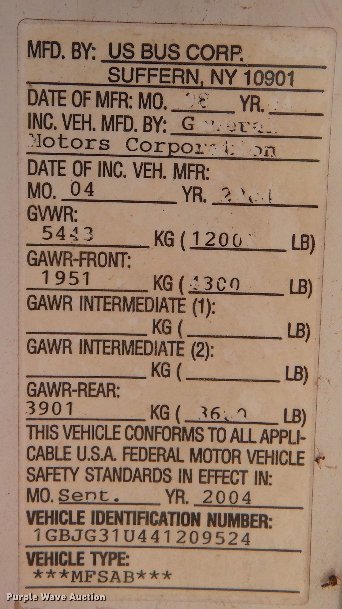 Purple Wave is selling a used Bus in Oklahoma. This item is a 2004 Chevrolet Express G3500 school bus with the following: Miles: 46,679 on odometer, VIN: 1GBJG31U441209524