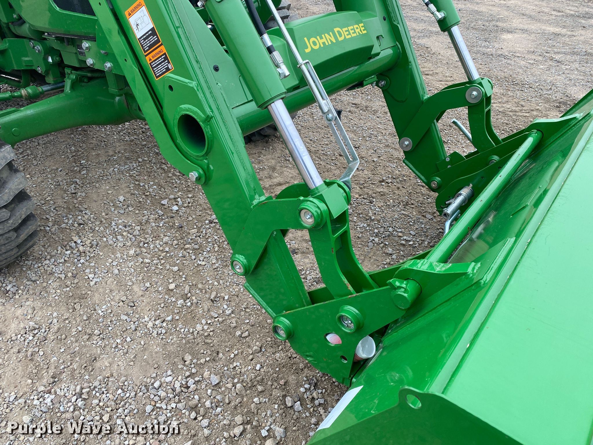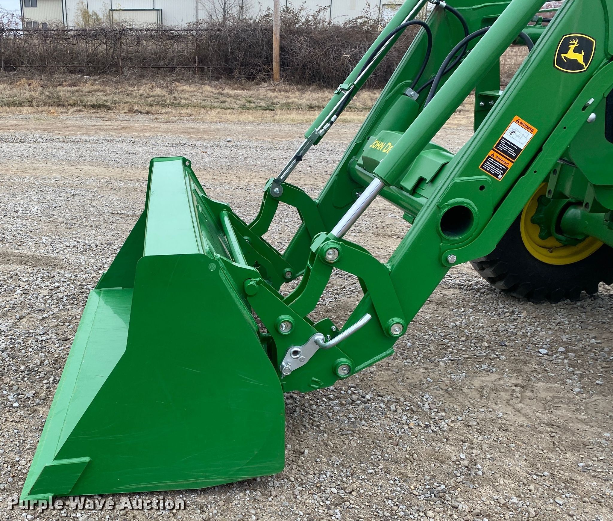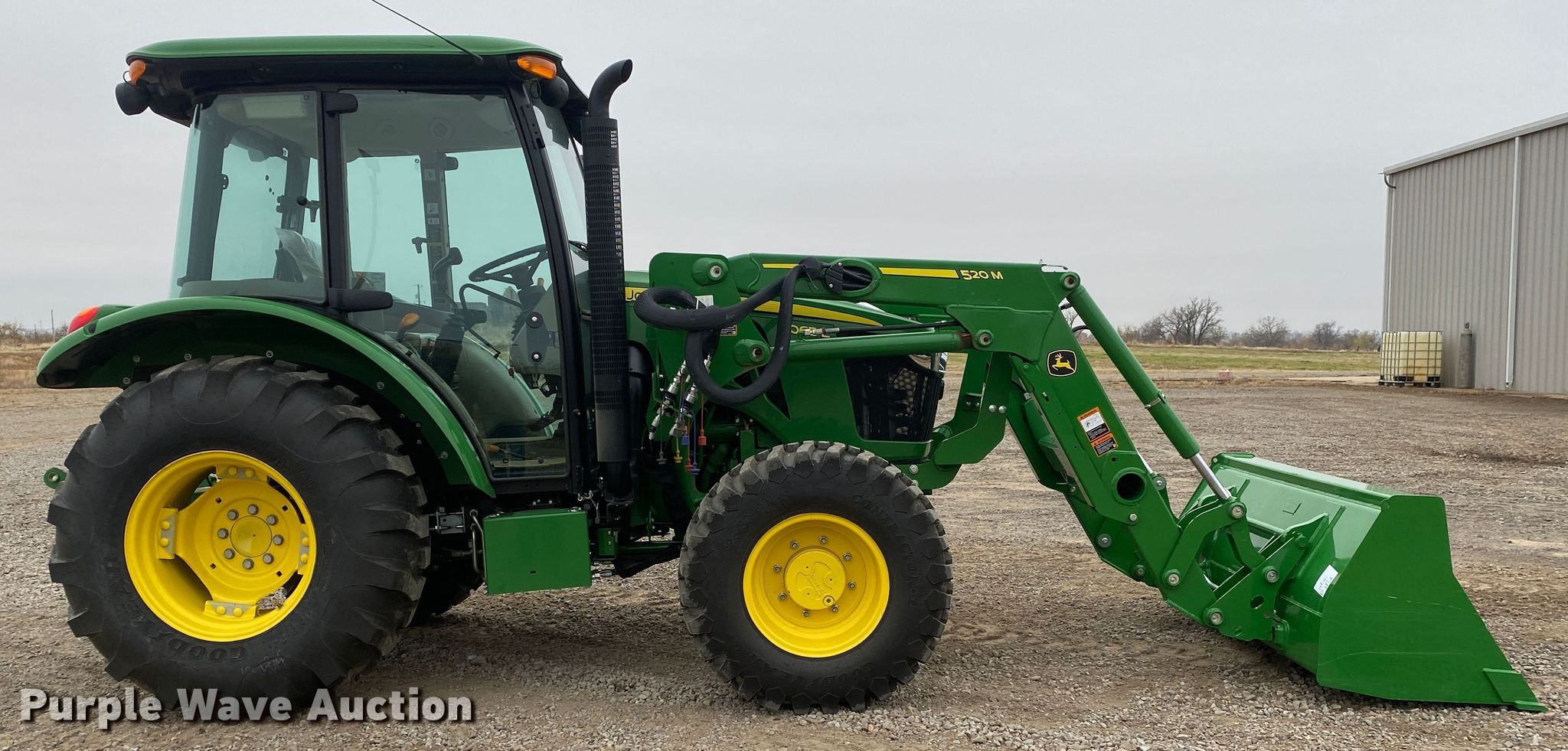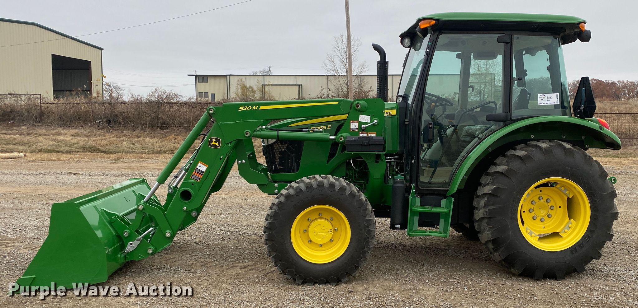 2022 John Deere 5065E MFWD tractor. Hours: 47 on meter, Serial: 1PY5065EJNN409471. Engine John Deere 3029, Serial: PY3029U059460, Displacement: 2.9L, Cylinders: 3, Fuel type: Diesel. Transmission Synchro, 12F - 12R, Left-hand reverser, Differential lock. Operators station AC, Heat. Features PTO: 540, Three point Top link, Seven pin outlet, Rear: 2, Loader John Deere 520M, Controls: Joystick, Bucket Width: 73".. Tires Front: 12.5/80-18 NHS, Rear: 16-9-24. Arkoma, OK 74901