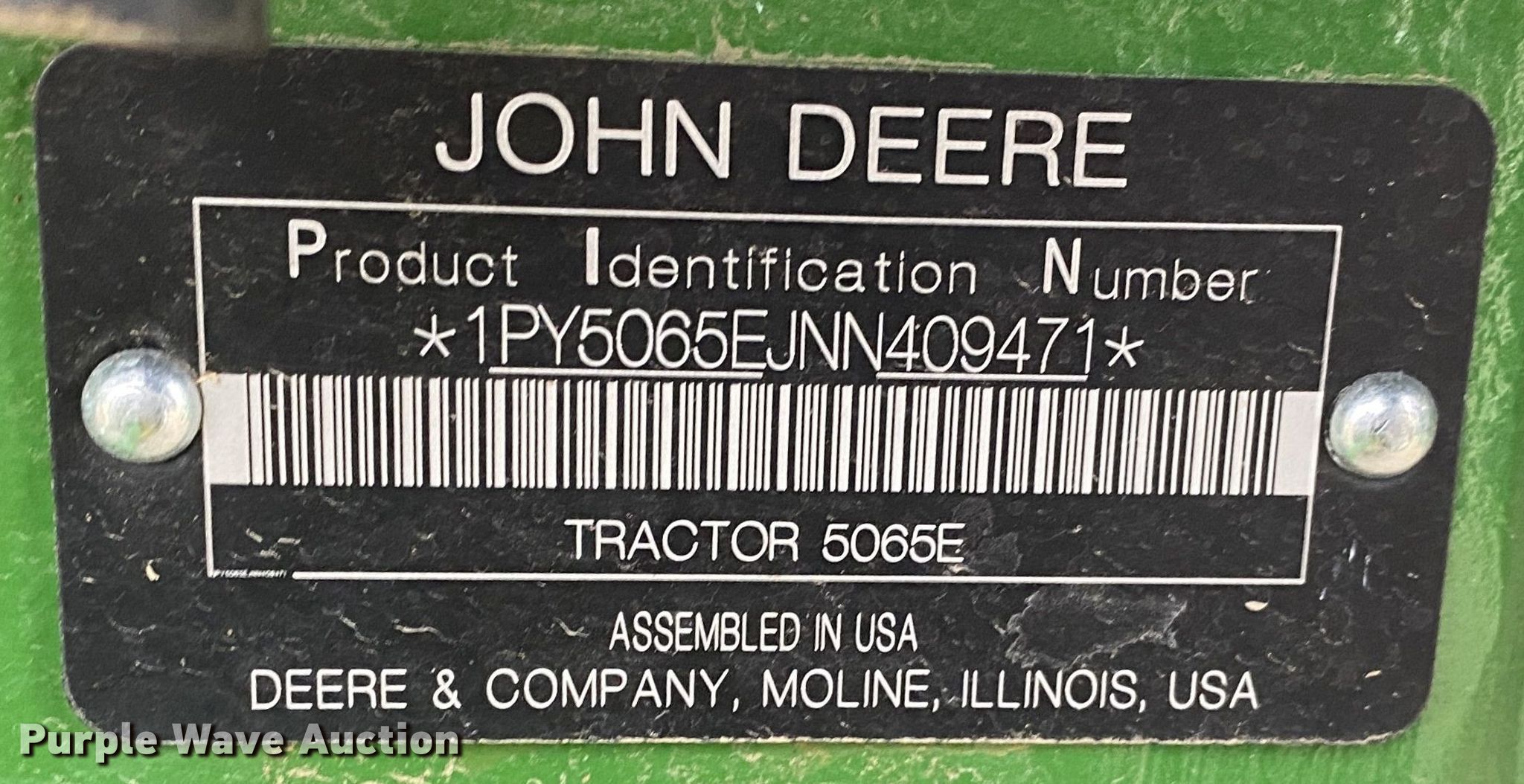 Purple Wave is selling a used Tractor in Oklahoma. This item is a 2022 John Deere 5065E MFWD tractor with the following: Hours: 47 on meter, Serial: 1PY5065EJNN409471