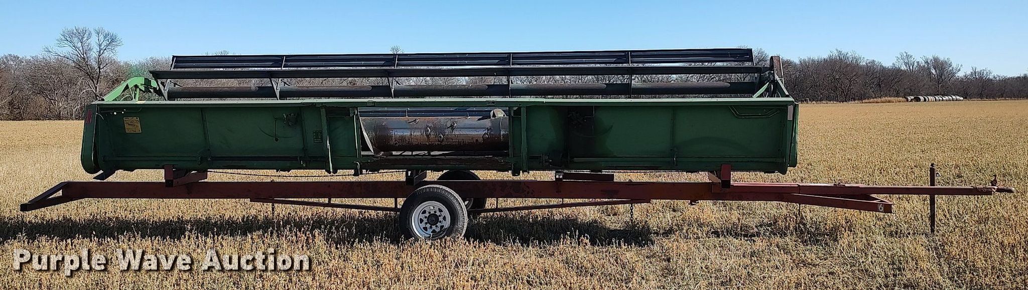 1990 John Deere 925 rigid head. Serial: H00925P635896. Features Width: 25', Reel: Bat Hydraulic reel height control, Skid plates: Steel, Drivelines: Dual. Trailer 36' 7" L x 60" W, Ball hitch size: 2", Axles: Single, Tire size: 7.00-15. Losey Land & Cattle Retirement Auction - Open inspection Dec. 20 and 27. 1230 East 1100 Road. Agra, KS 67621