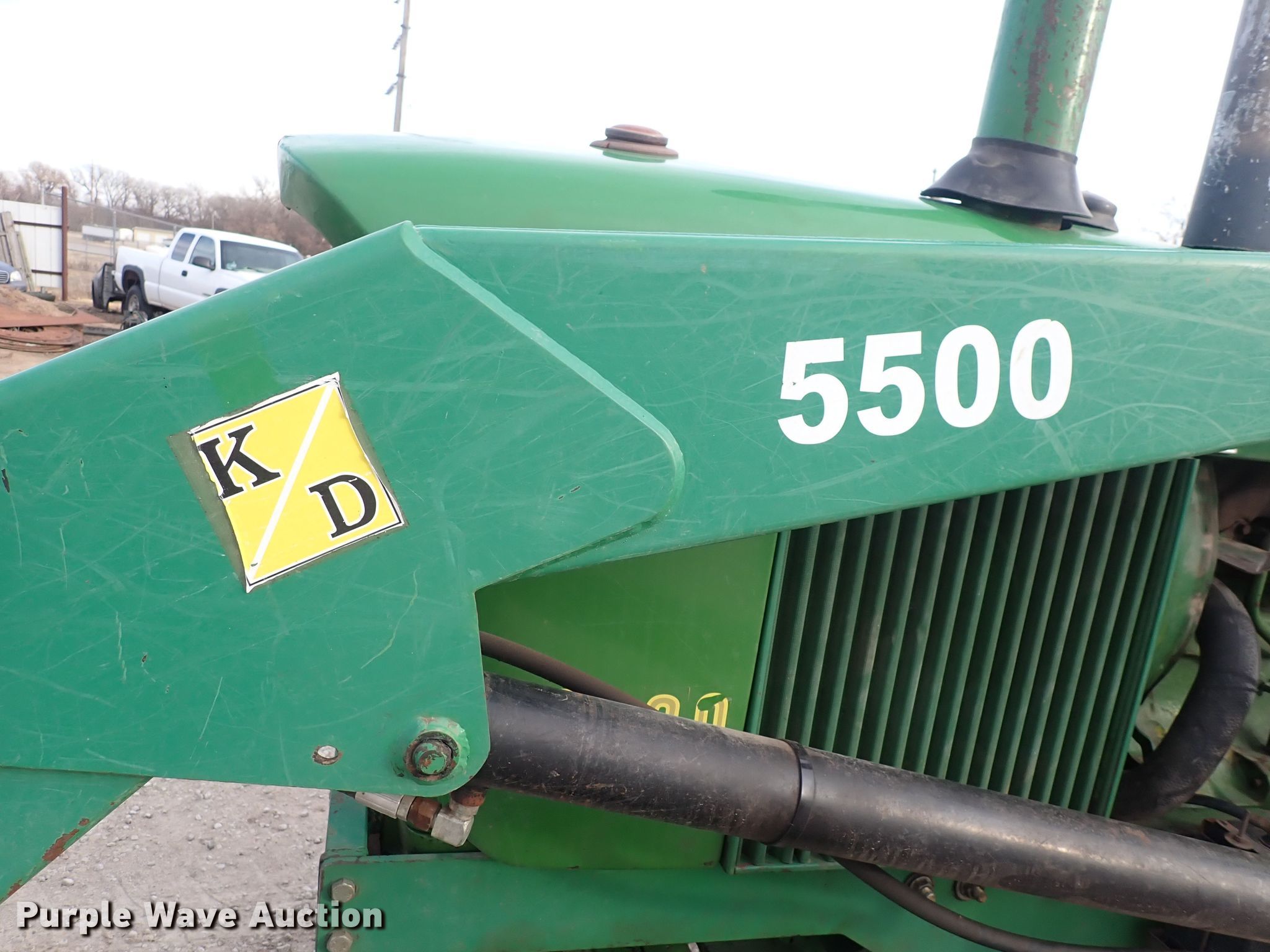 John Deere 4320 tractor. Hours: 542 on meter. Engine John Deere, Serial: 6404TR-04, Cylinders: 6, Fuel type: Diesel. Transmission Synchro, 8F - 2R. Features PTO: 1000, Three point Top link, Hydraulic remote sets Rear: 2, Loader KD 5500, Controls: Joystick, Bucket Width: 84", Bale forks. Tires Front: 11.00-16, Rear: 18.4-38, Wheel weights: 10. 1313 US-56. Lyons, KS 67554