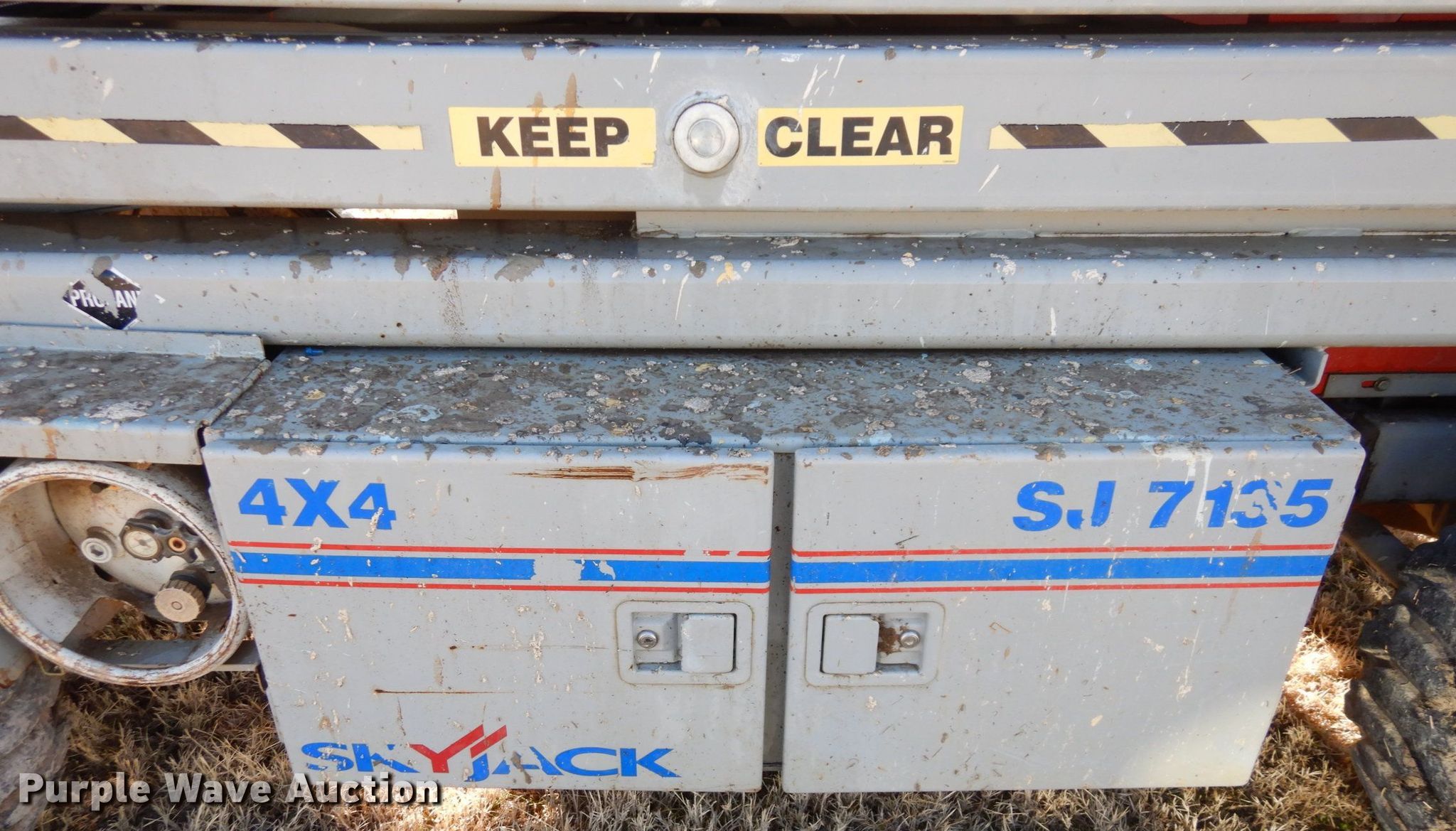 Purple Wave is selling a used Scissor or Vertical Lift in Kansas. This item is a Skyjack SJ7135 scissor lift with the following: Hours: 1,091 on meter, Serial: 34002027