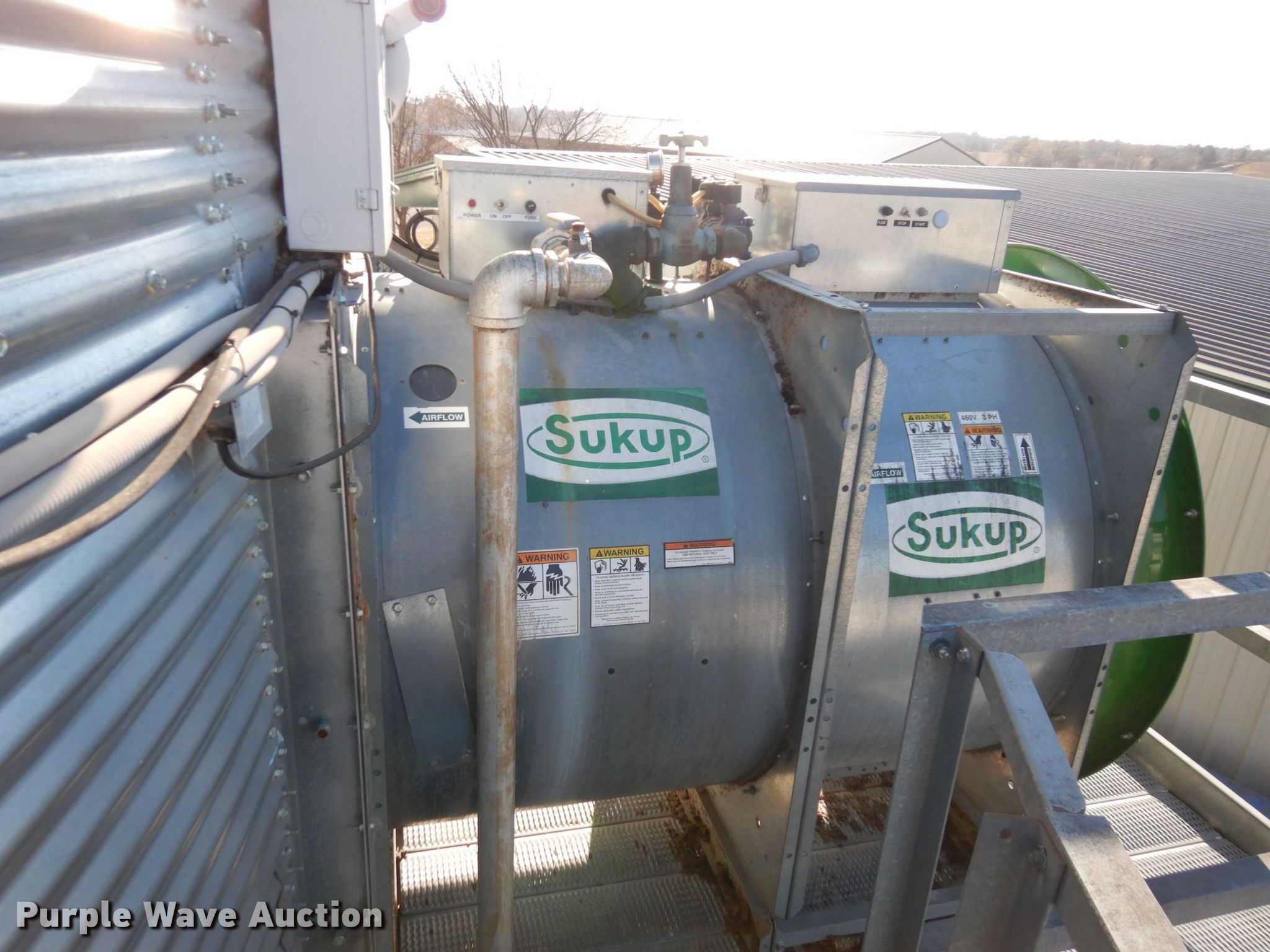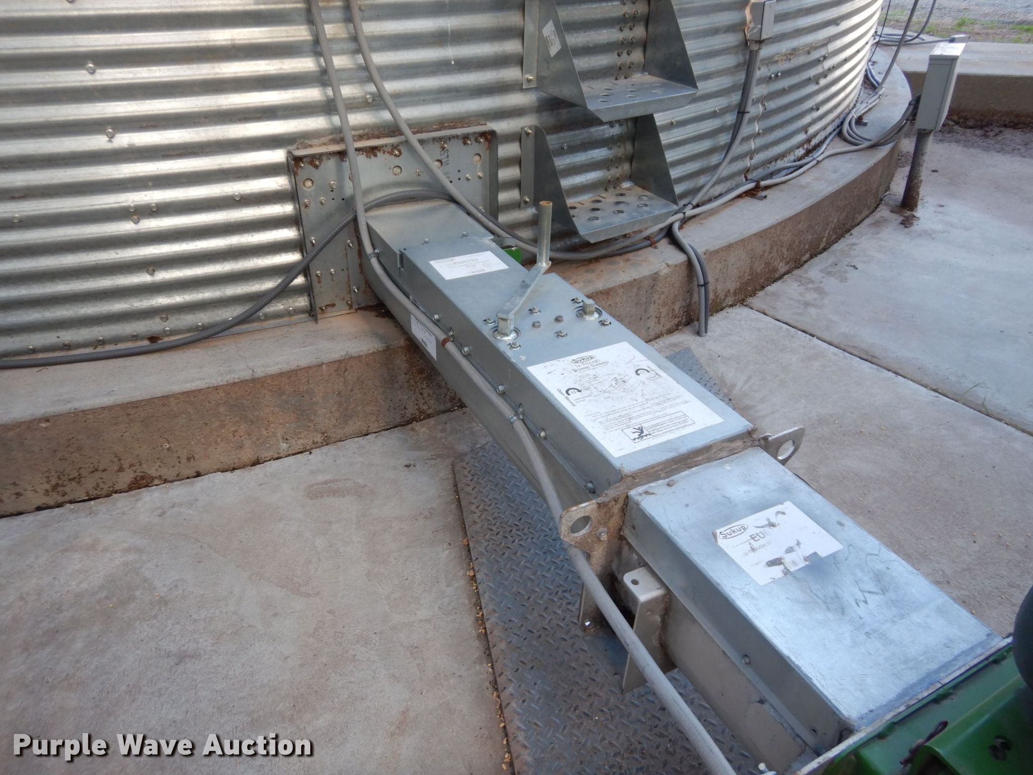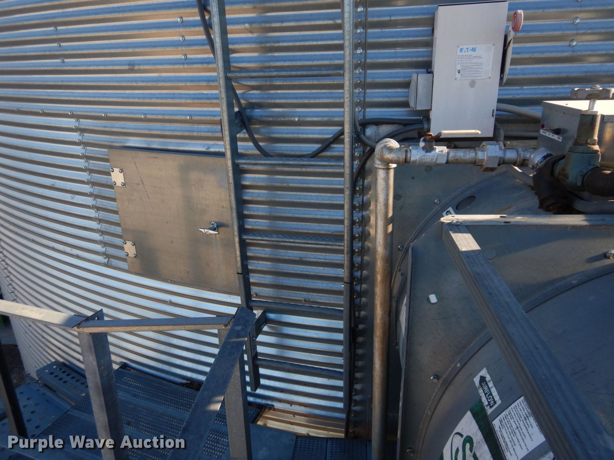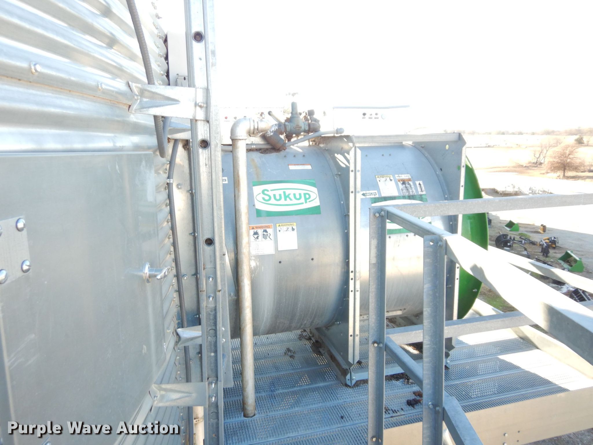 Purple Wave is selling a used Other Grain or Fertilizer Handling in Kansas. This item is a 2014 AGI Ezee-Dry grain bin drying system with the following: MFS Stormor grain bin, 36' diameter, (10) narrow rings, (2) Sukup fans, 30 HP, Driers, Natural gas fired,, Sukup controllers, Sukup U-trough unloader, Floor fan, 5 HP, Stairs, Control panel