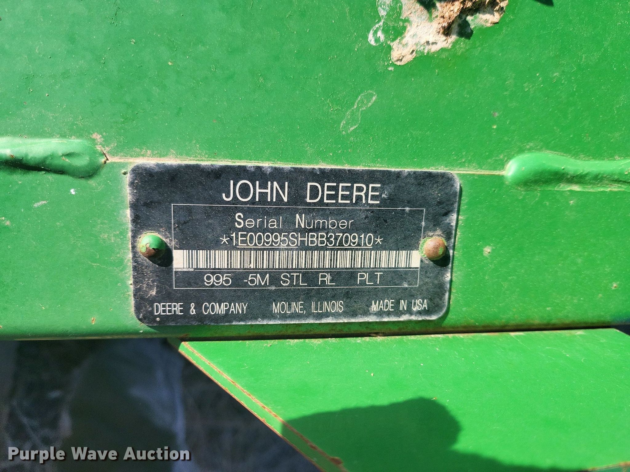 Purple Wave is selling a used Hay Equip. Attach. in Oklahoma. This item is a 2011 John Deere 995 windrower disc head with the following: Serial: 1E00995SHBB370910