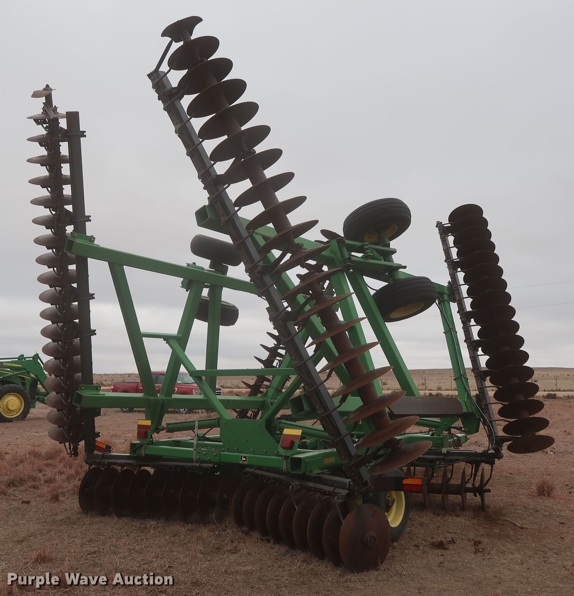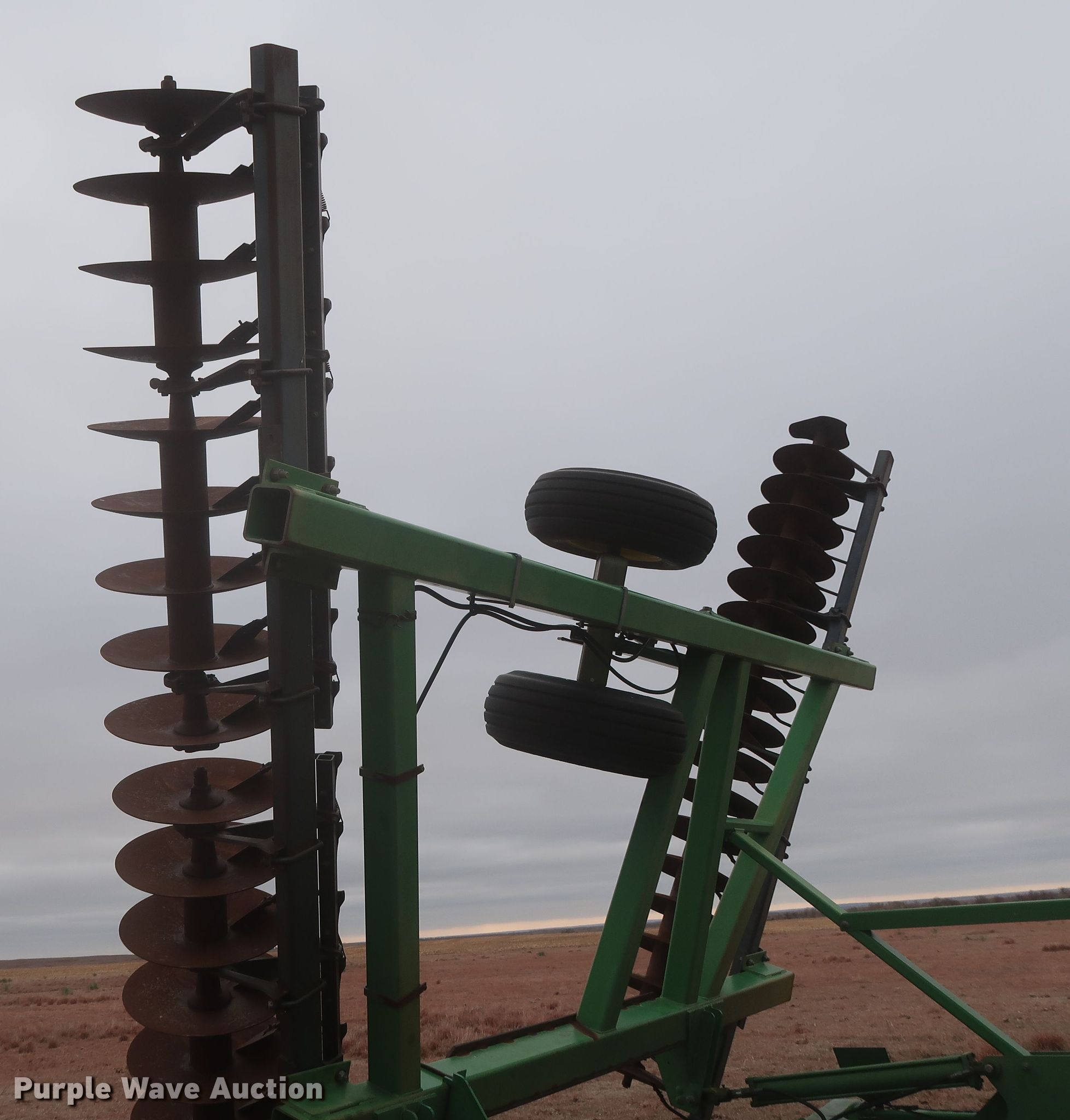 John Deere 637 tandem disk. Overall width: 37' 10", Serial: N00637X001603. Features Front blades Diameter: 22", Spacing: 9", Rear blades Diameter: 22", Spacing: 9", Disk scrapers, Operation Hydraulic lift, Hydraulic fold, Leveler: Manual, Attachments Transport lights. Tires Tire size: 12.5L-15. Withers Farm. Englewood, KS 67831