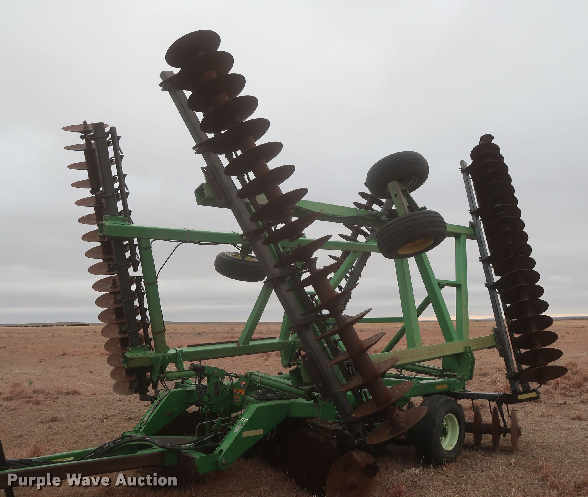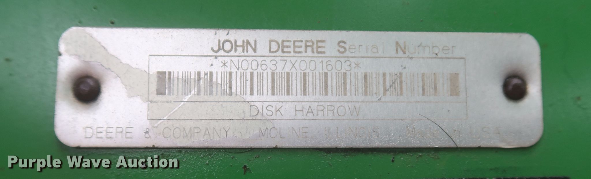 Purple Wave is selling a used Disk in Kansas. This item is a John Deere 637 tandem disk with the following: Overall width: 37' 10", Serial: N00637X001603