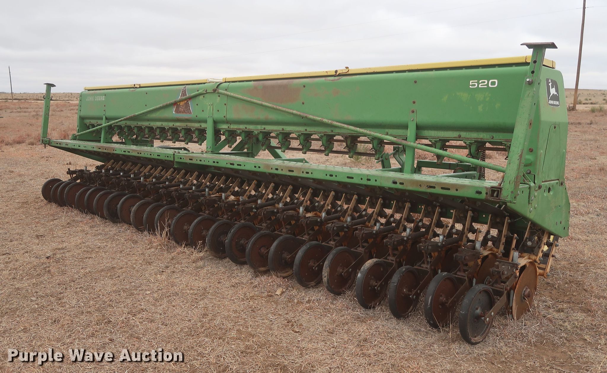 Purple Wave is selling a used Grain Drill or Seeder in Kansas. This item is a John Deere 520 grain drill with the following: Width: 20', Row units: 24, Row spacing: 10", Serial: 000709N