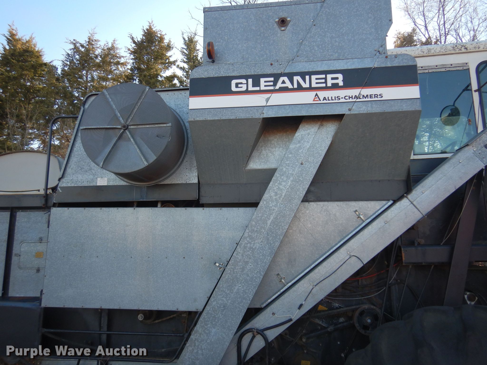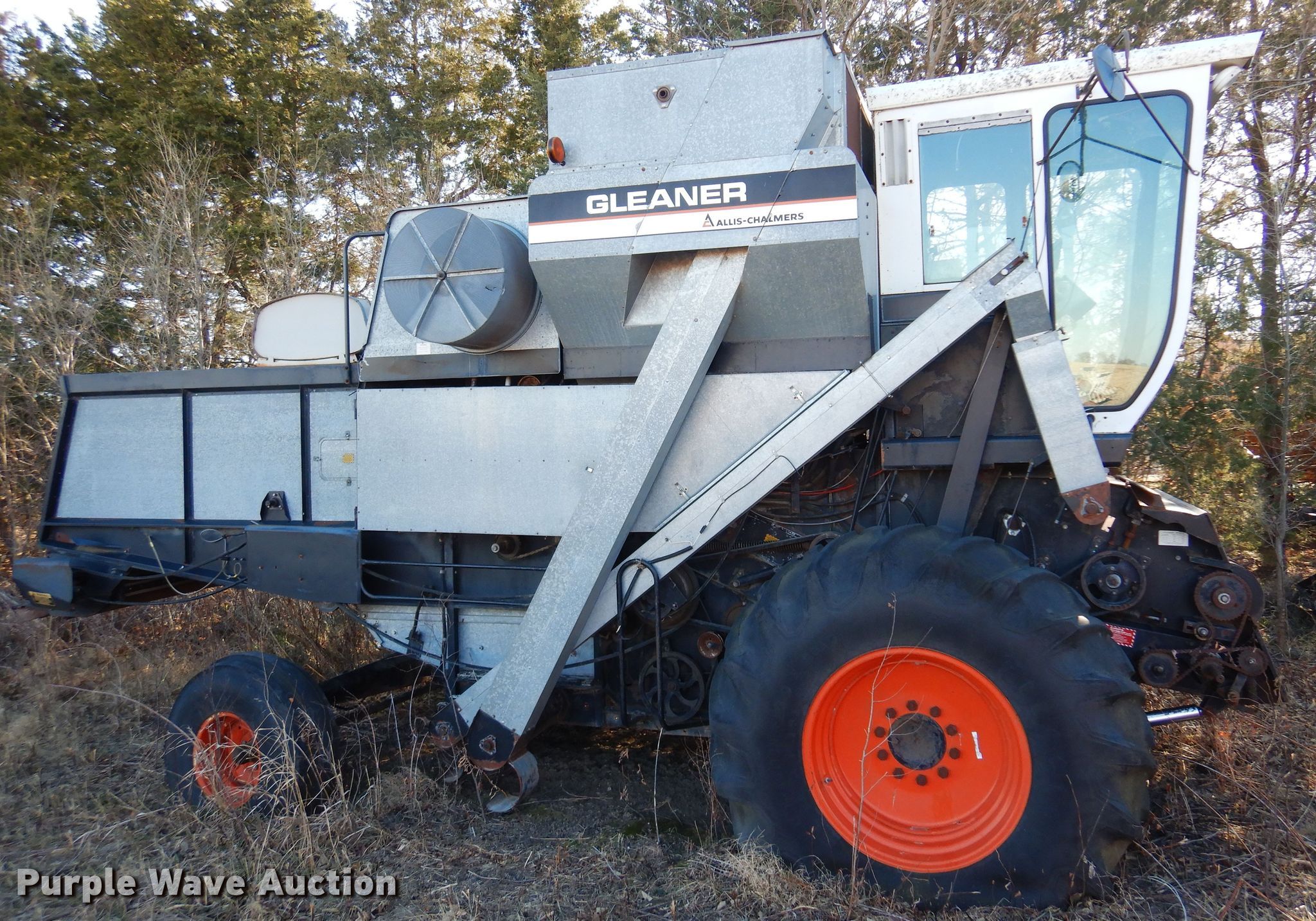 Gleaner M combine. Serial: M7633. Engine Cylinders: 6, Fuel type: Diesel. Transmission Manual. Interior Heat. Features Feederhouse: Lateral tilt, Variable speed, Straw chopper, Unloading auger length: 12' 4". Tires Front: 23.1-30, Rear: 11.00-16. Notes Parts only, Non-operational unit. Clarence Stroda Estate. Hope, KS 67451