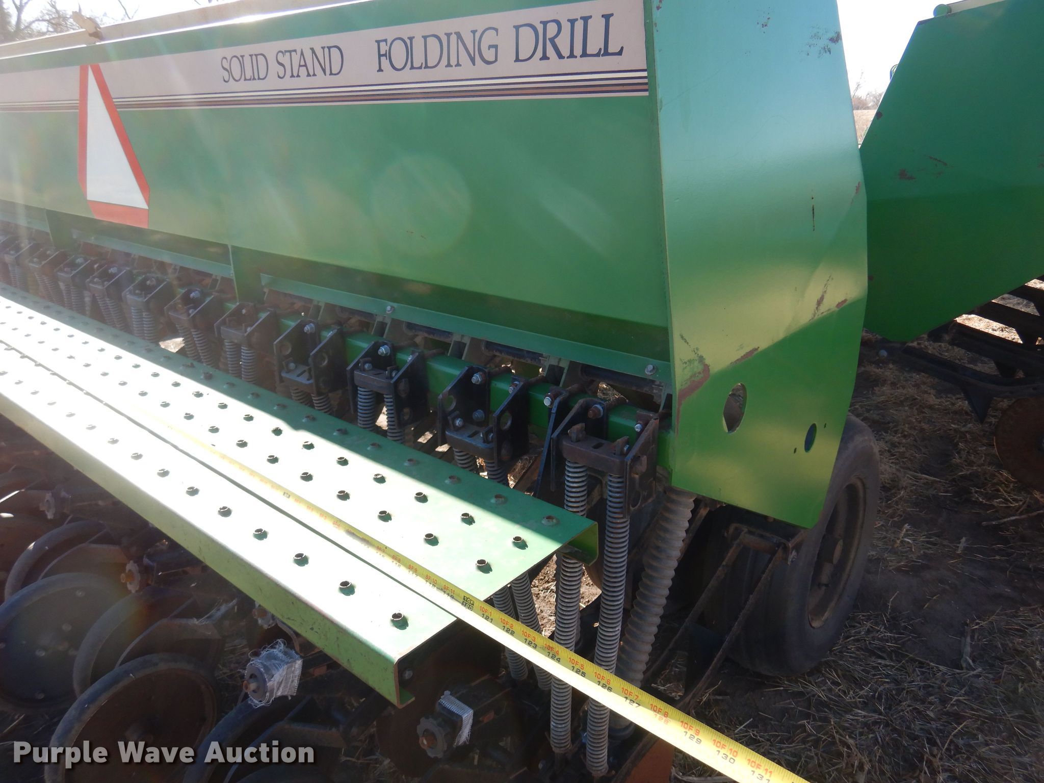 Great Plains Solid Stand 30 grain drill. Width: 30', Row units: 45, Row spacing: 8", Serial: GP-1208. Features Frame Marker arm, Hydraulic fold Front fold, Seed delivery Bulk fill system, Row units Meter drive: Ground, Down pressure: Spring, Disk openers: Double, Gauge wheels: Single, Closing system: Single Type: Rubber.. Tires Transport tire size: 9.5L-15 Quantity: 4, Drive/ outside tire size: 9.5L-15 Quantity: 4. Clarence Stroda Estate. Hope, KS 67451