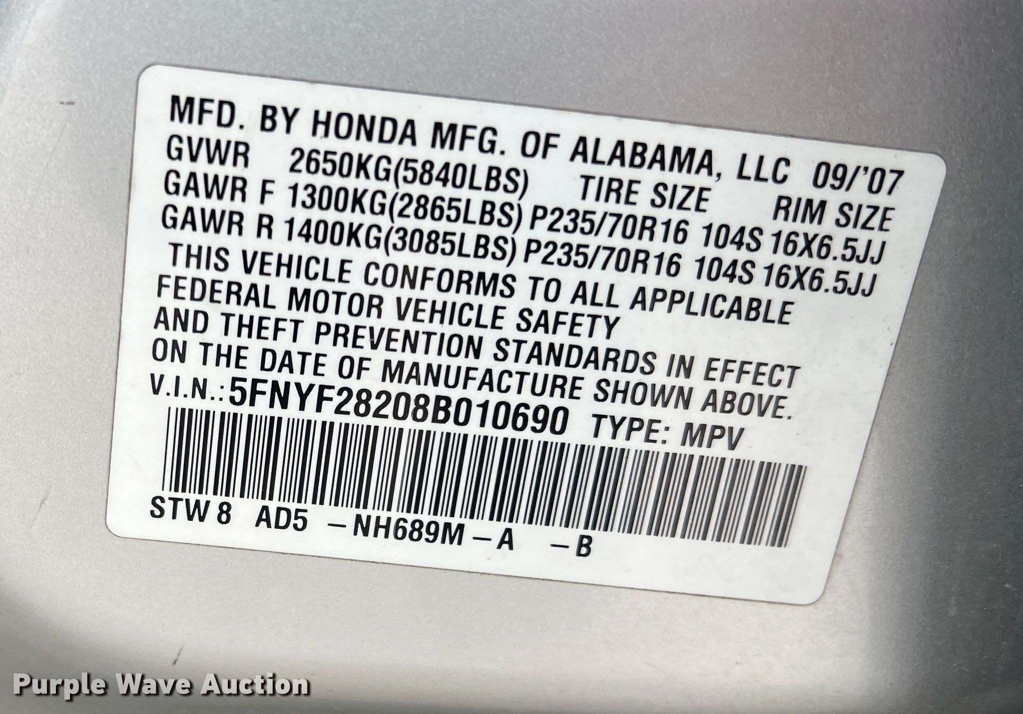 Purple Wave is selling a used Passenger Vehicle in Texas. This item is a 2008 Honda Pilot SUV with the following: Miles: 262,597 on odometer, VIN: 5FNYF28208B010690