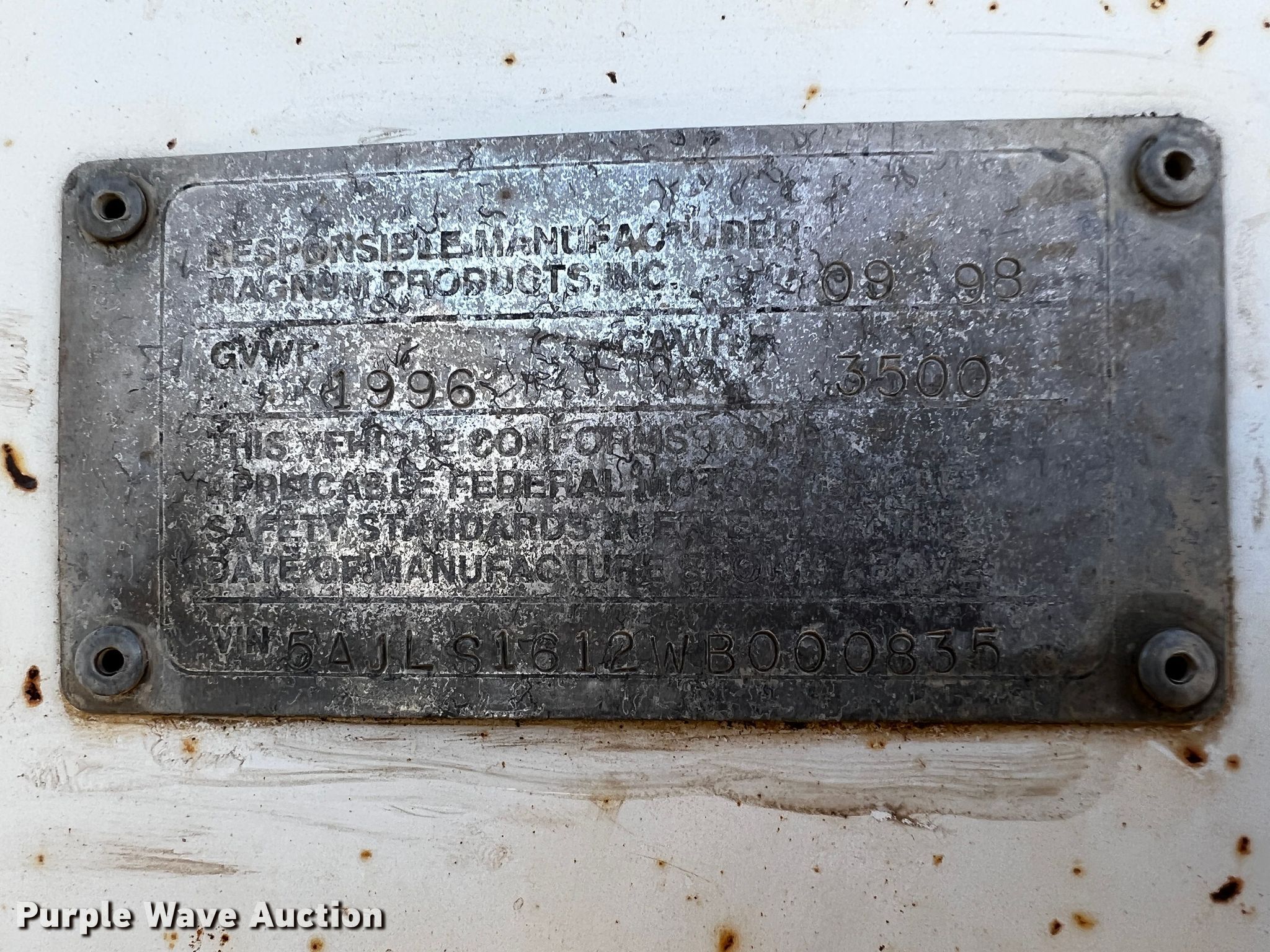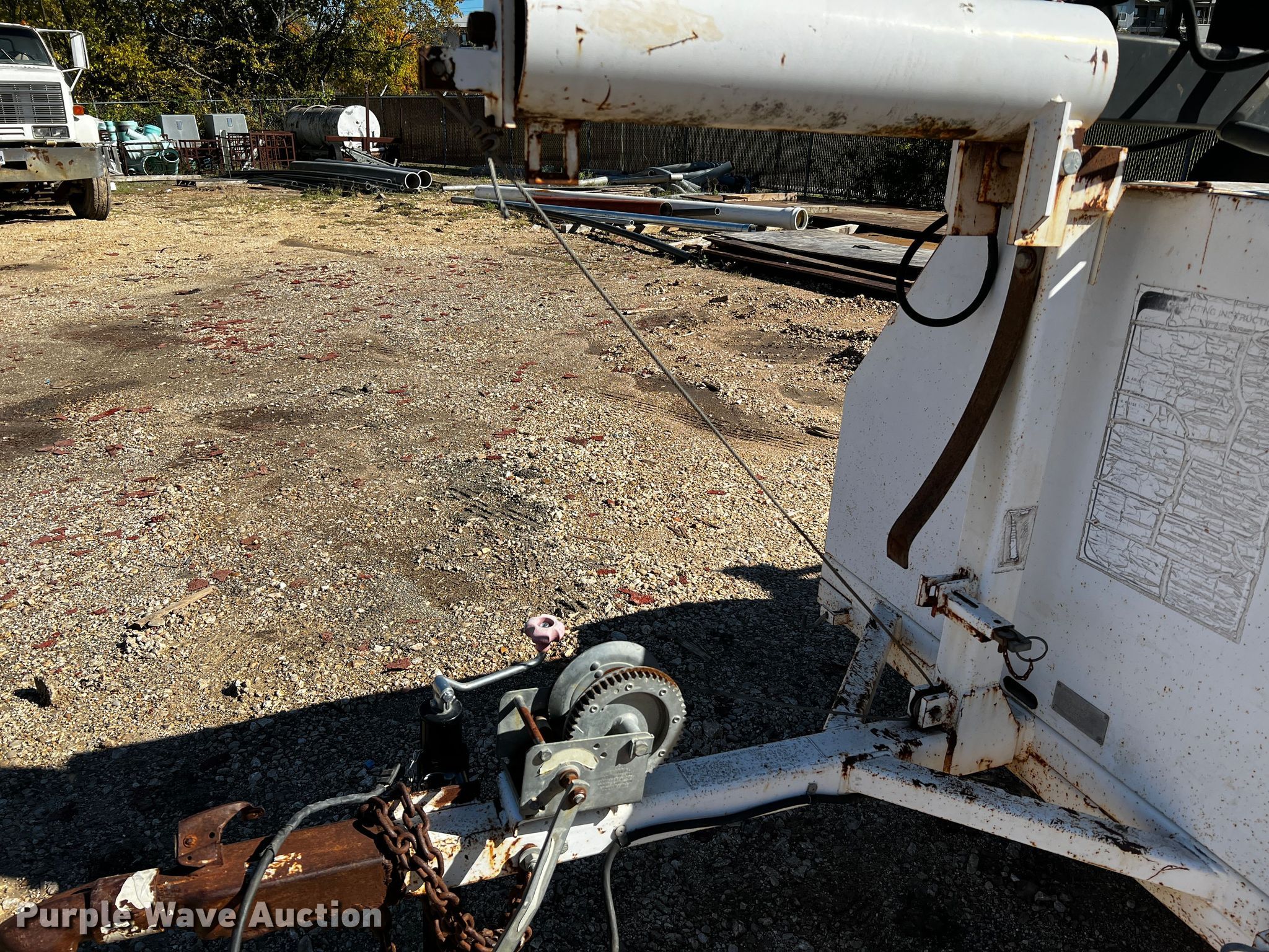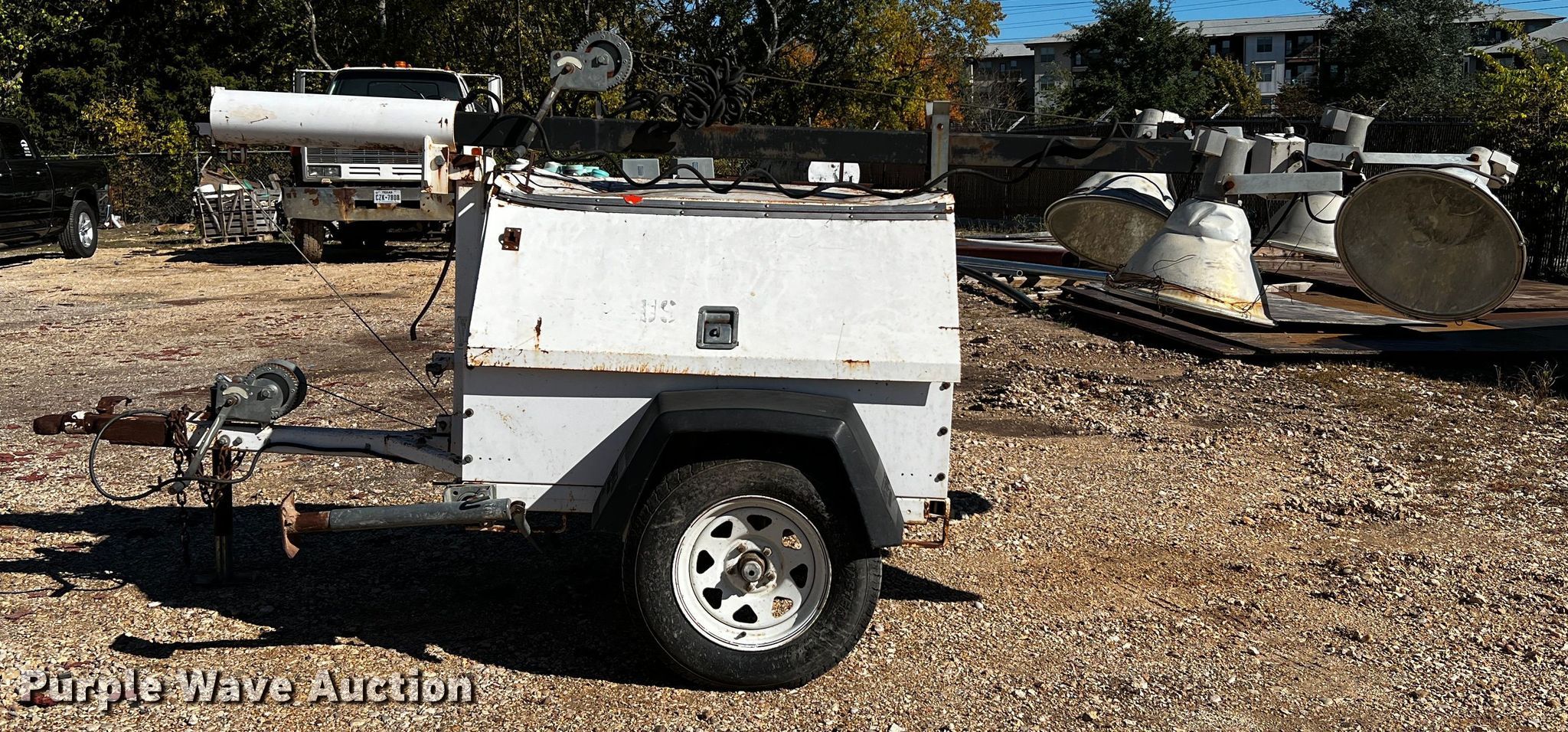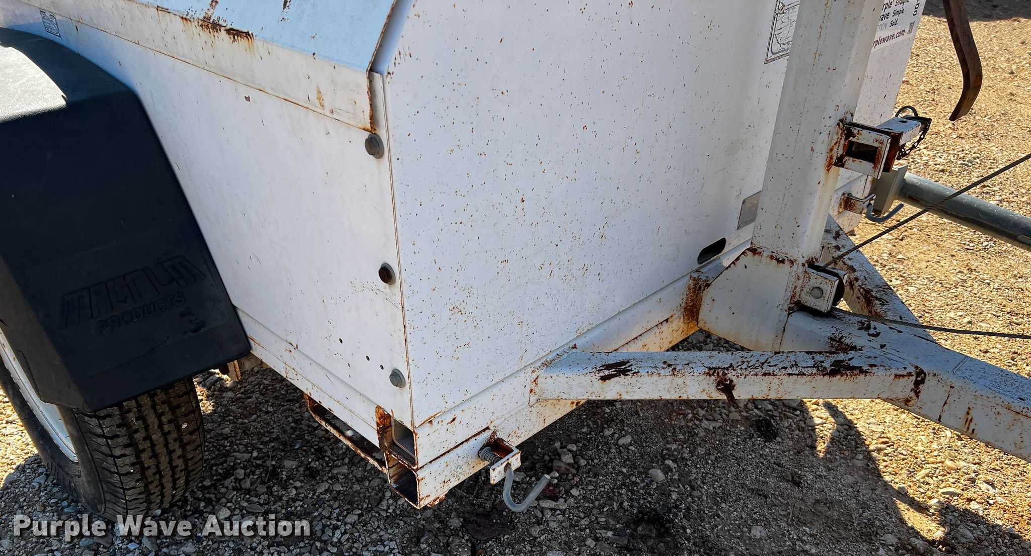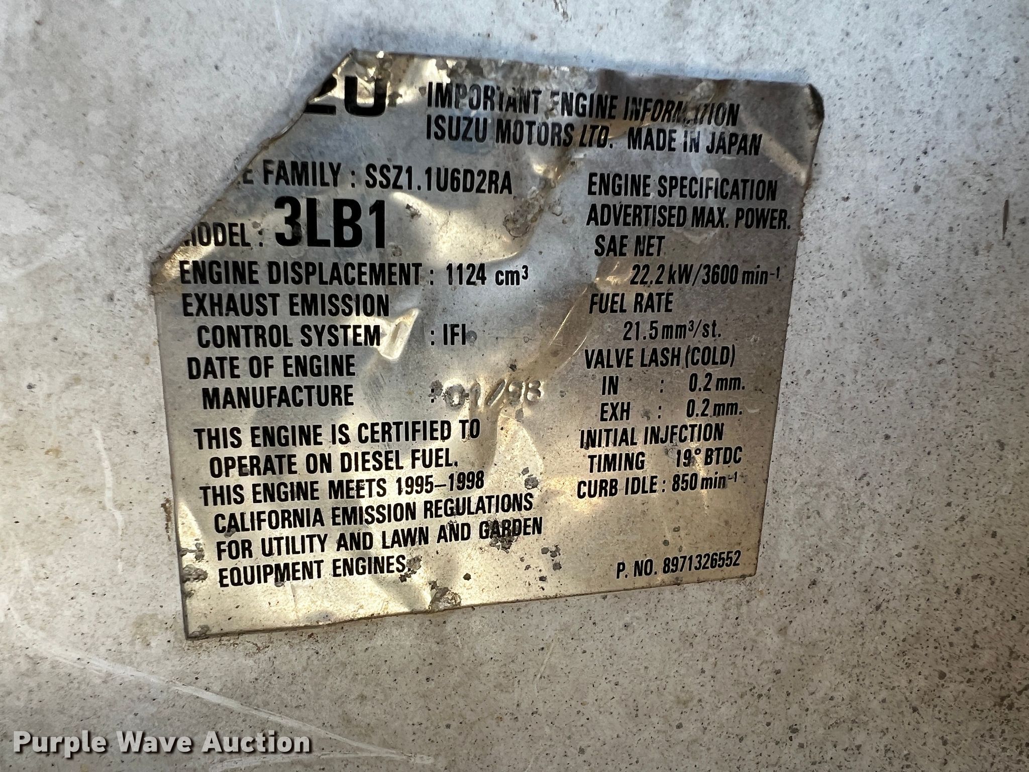 1998 Magnum 4060IMH light plant. Hours: 8,223 on meter, VIN: 5AJLS1612WB000835, Serial: 98900. Engine Isuzu, Cylinders: 3, Fuel type: Diesel. Features Generator Pancake, kVA: 6, kW: 6, Phase: Single, Electric start, Fuel tank, Light plant Bulbs: 4, Watts: 1,500, Hoist: Manual. Trailer Magnum, 9' L x 68" W, Ball hitch size: 2", Suspension: Spring, Axles: Single, Tire size: 205/75R15, GAWR: 3,500 lbs. Haegelin Construction. 15311 Burnet Rd. Austin, TX 78727