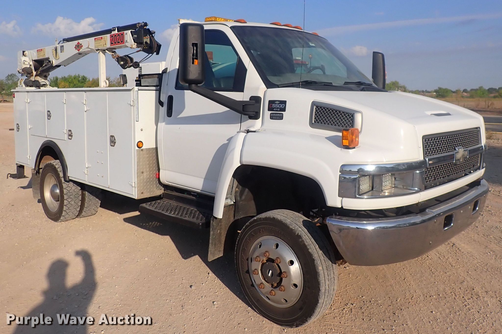 2008 Chevrolet C5500 utility / service truck. Miles: 211,196 on odometer, VIN: 1GBE5C3998F406262. Engine Displacement: 6.6L, Cylinders: 8, Fuel type: Diesel. Transmission Automatic. Chassis Four wheel drive, Axles: Single, Suspension: Spring, Brakes: Hydraulic, GVWR: 19,500 lbs. Interior AC, Heat, Power windows, Power locks, Cruise control. Features Bed 11' L x 88" W, Air compressor, Crane IMT 2020, Maximum boom length: 20' Maximum lift capacity: 5,000 lbs.. Tires Size: 245/75R19.5. Notes Dash warning indicator: Check engine, ABS. Kansas title. Vermeer Great Plains. Goddard, KS 67052