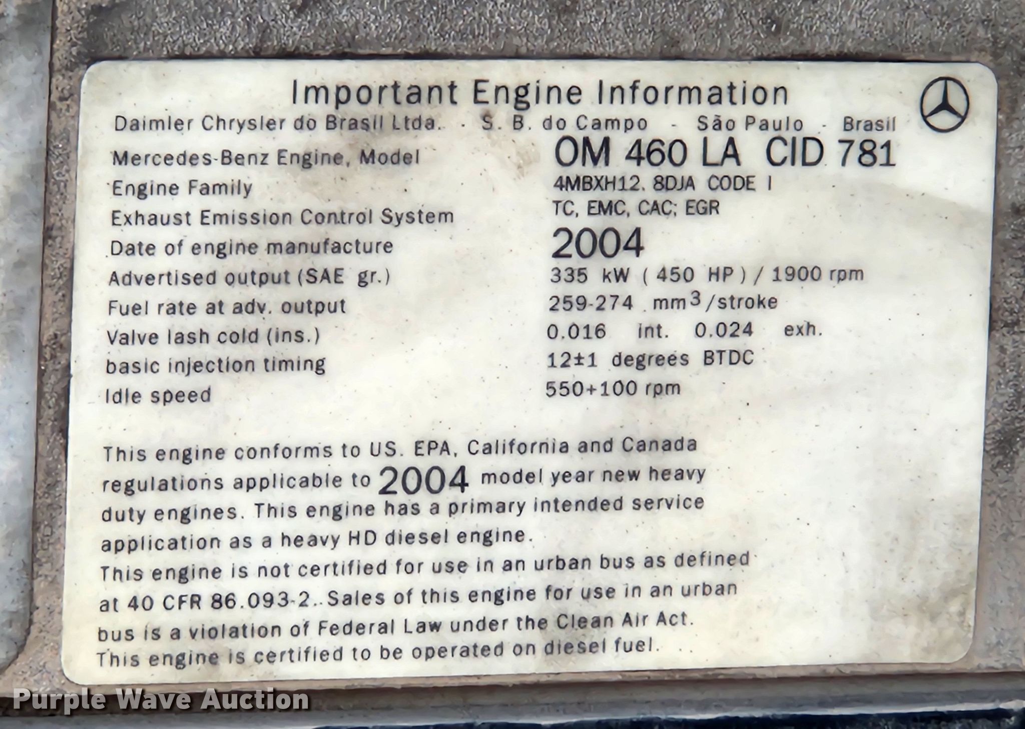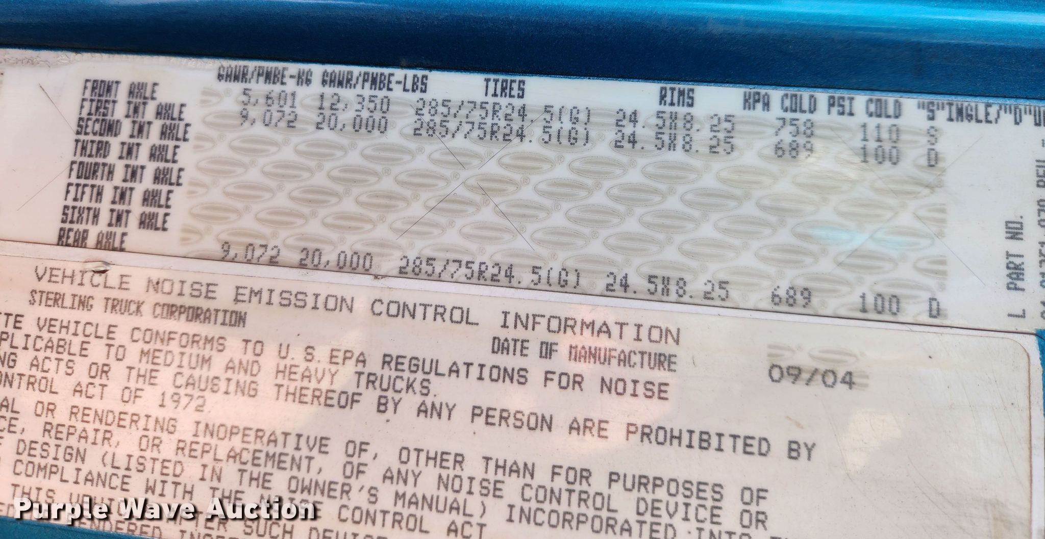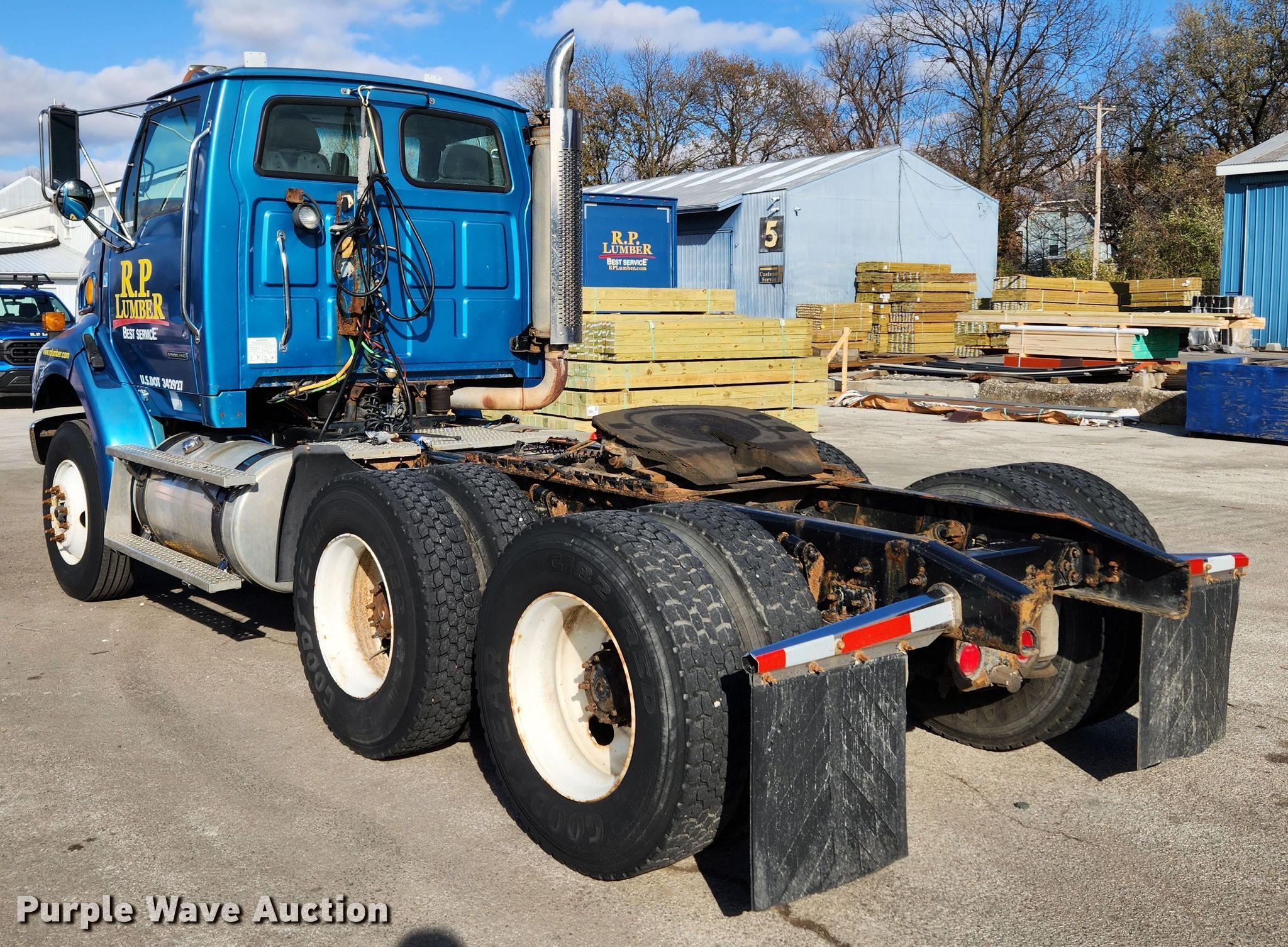 2005 Sterling LT9500 semi truck. Miles: 11,167 on odometer, Hours: 12,074 on meter, VIN: 2FWJAZCV75AN74880, Unit #: 6001. Engine Mercedes Benz, Displacement: 12.0L, Cylinders: 6, Fuel type: Diesel, Engine brake. Transmission Manual, Speed: 10. Chassis Axles: Tandem, Differential lock: Inter-axle, Suspension: Air, Brakes: Air, Truck chassis: 13' 6", GVWR: 52,350 lbs FAWR: 12,350 lbs, IAWR: 20,000 lbs, RAWR: 20,000 lbs. Interior AC, Heat, Heated mirrors, Power windows, Power locks, Cruise control. Features Deck plate: Aluminum, Fifth wheel type: Air operated, Sliding, Fuel tank: Dual. Tires Size: 11R22.5. Illinois title. Title distribution may be delayed up to 14 days from verification of funds. Mileage has not been verified. Exempt will be written in the odometer disclosure on the title. R.P. Lumber Co., Inc.. Edwardsville, IL 62025